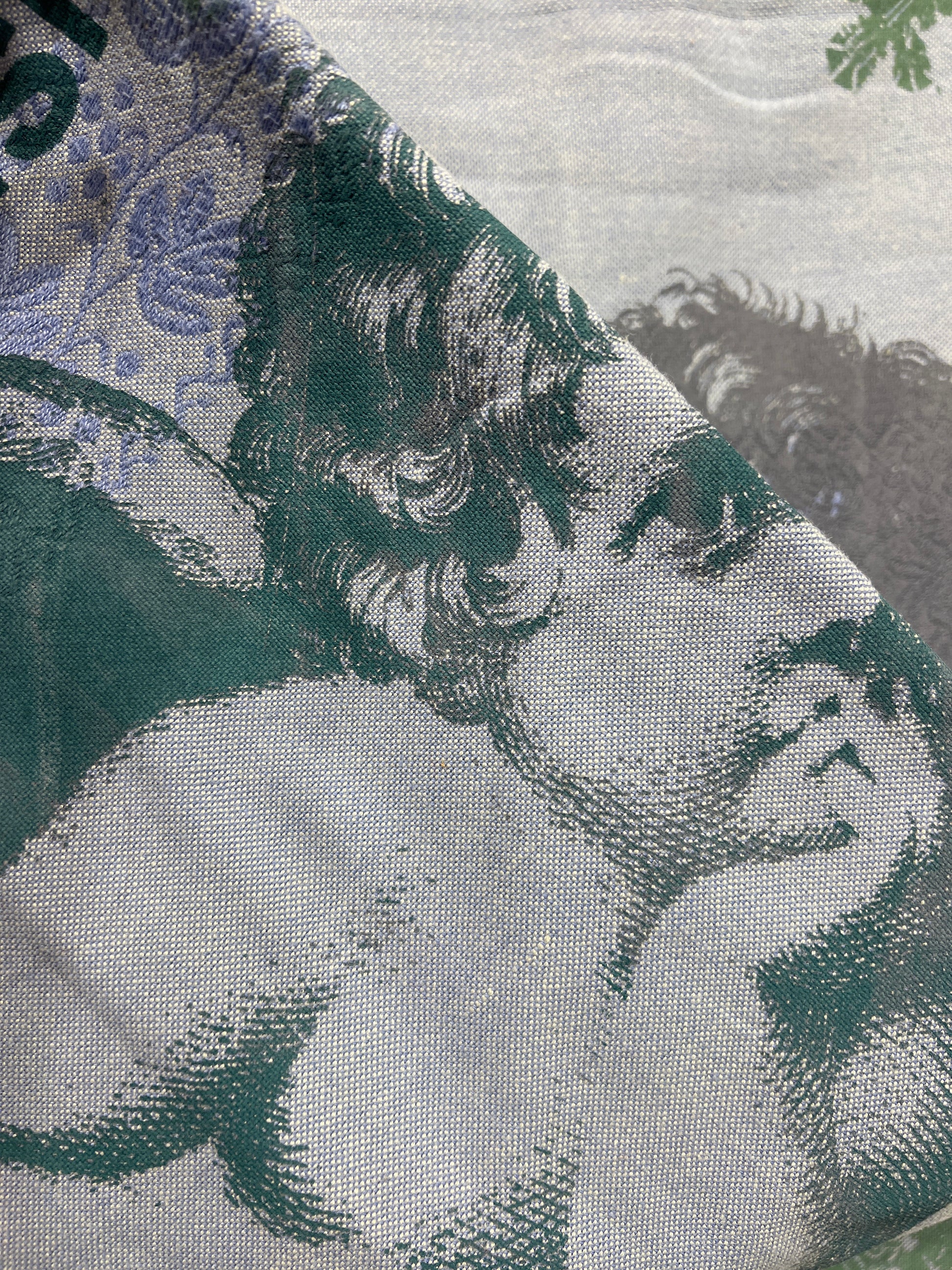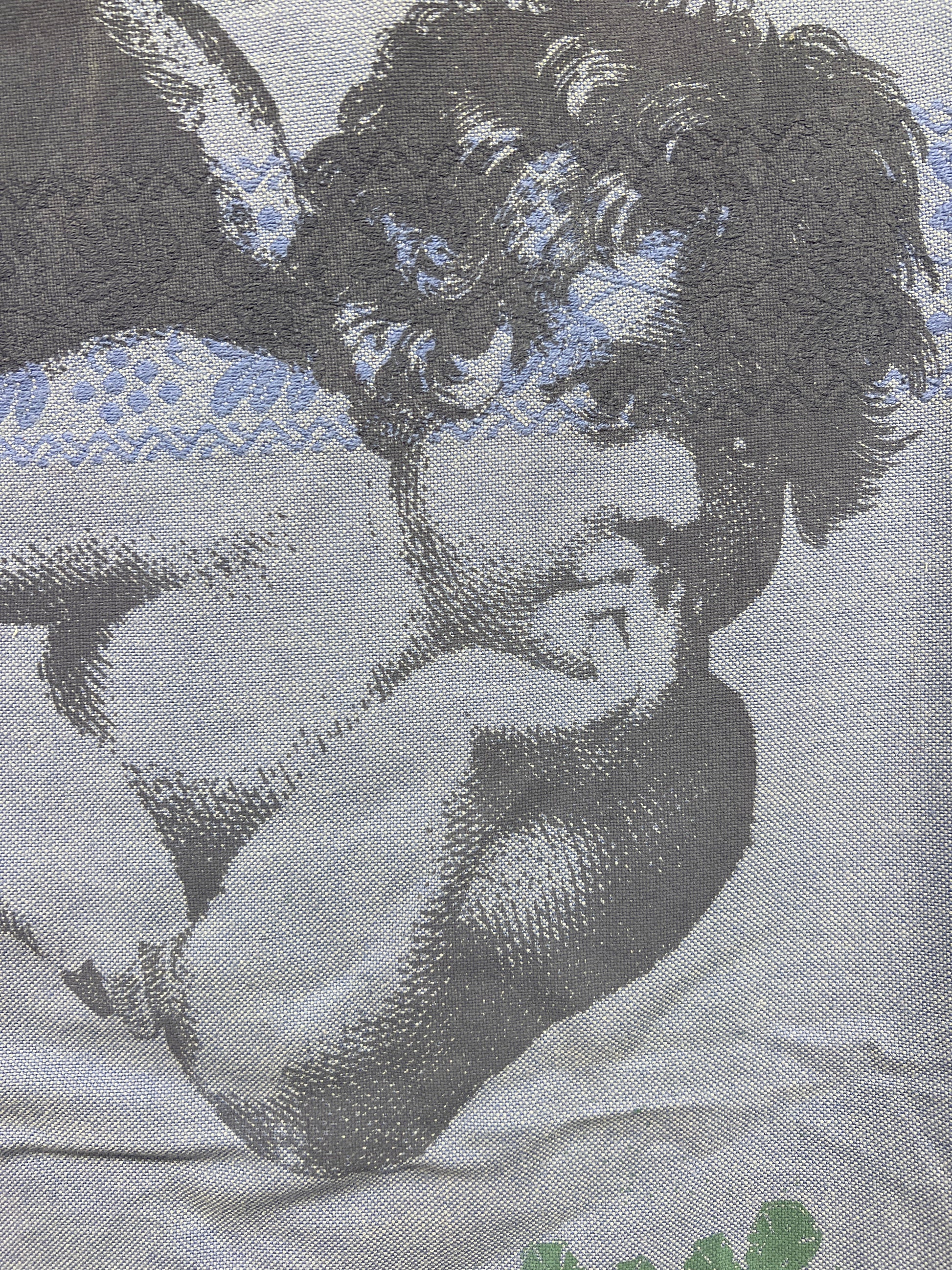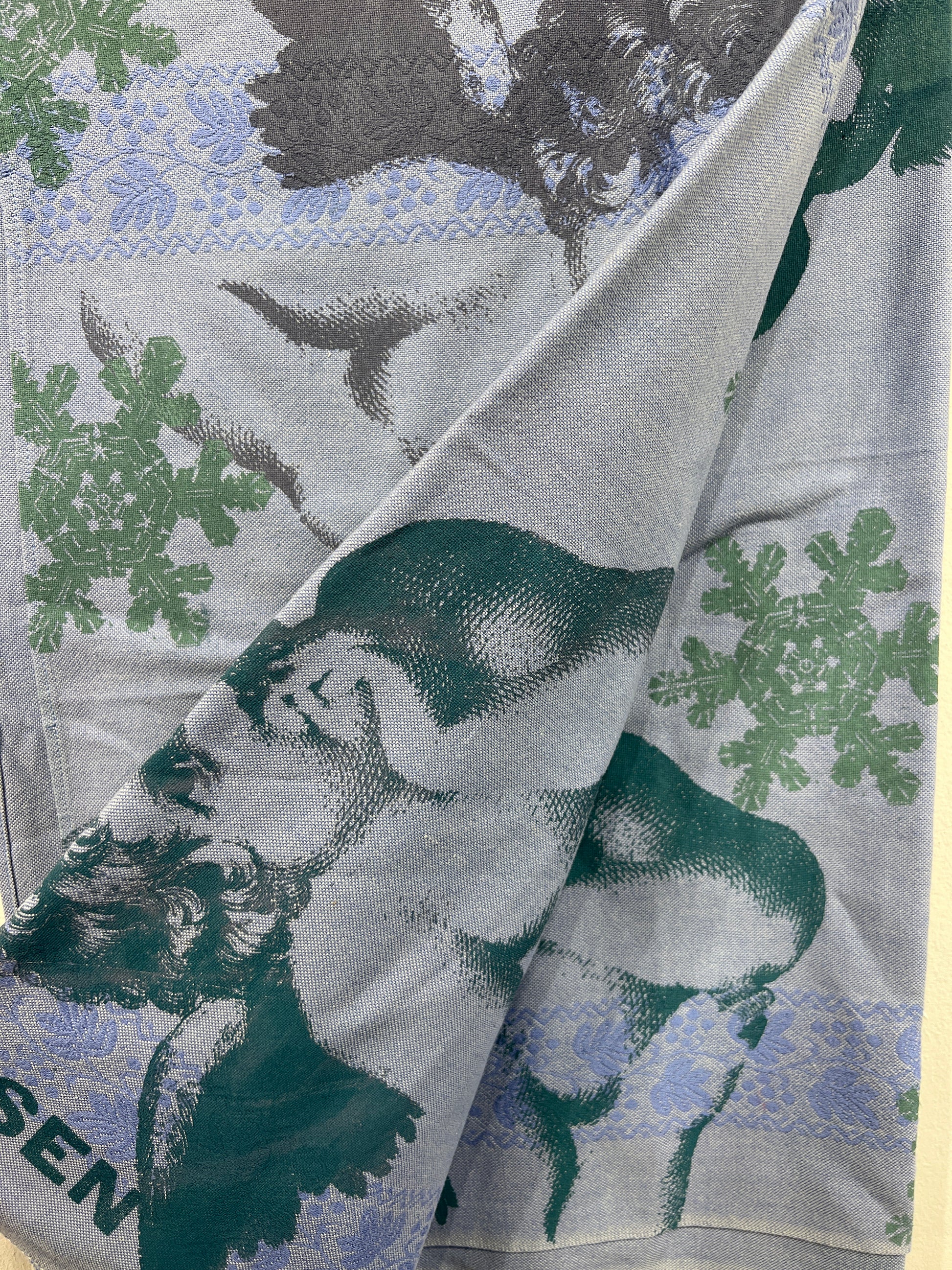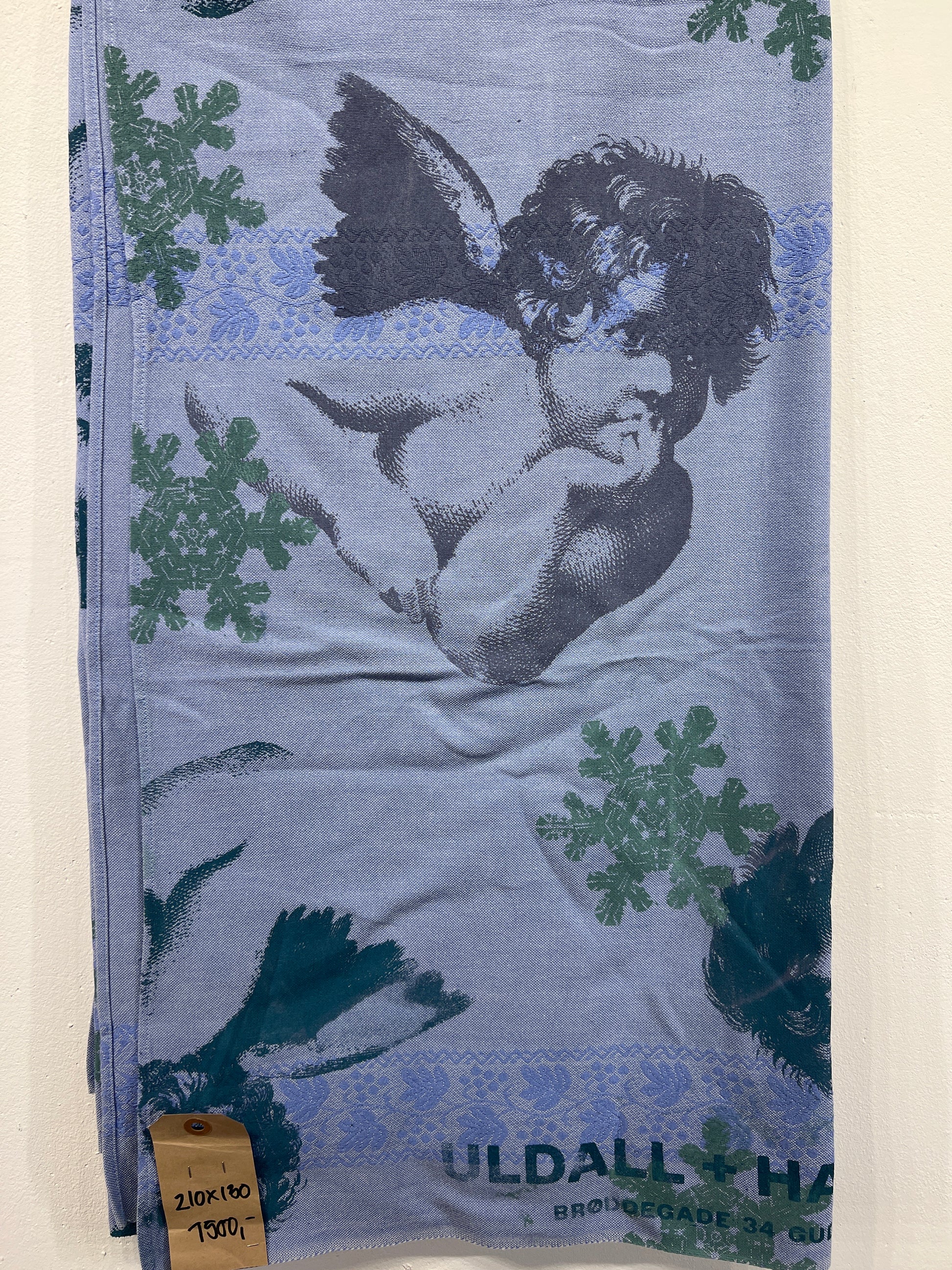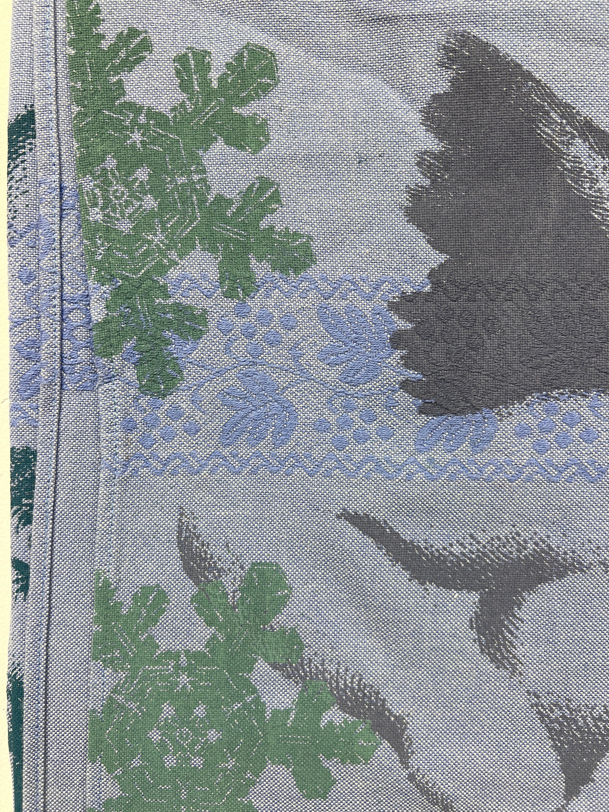 Håndtrykt dug med smukke motiver. Trykt på bomuld, der tåler vask på 40 -60 grader. Efter først at have stryget den, på højste varme.
