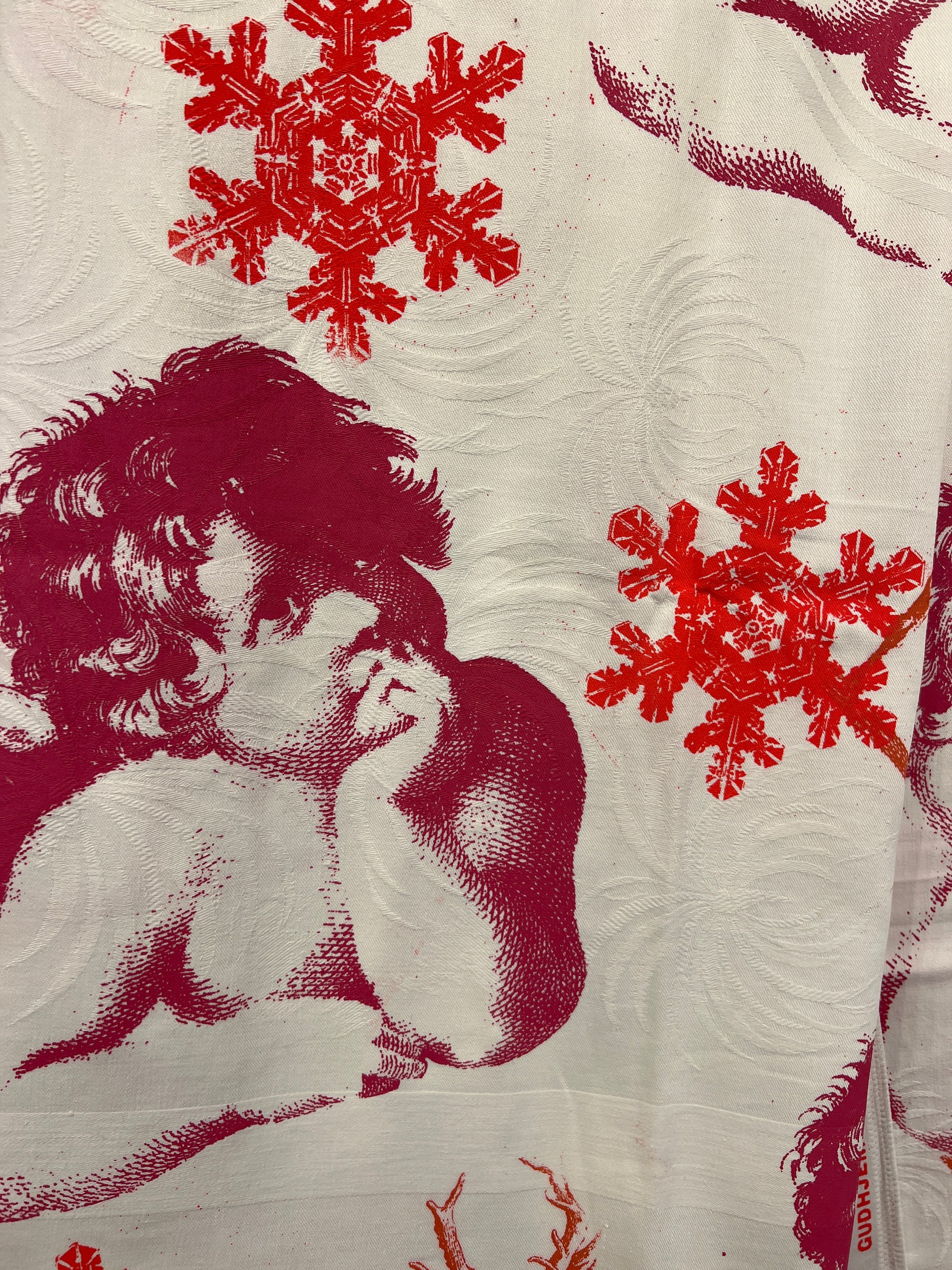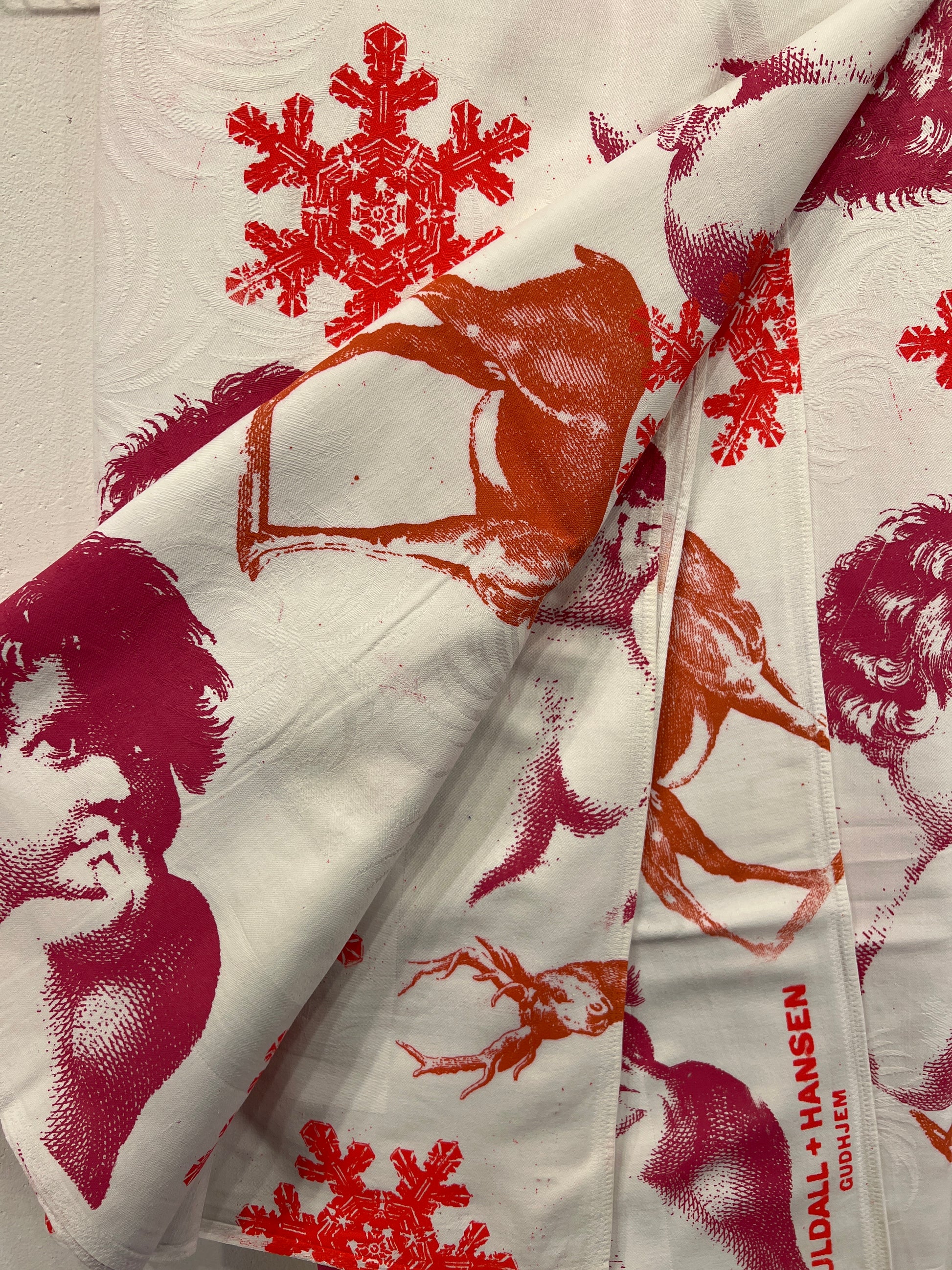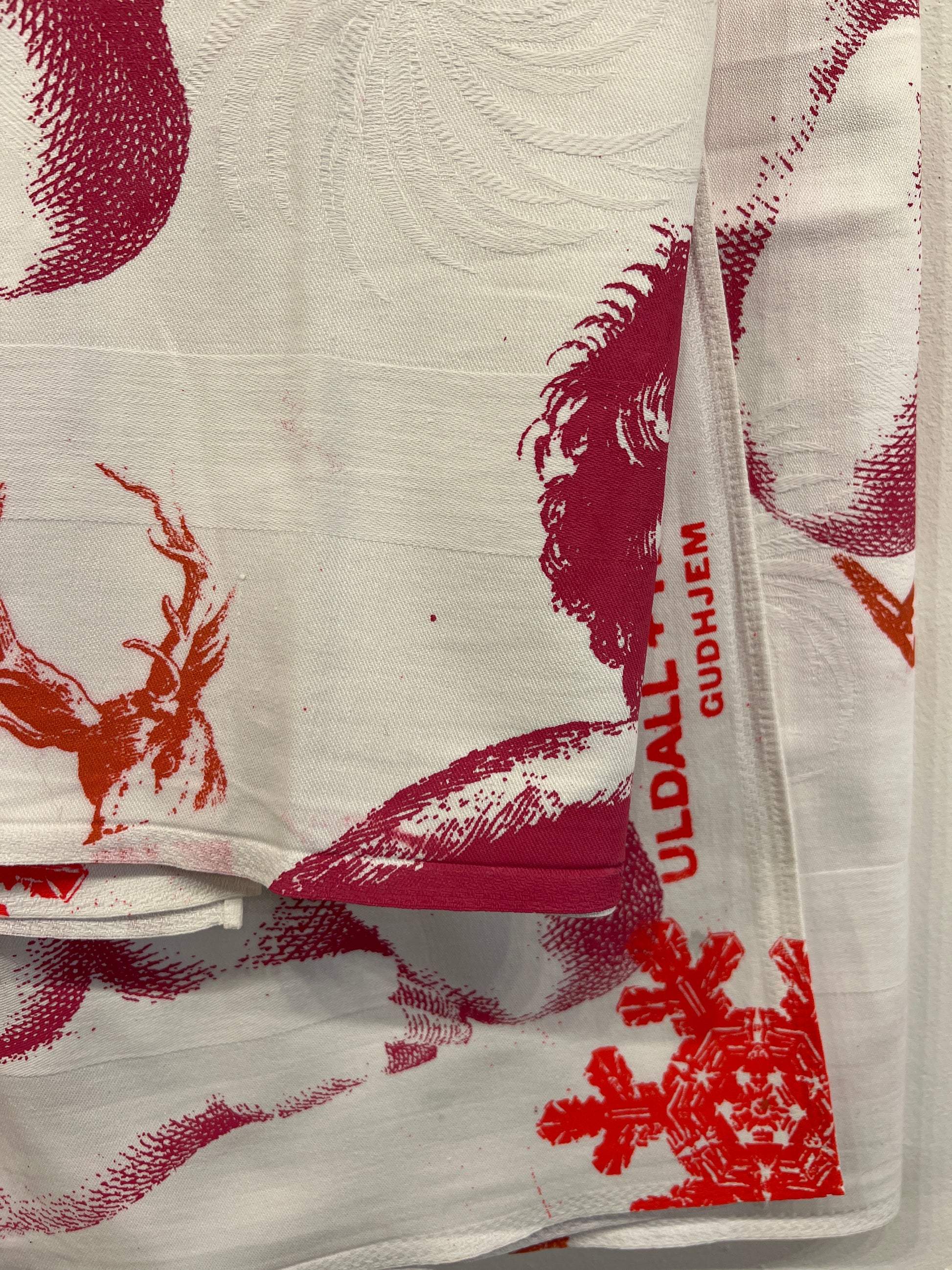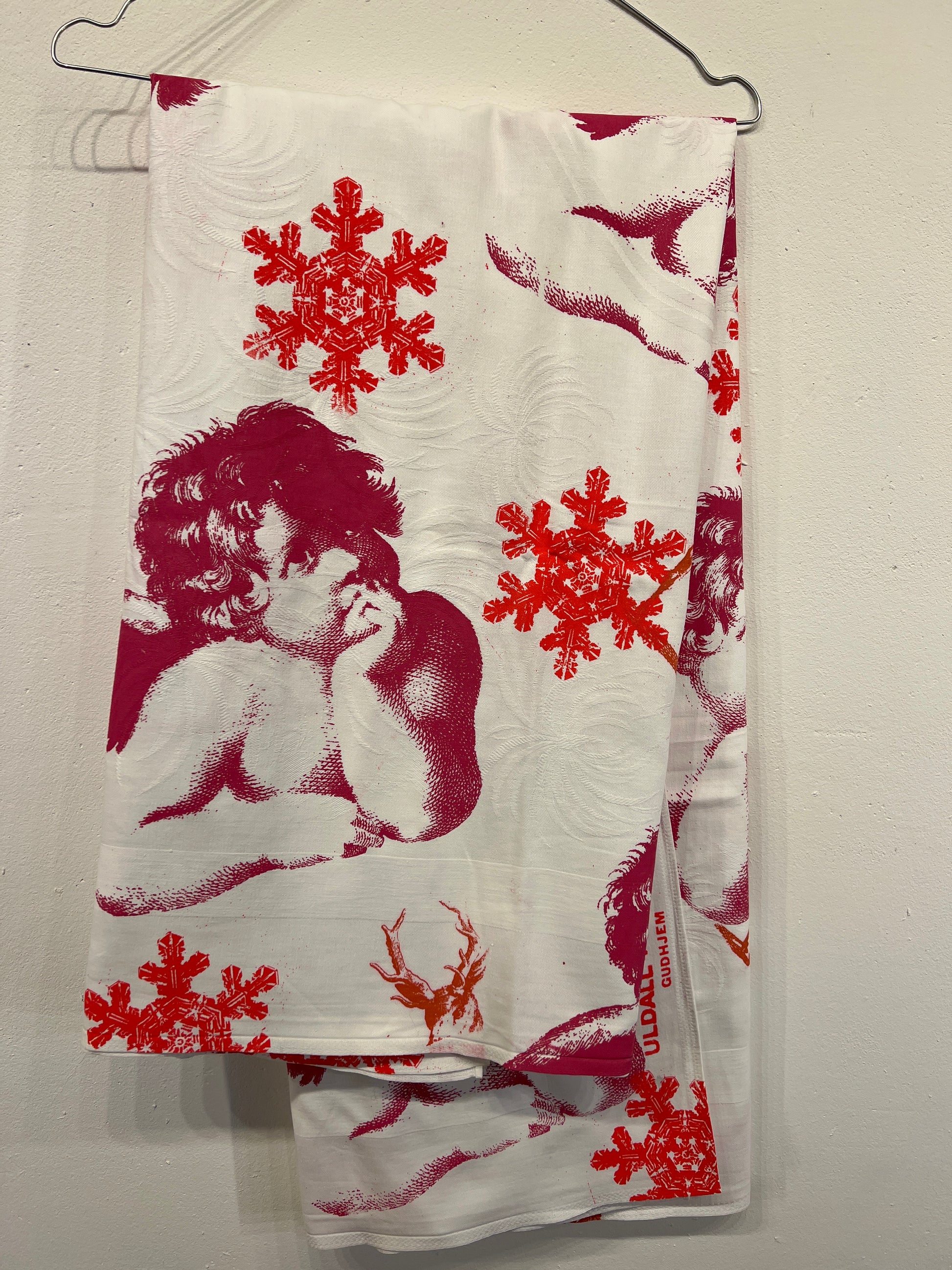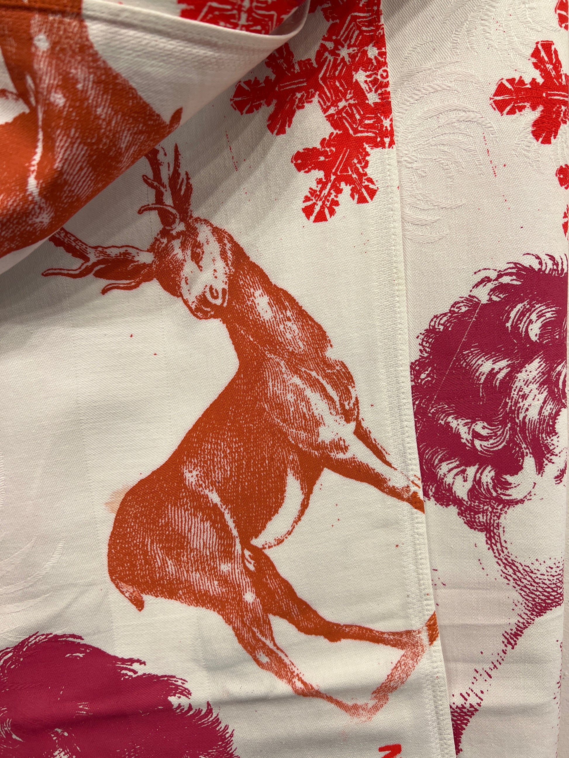 Håndtrykt dug med smukke motiver. Trykt på bomuld, der tåler vask på 40 -60 grader. Efter først at have stryget den, på højste varme.