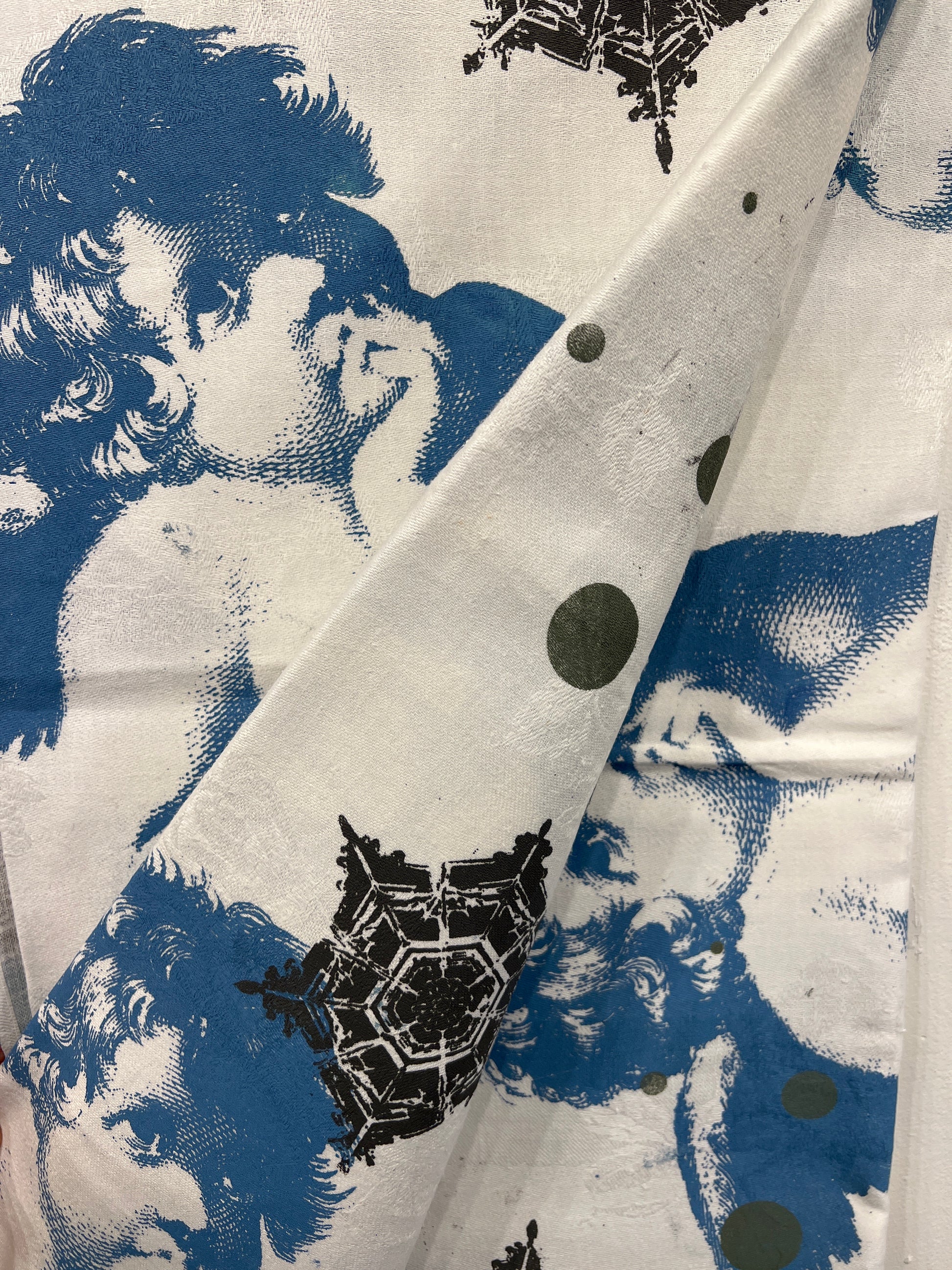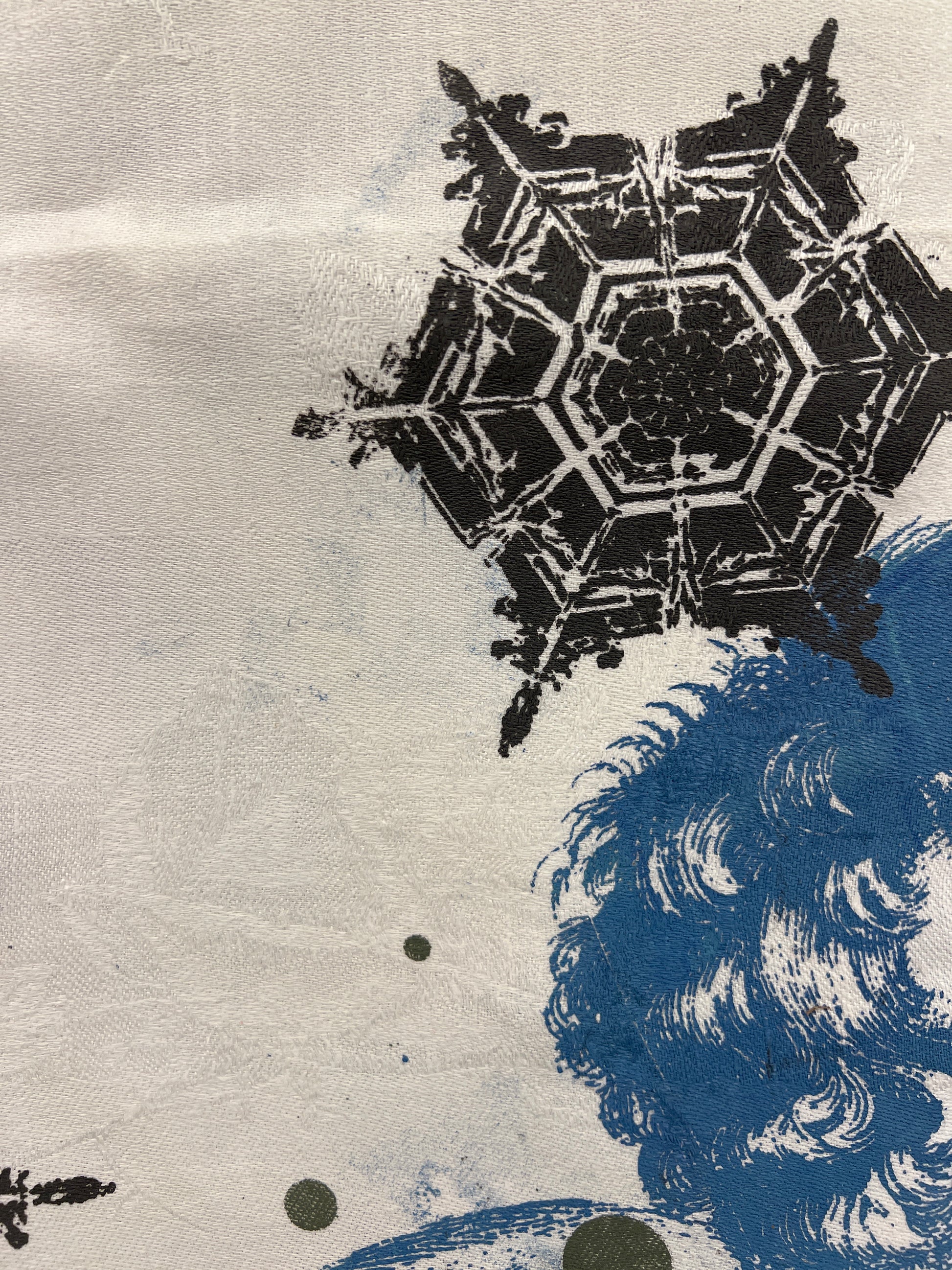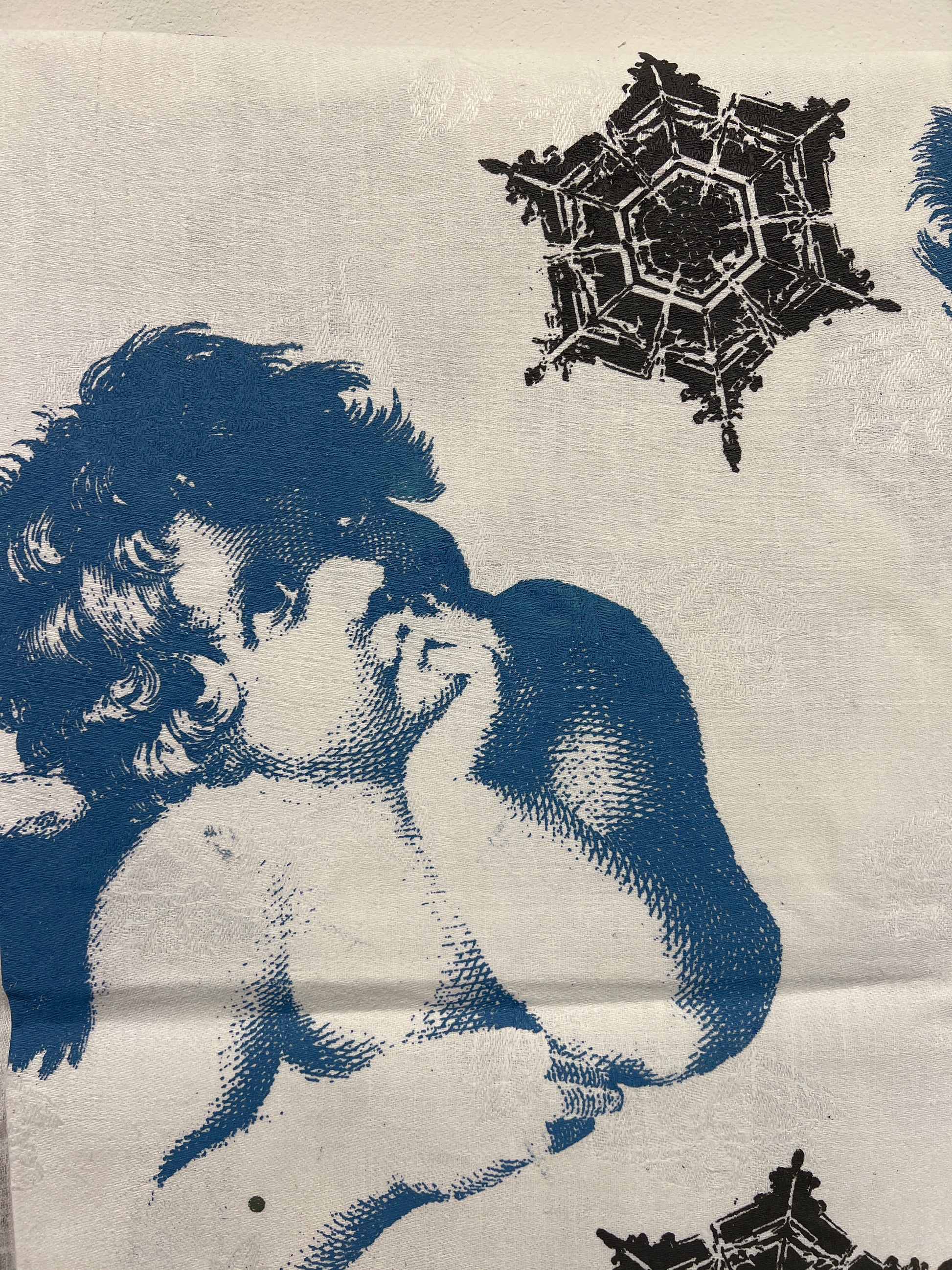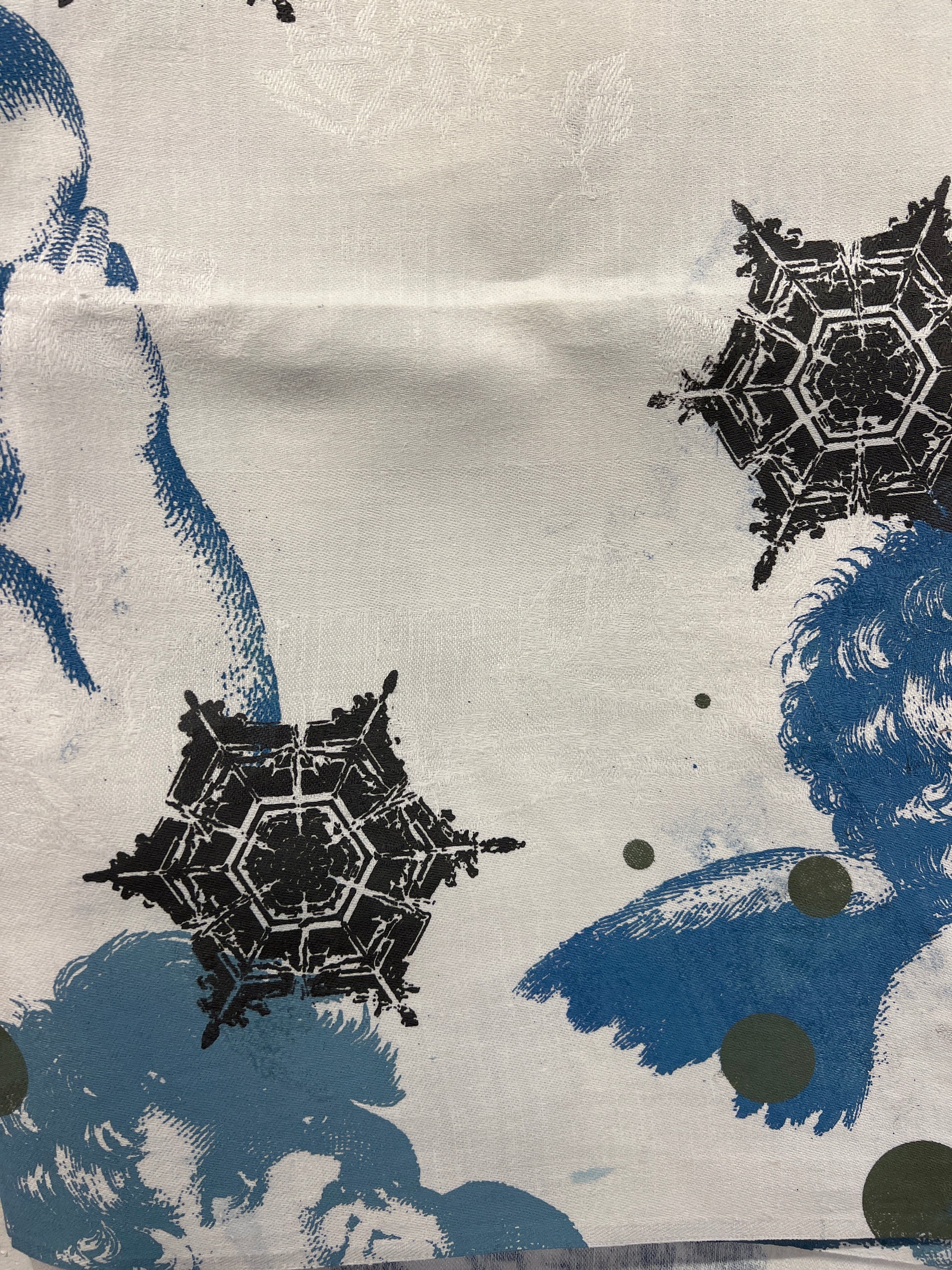 Håndtrykt dug med smukke motiver. Trykt på bomuld, der tåler vask på 40 -60 grader. Efter først at have stryget den, på højste varme.