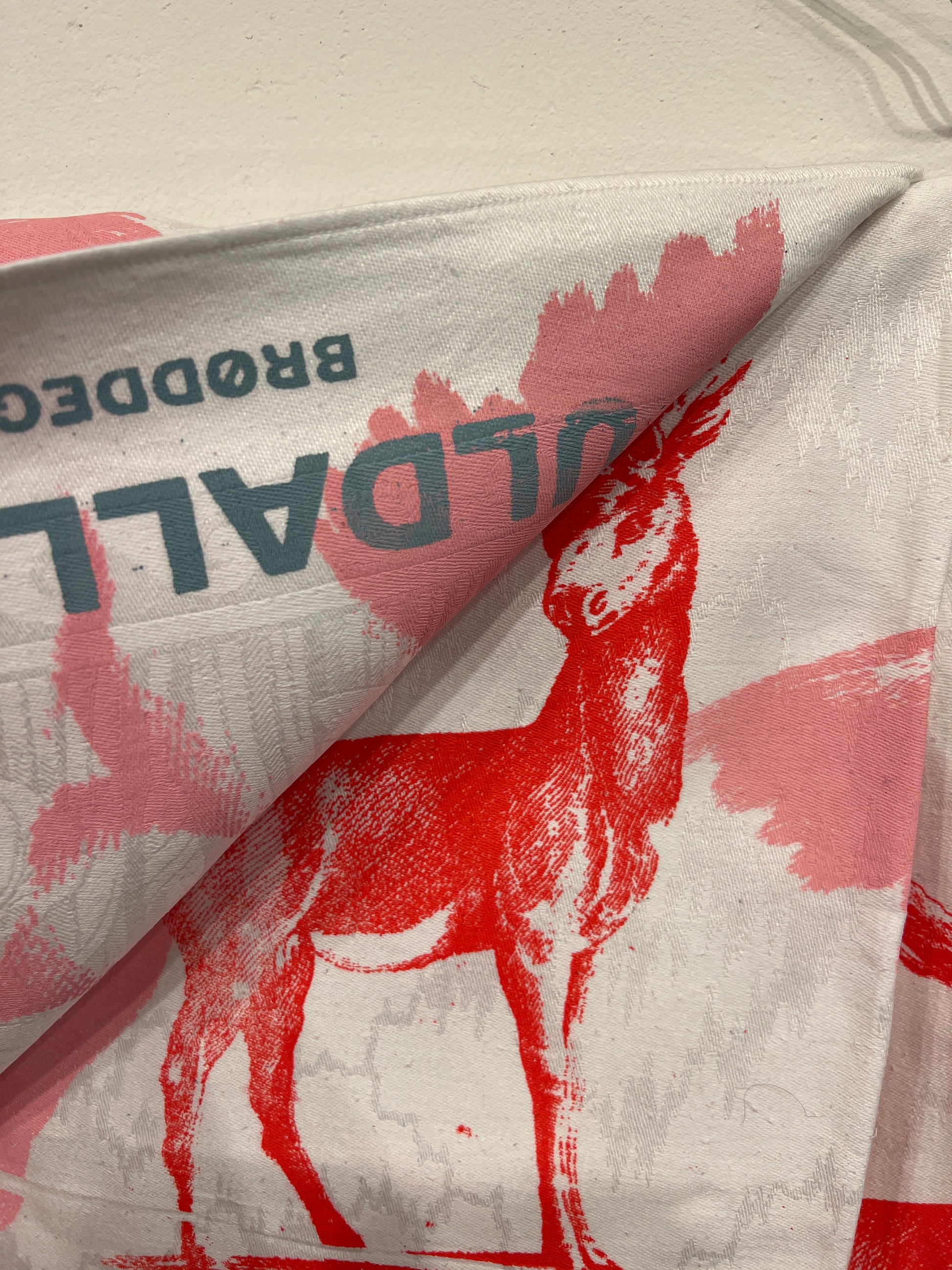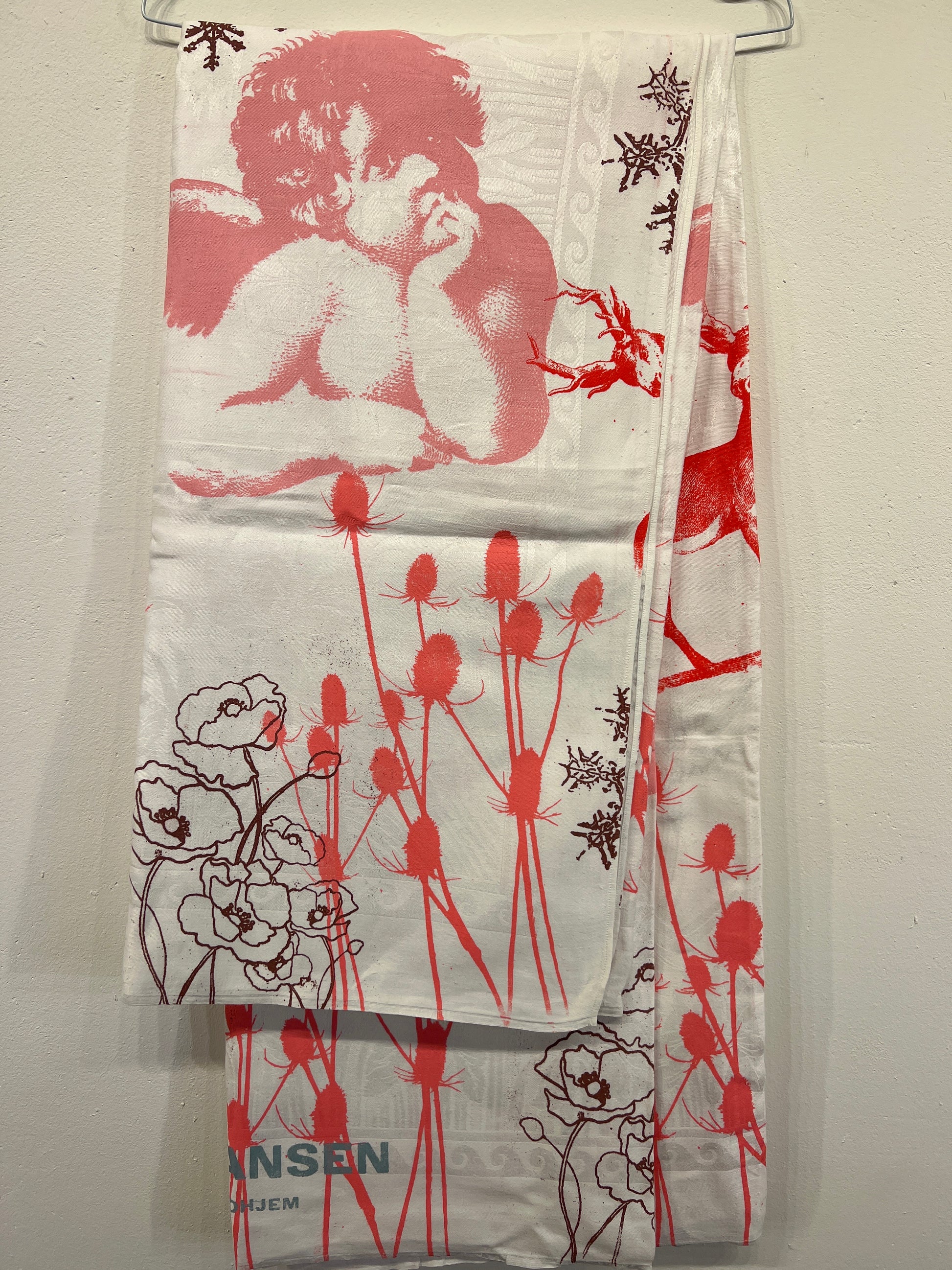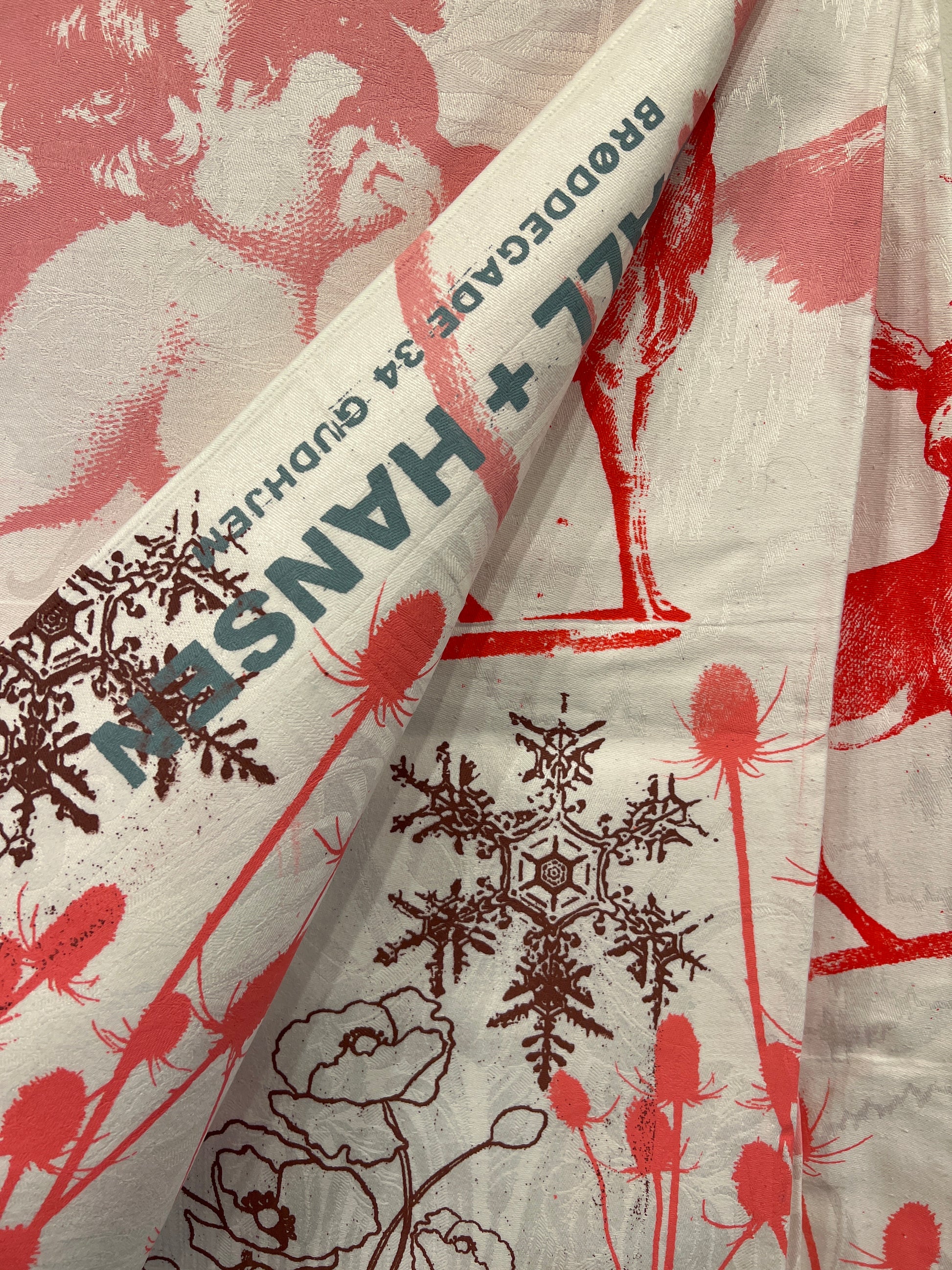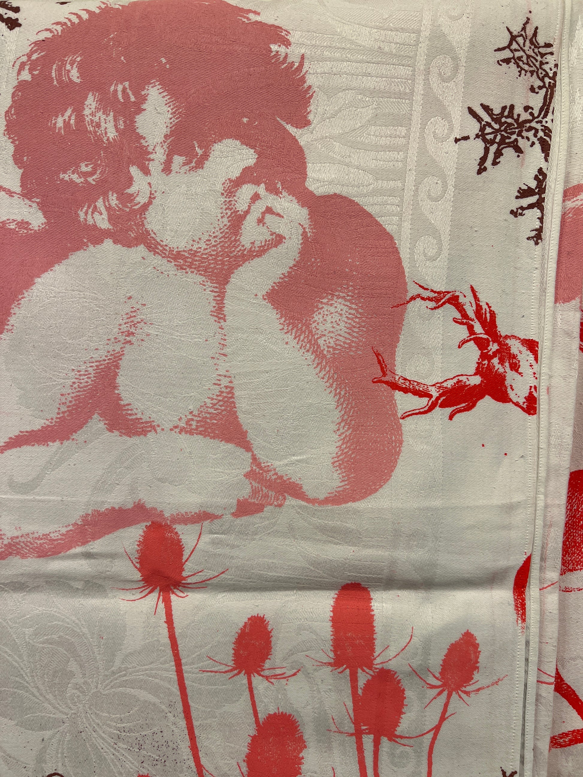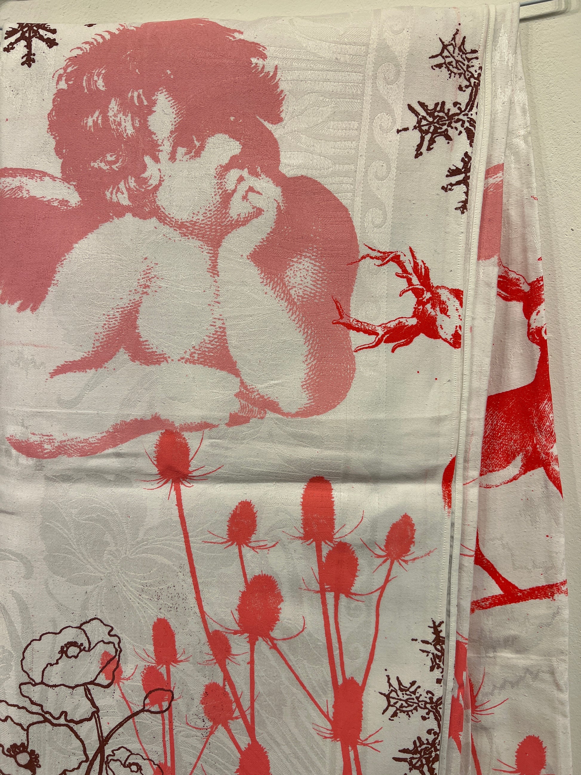 Håndtrykt dug med smukke motiver. Trykt på bomuld, der tåler vask på 40 -60 grader. Efter først at have stryget den, på højste varme.
