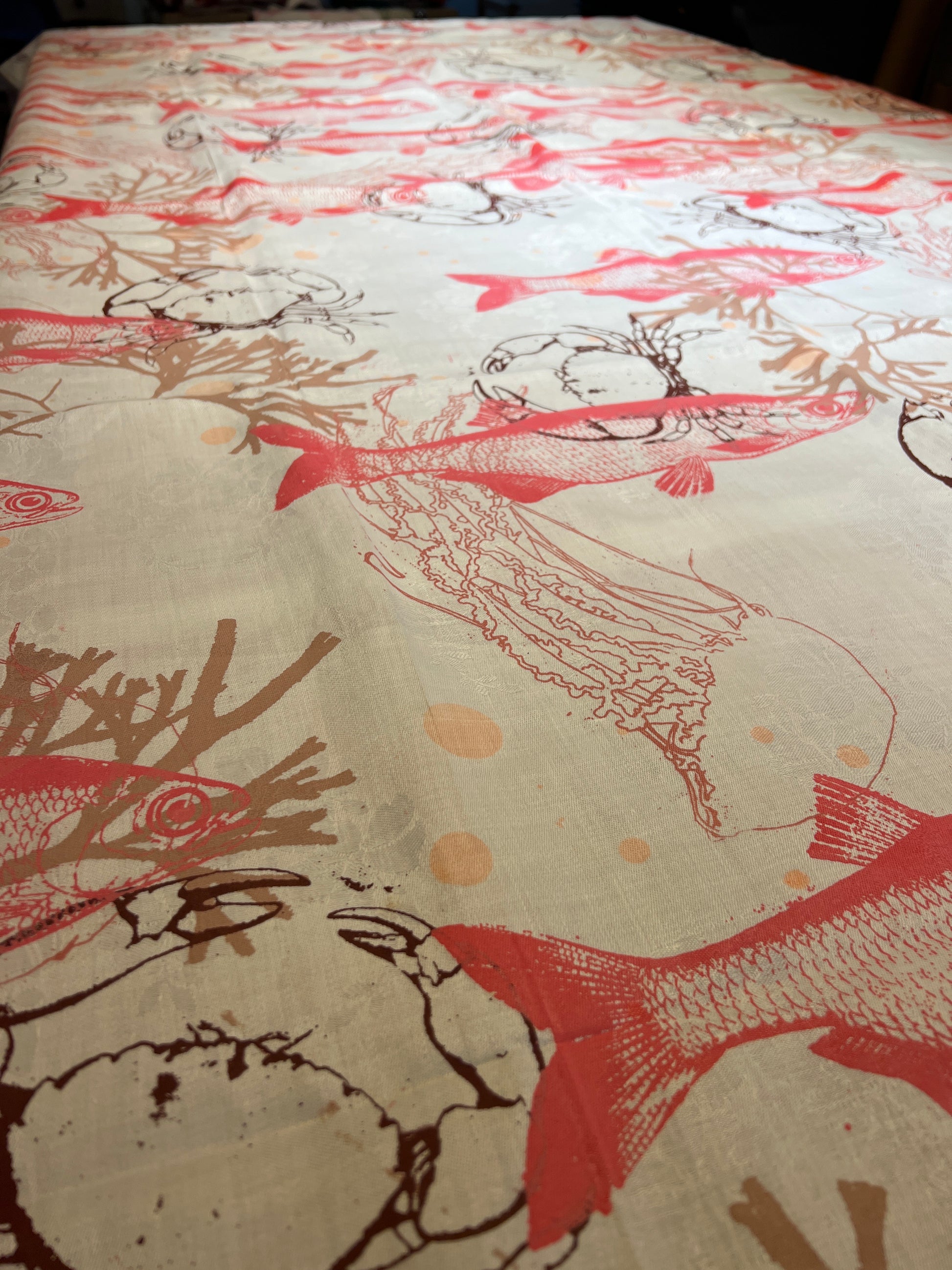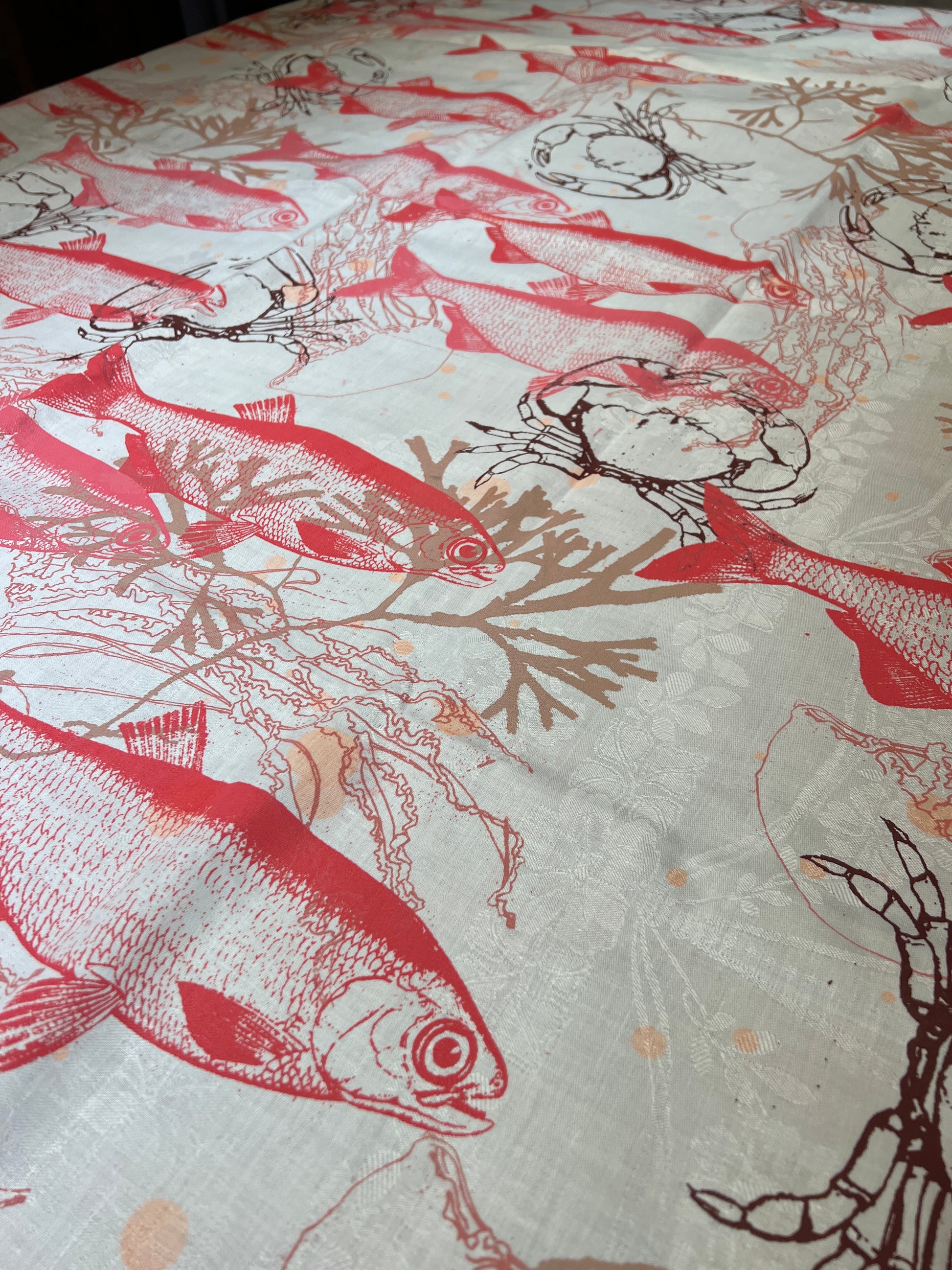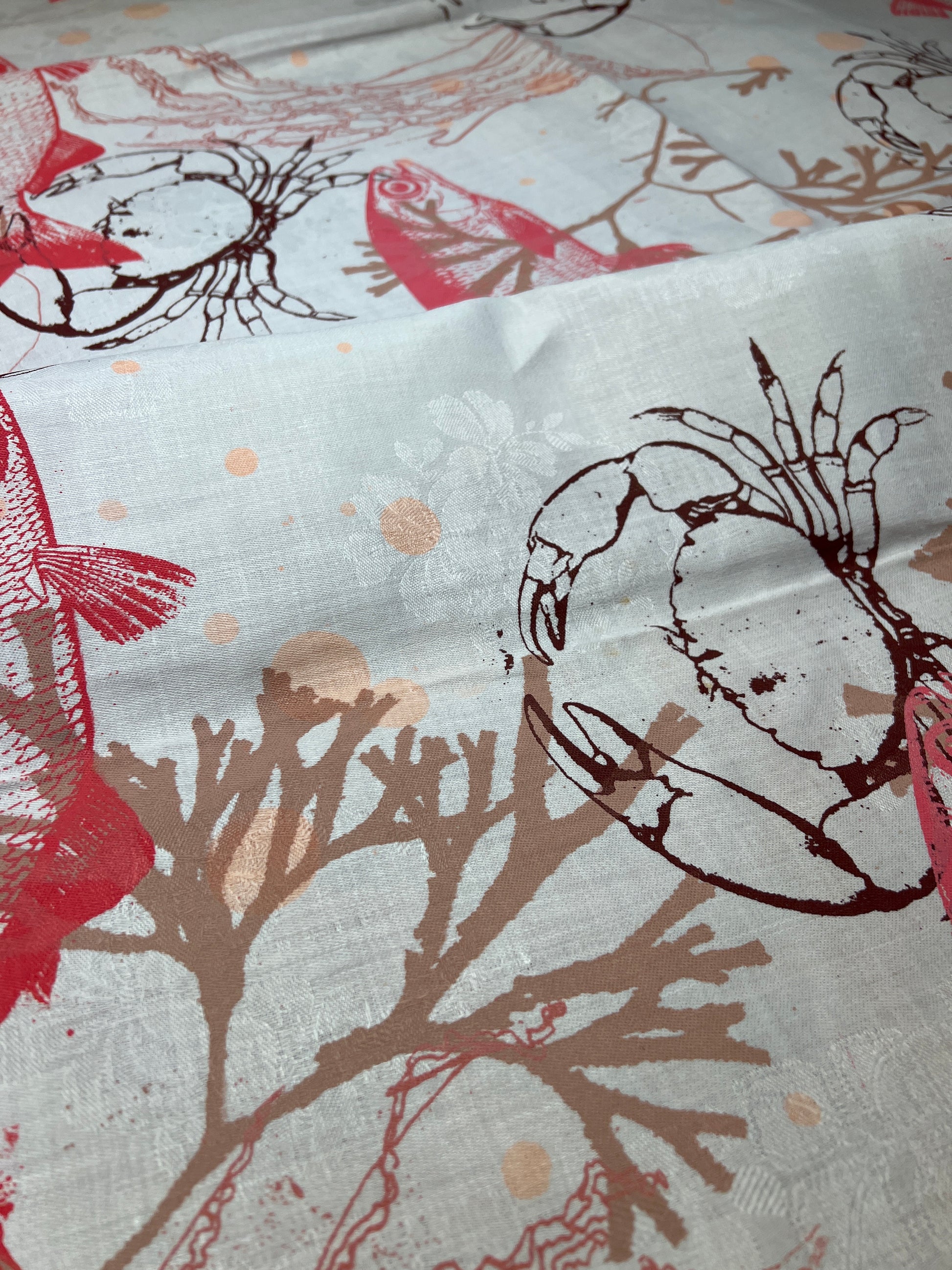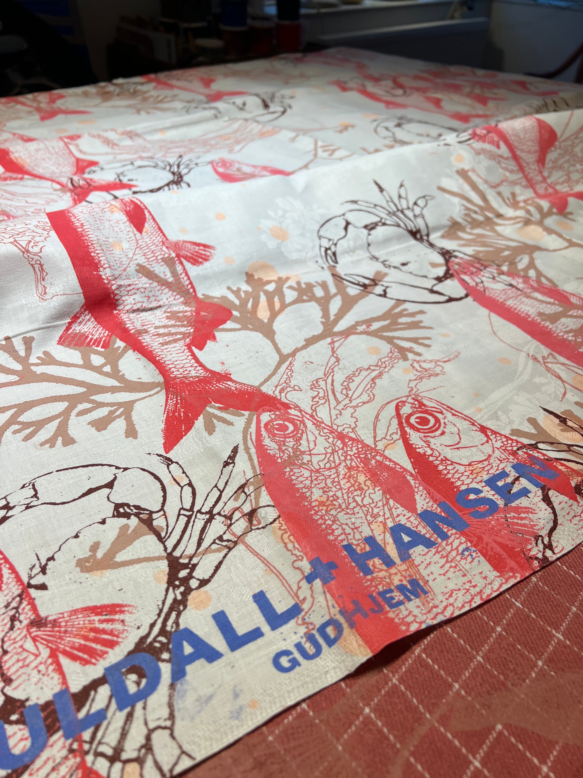 Håndtrykt dug ( gammel kvalitet s duge) med smukke motiver. Trykt på bomuld, der tåler vask på 40 -60 grader. Efter først at have stryget den, på højste varme.