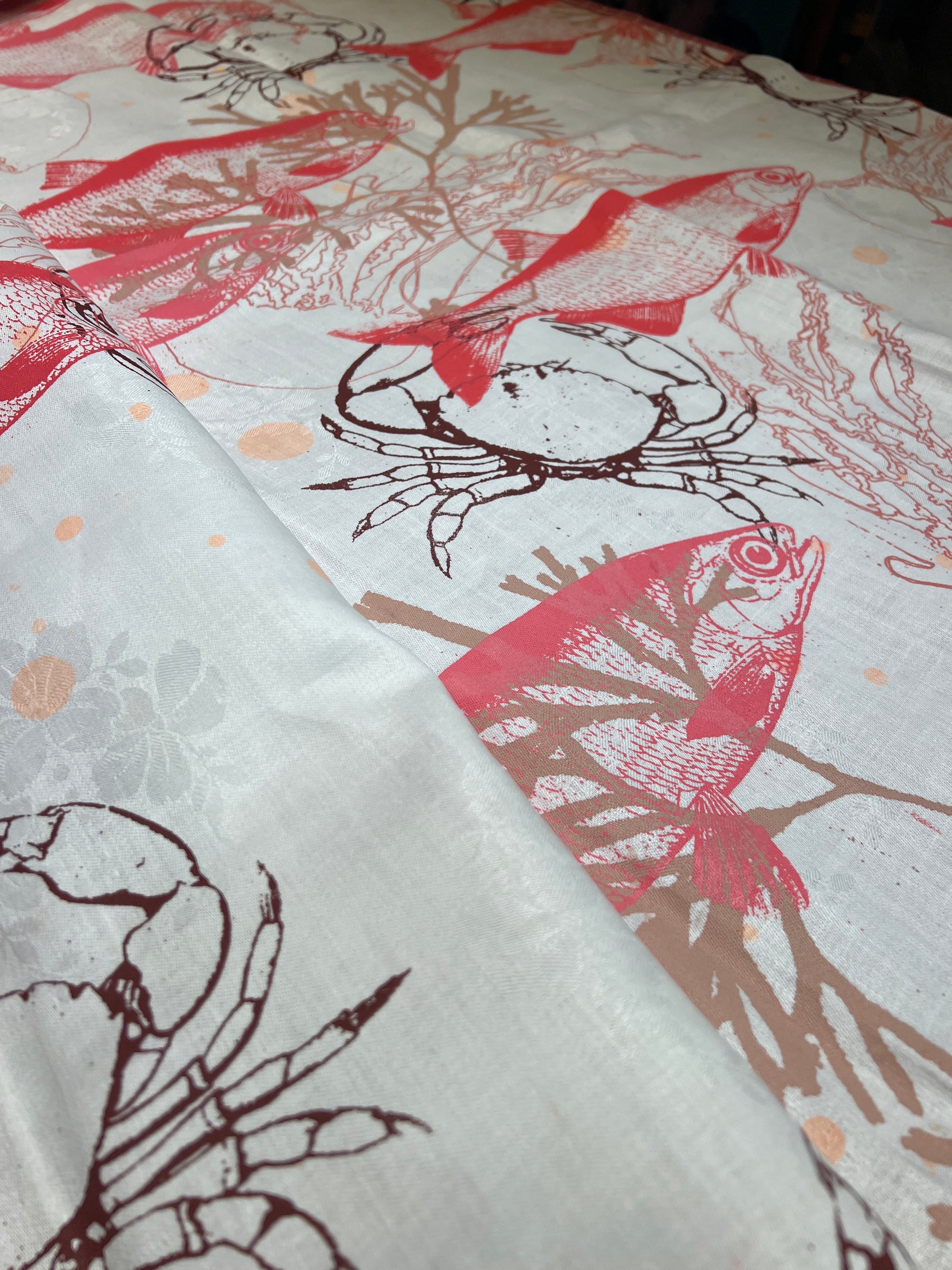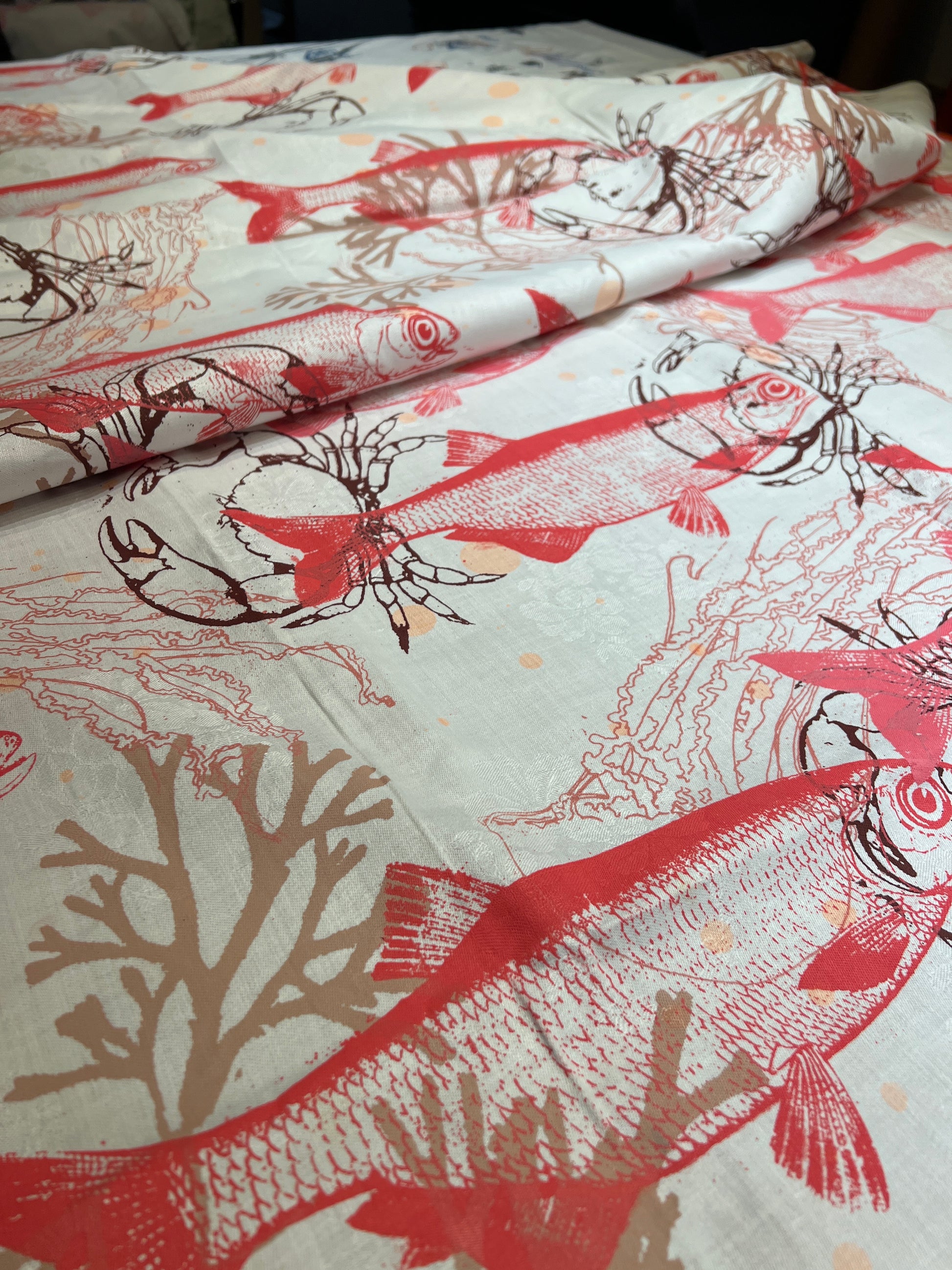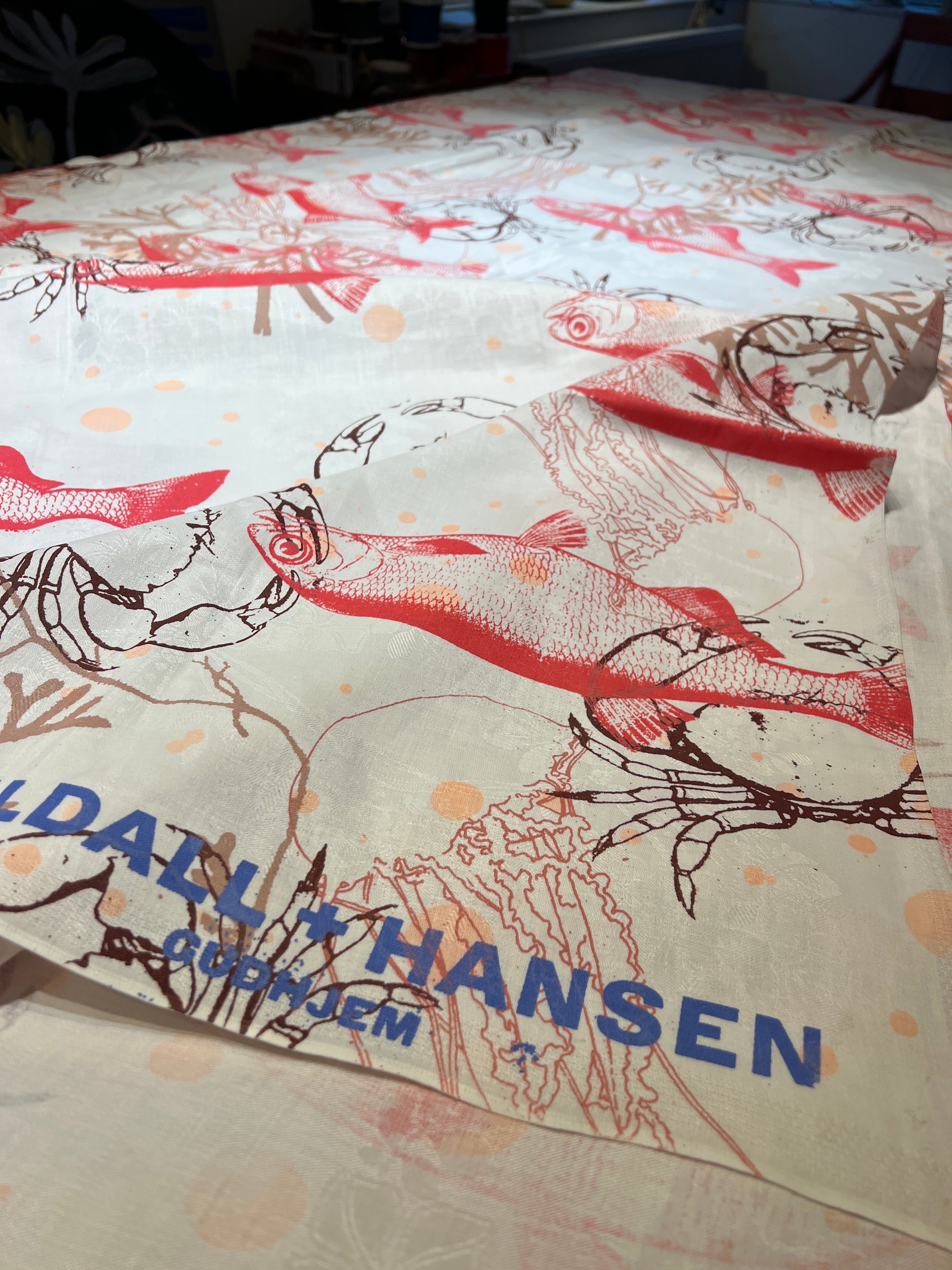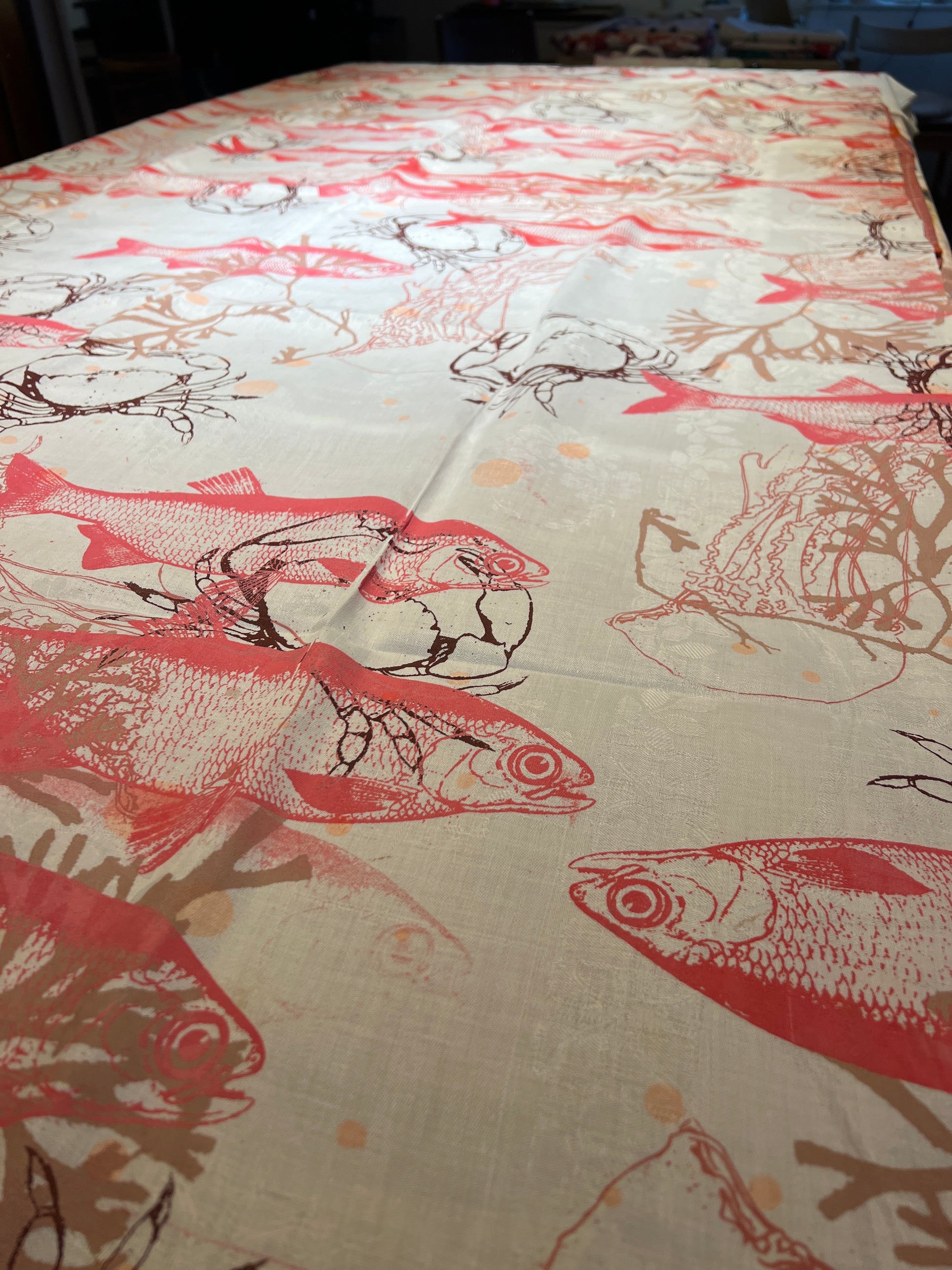 Håndtrykt dug ( gammel kvalitet s duge) med smukke motiver. Trykt på bomuld, der tåler vask på 40 -60 grader. Efter først at have stryget den, på højste varme.