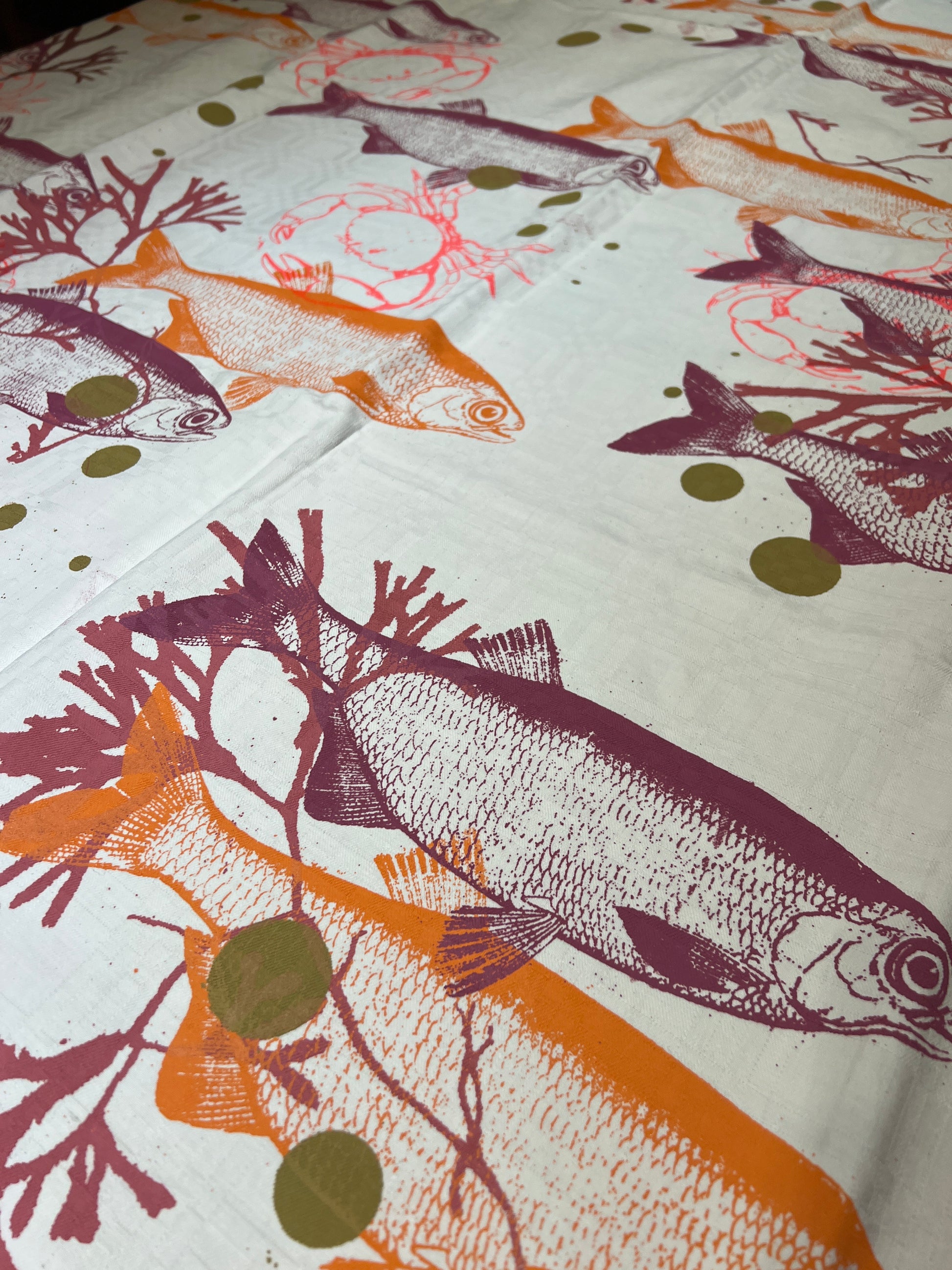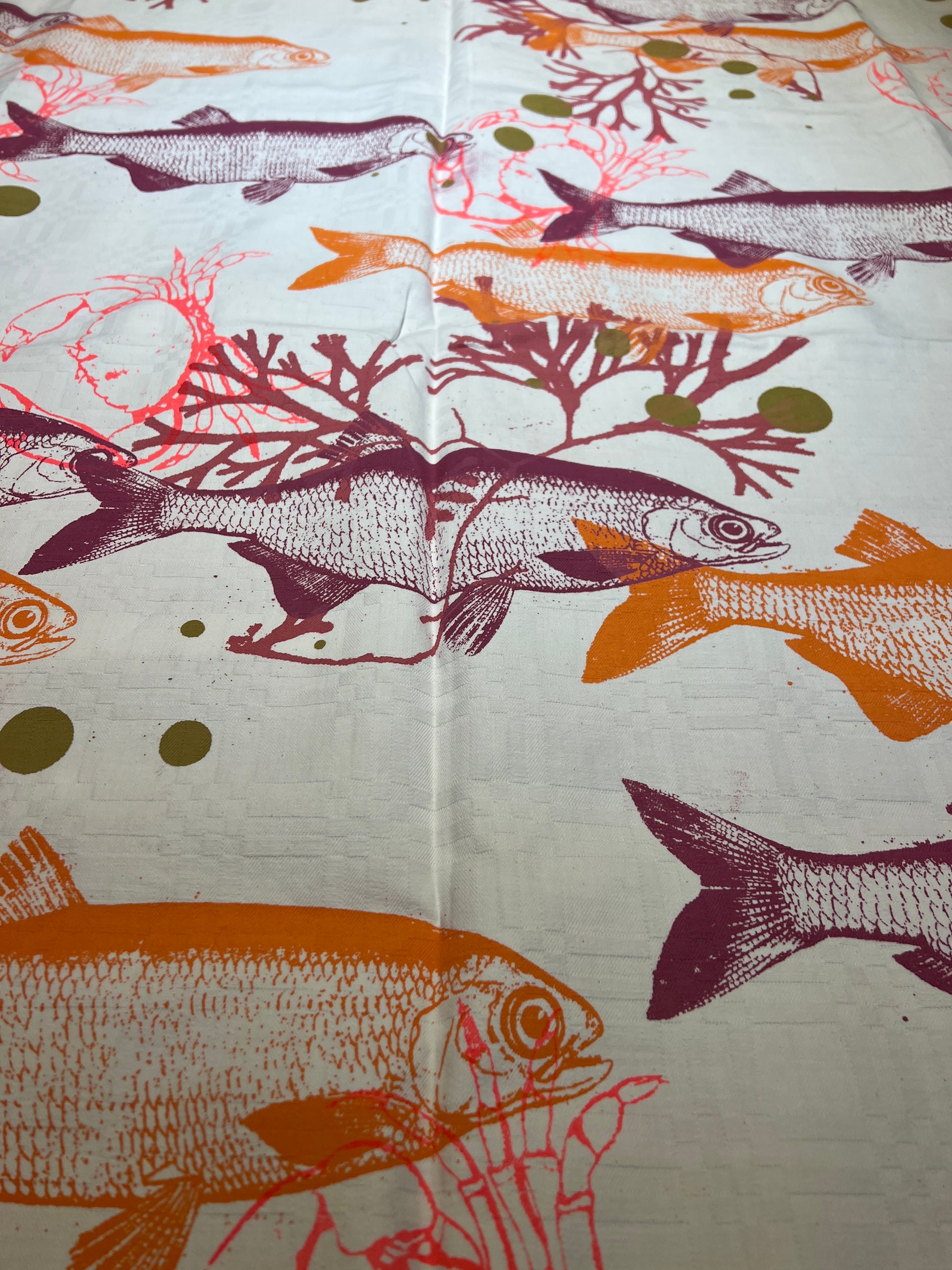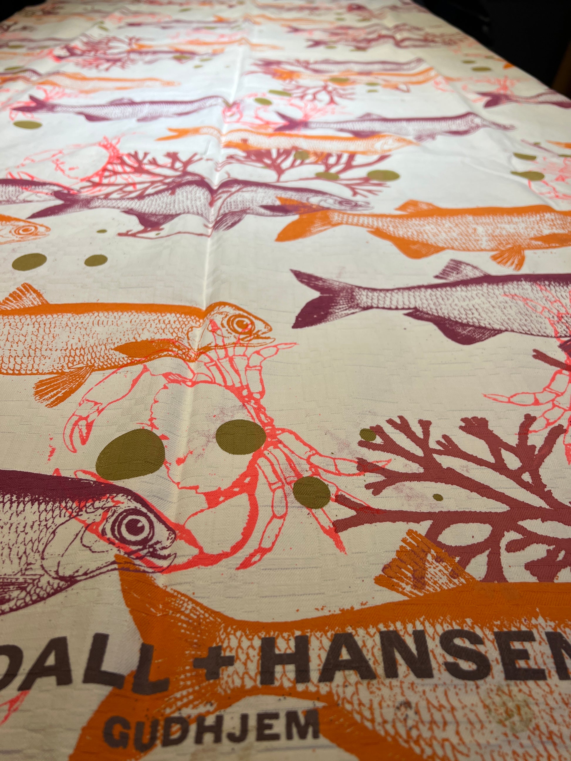 Håndtrykt dug ( gammel kvalitet s duge) med smukke motiver. Trykt på bomuld, der tåler vask på 40 -60 grader. Efter først at have stryget den, på højste varme.
