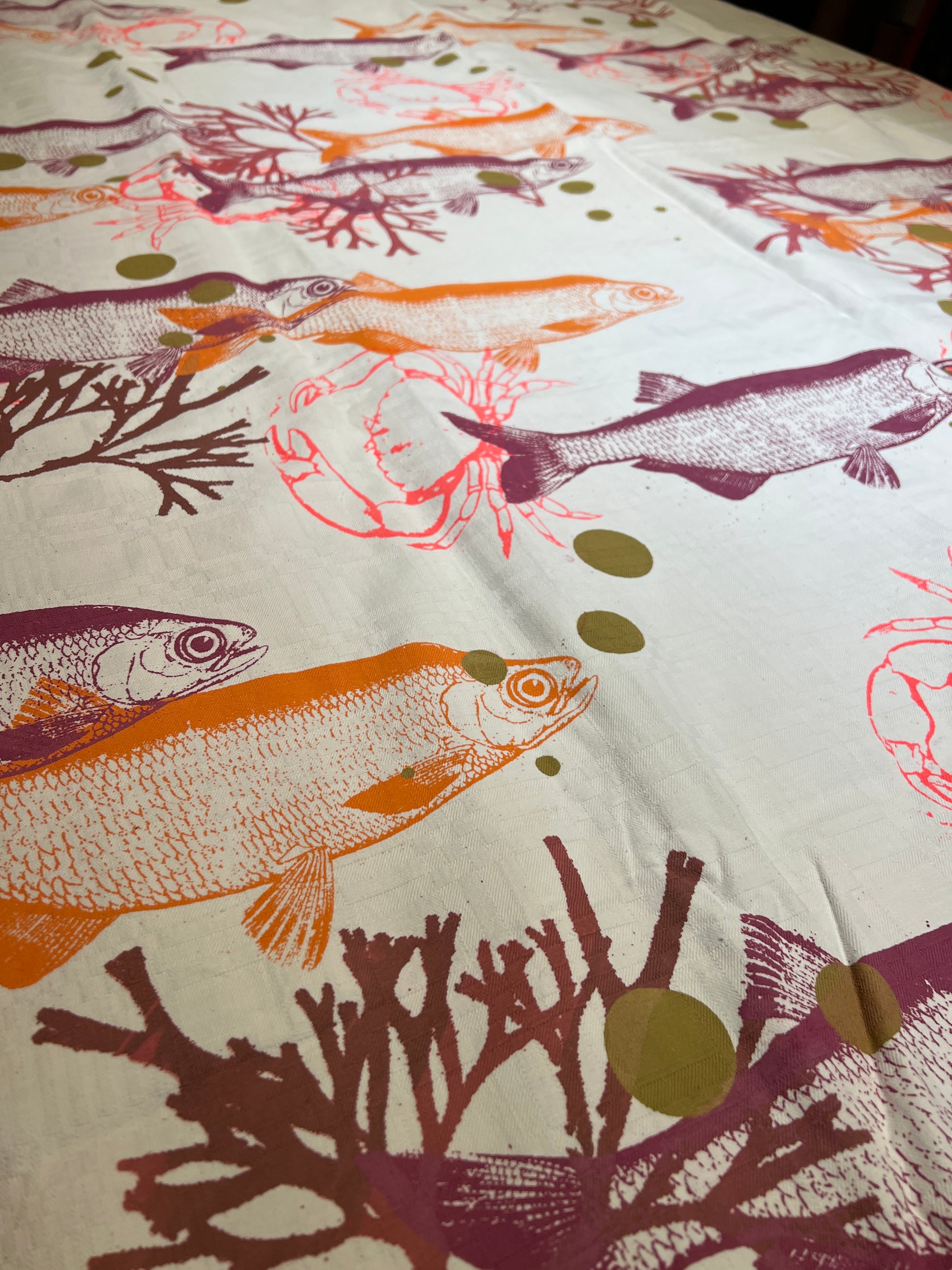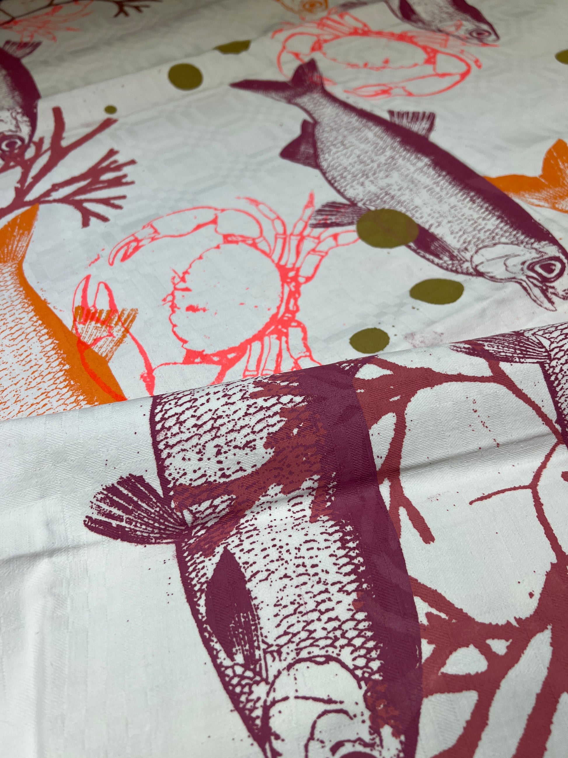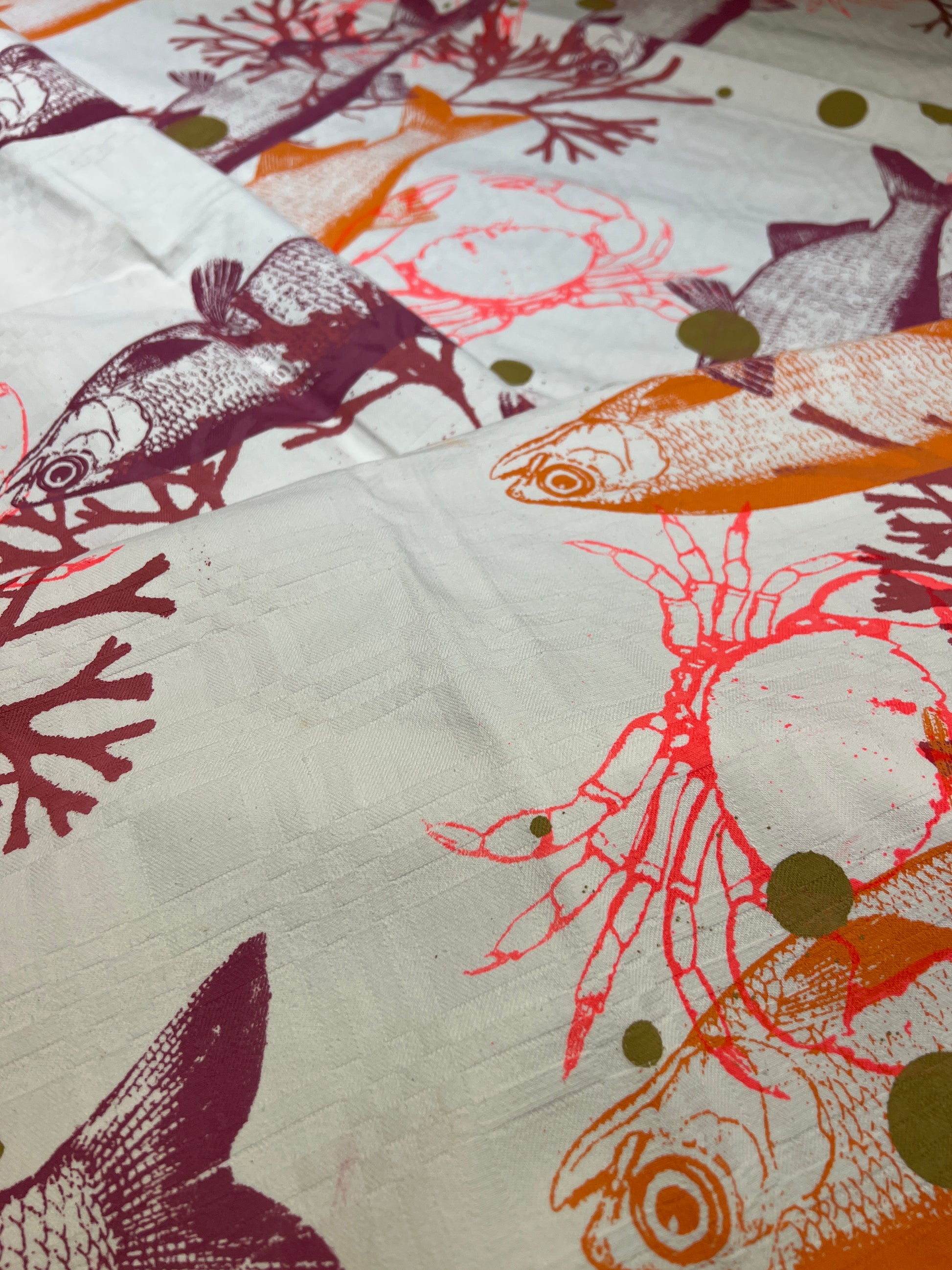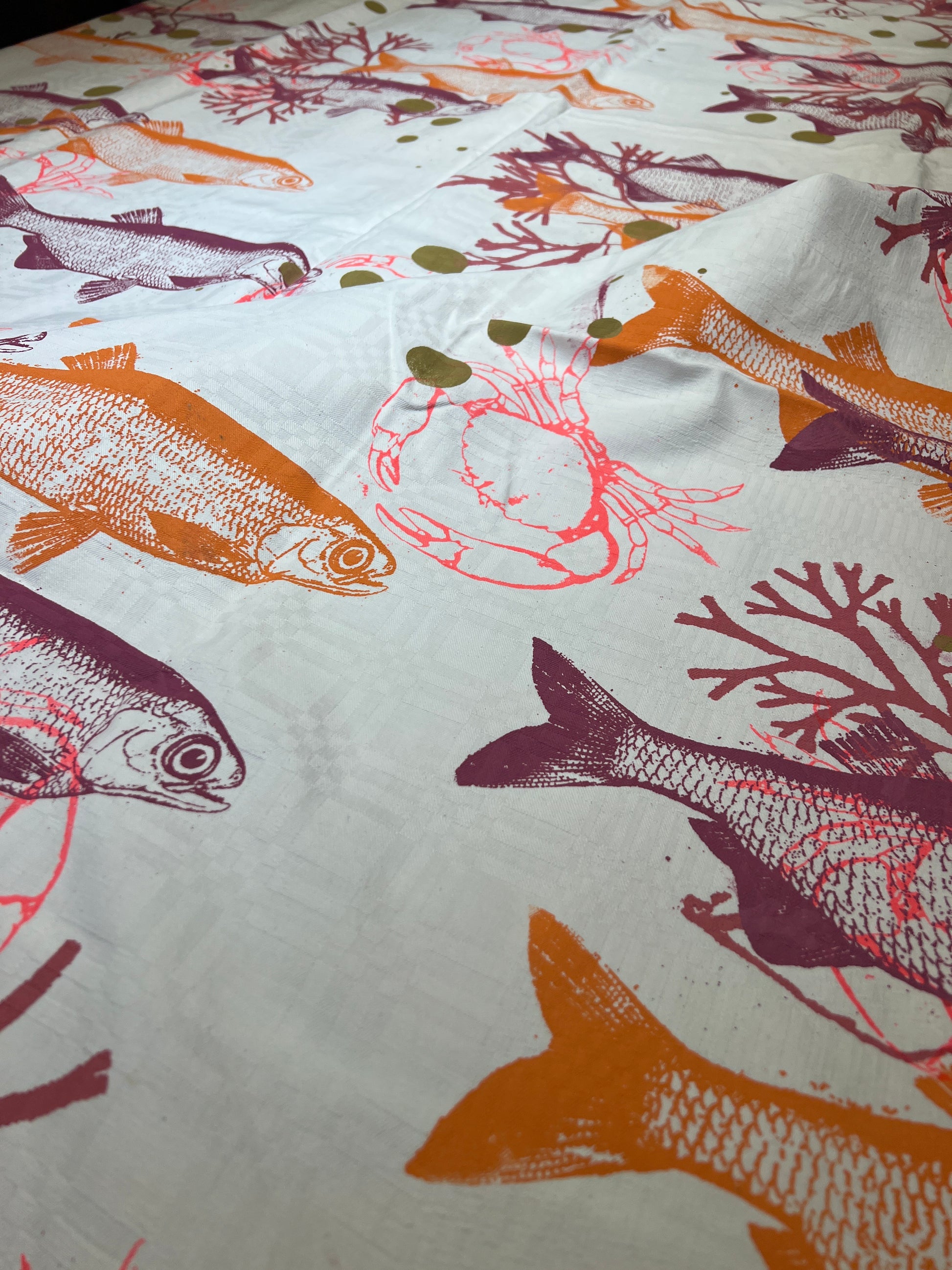 Håndtrykt dug ( gammel kvalitet s duge) med smukke motiver. Trykt på bomuld, der tåler vask på 40 -60 grader. Efter først at have stryget den, på højste varme.