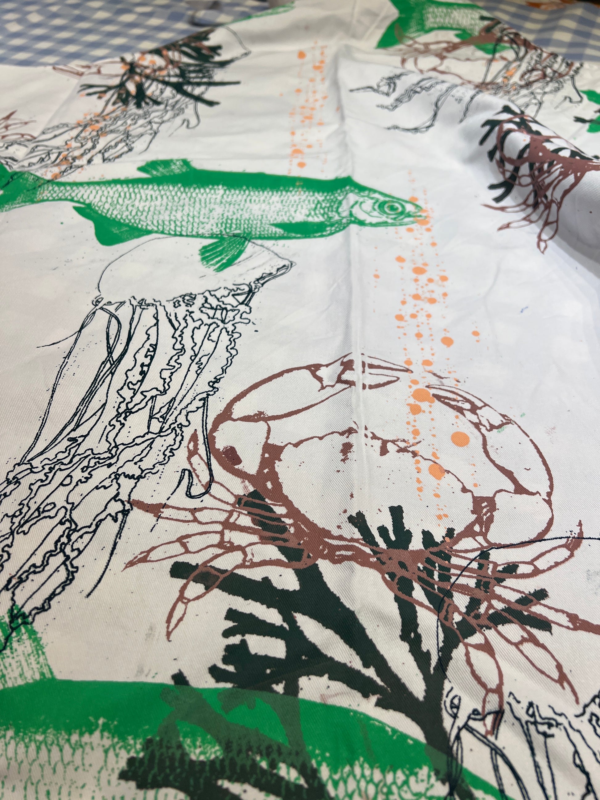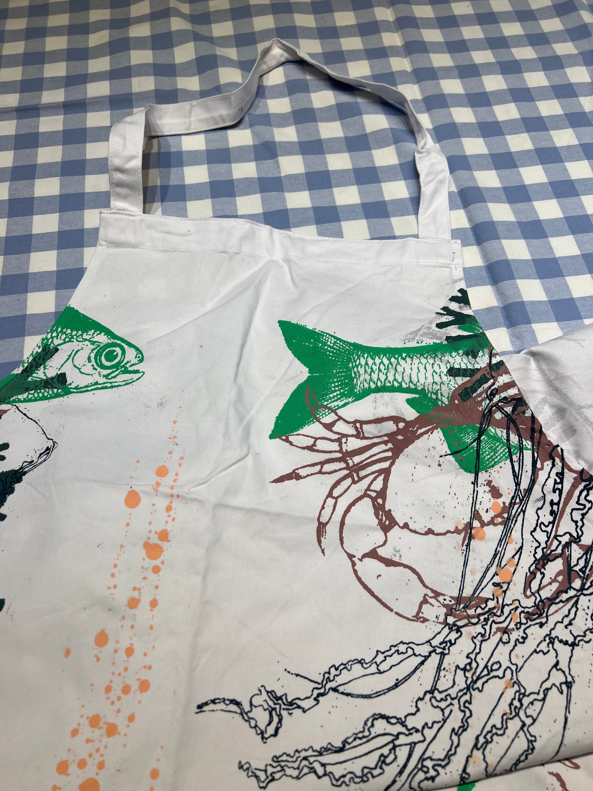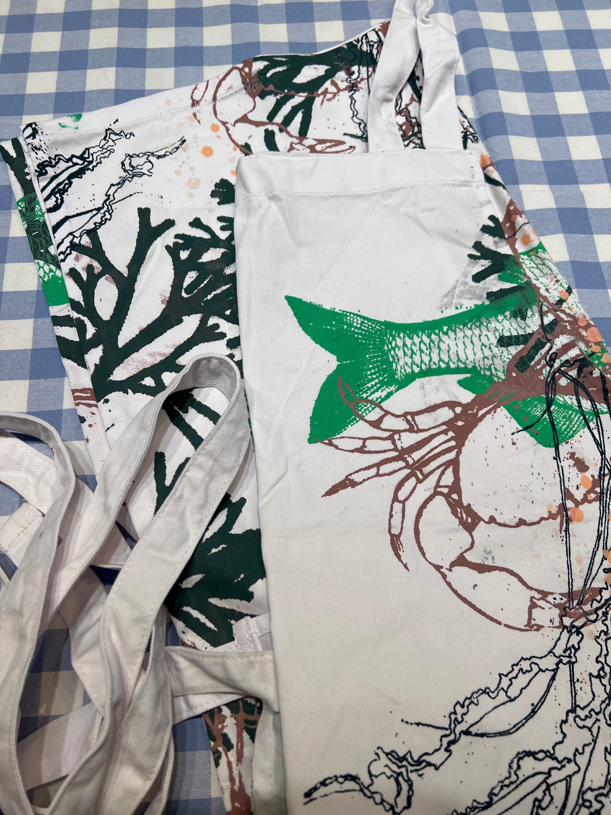 Håndtrykte forklæder med motiver inspireret af natur og hav. Hvert forklæde er unikt og skabt med fokus på kvalitet og håndværk.