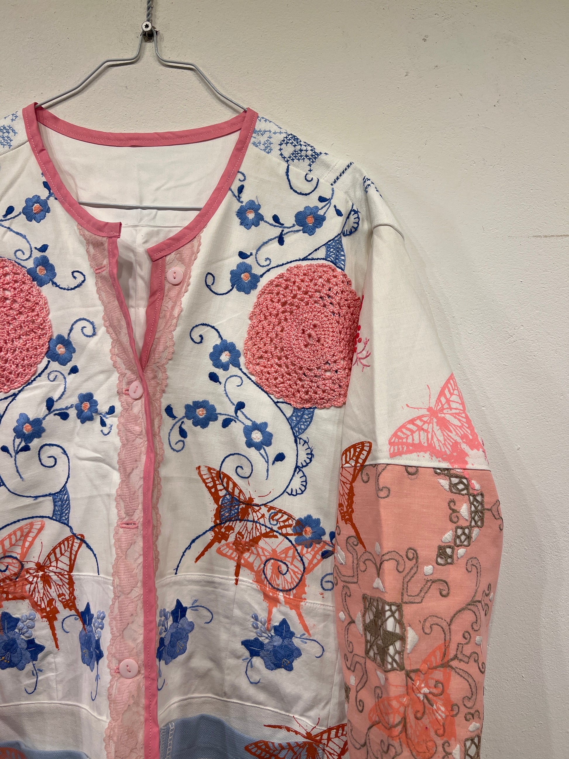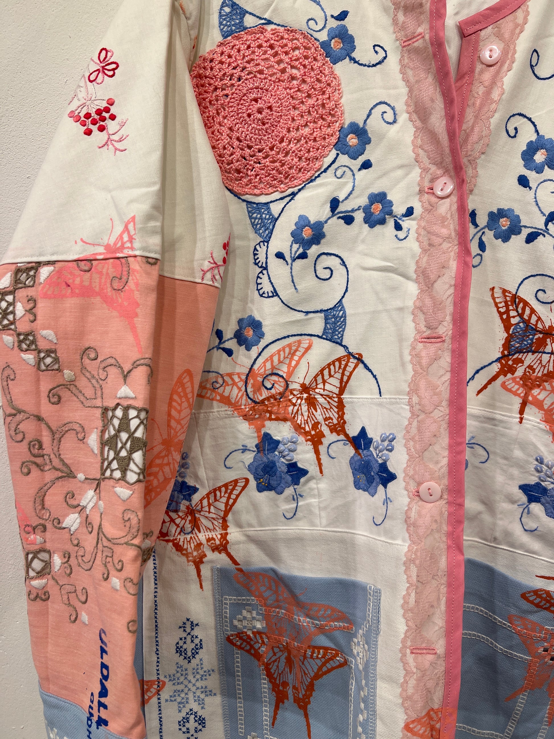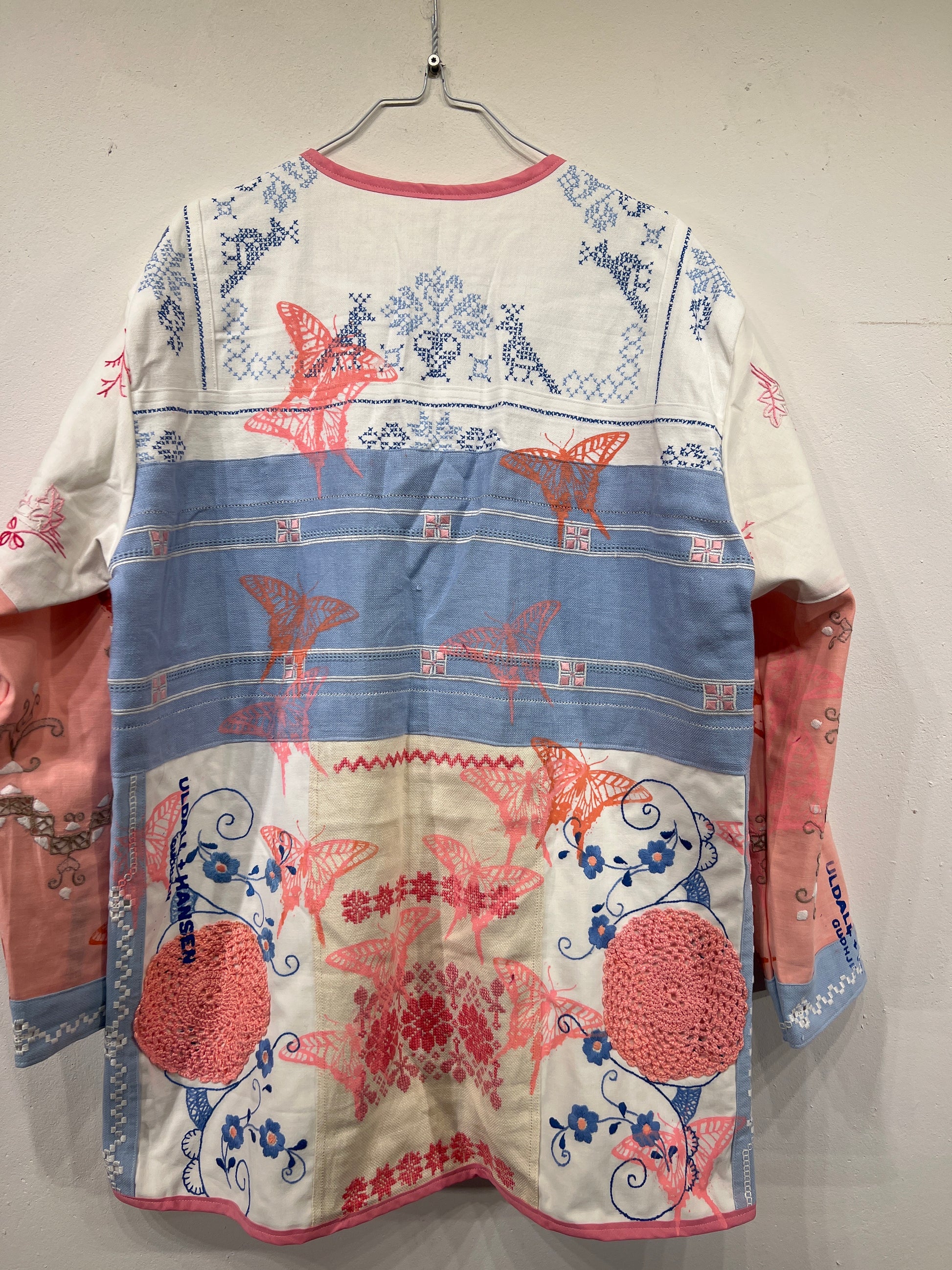 Resultatet er en bæredygtig og kunstnerisk fortolkning af den klassiske jakke, hvor håndværk, kreativitet og genbrug går op i en tidløs helhed.