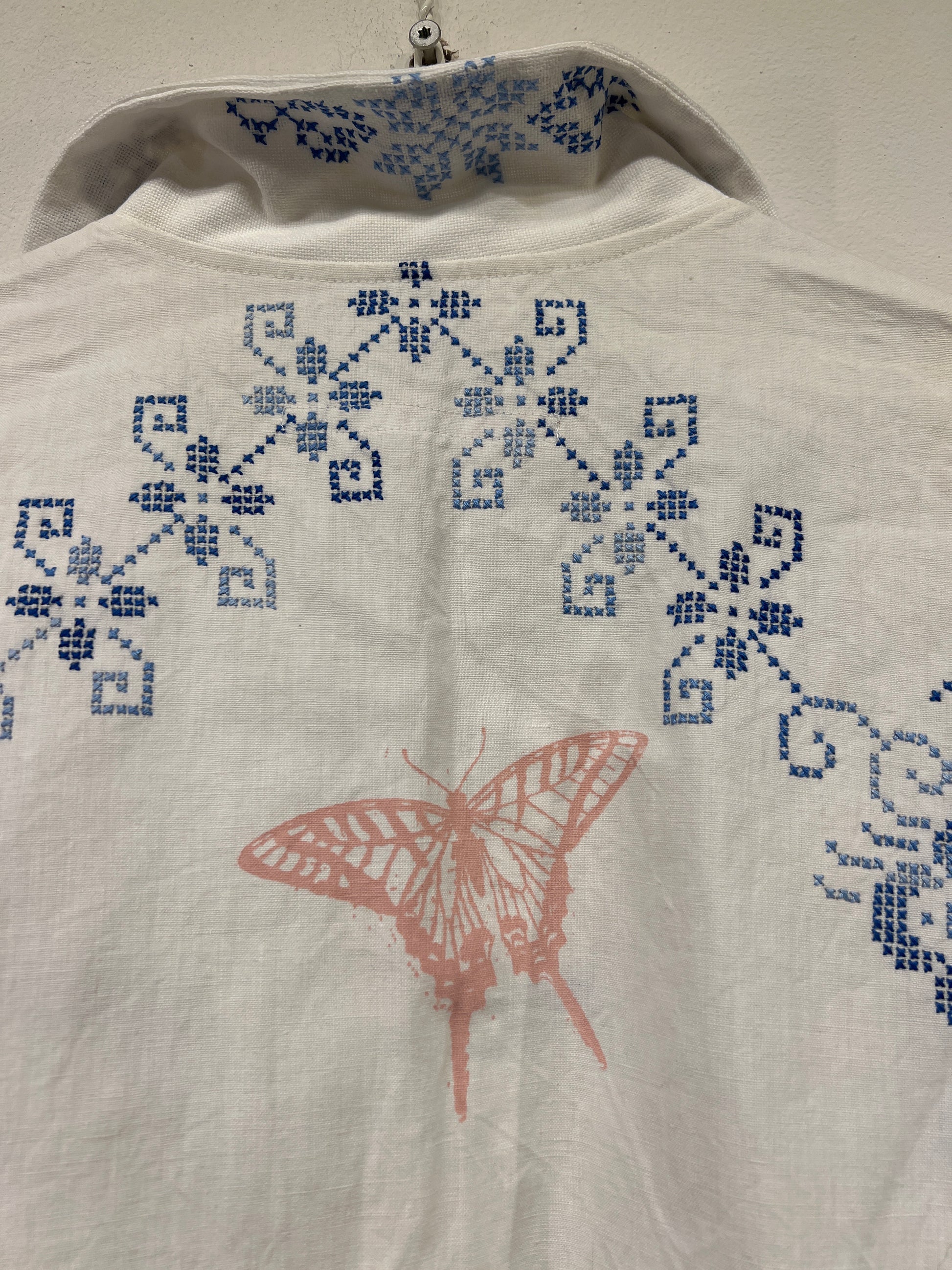 Resultatet er en bæredygtig og kunstnerisk fortolkning af den klassiske jakke, hvor håndværk, kreativitet og genbrug går op i en tidløs helhed.