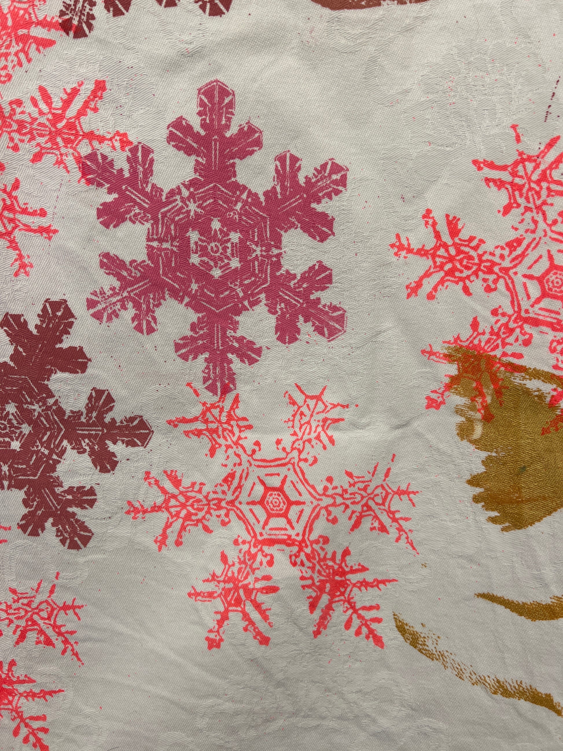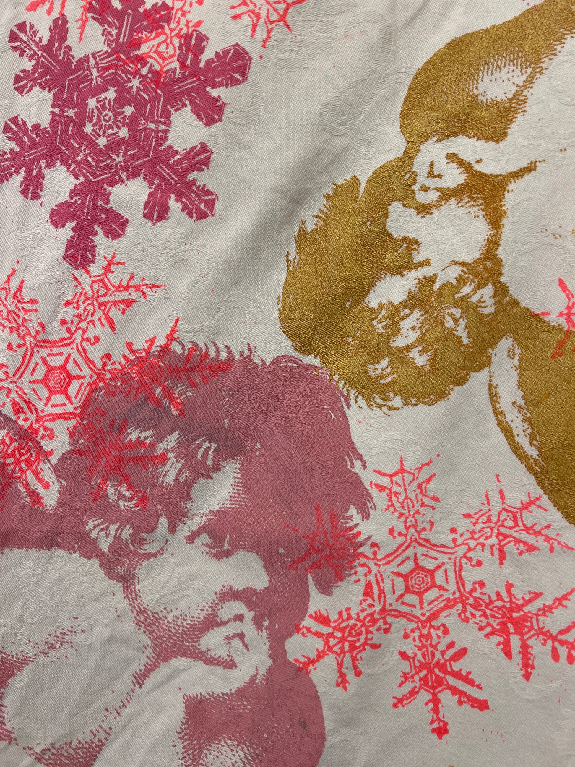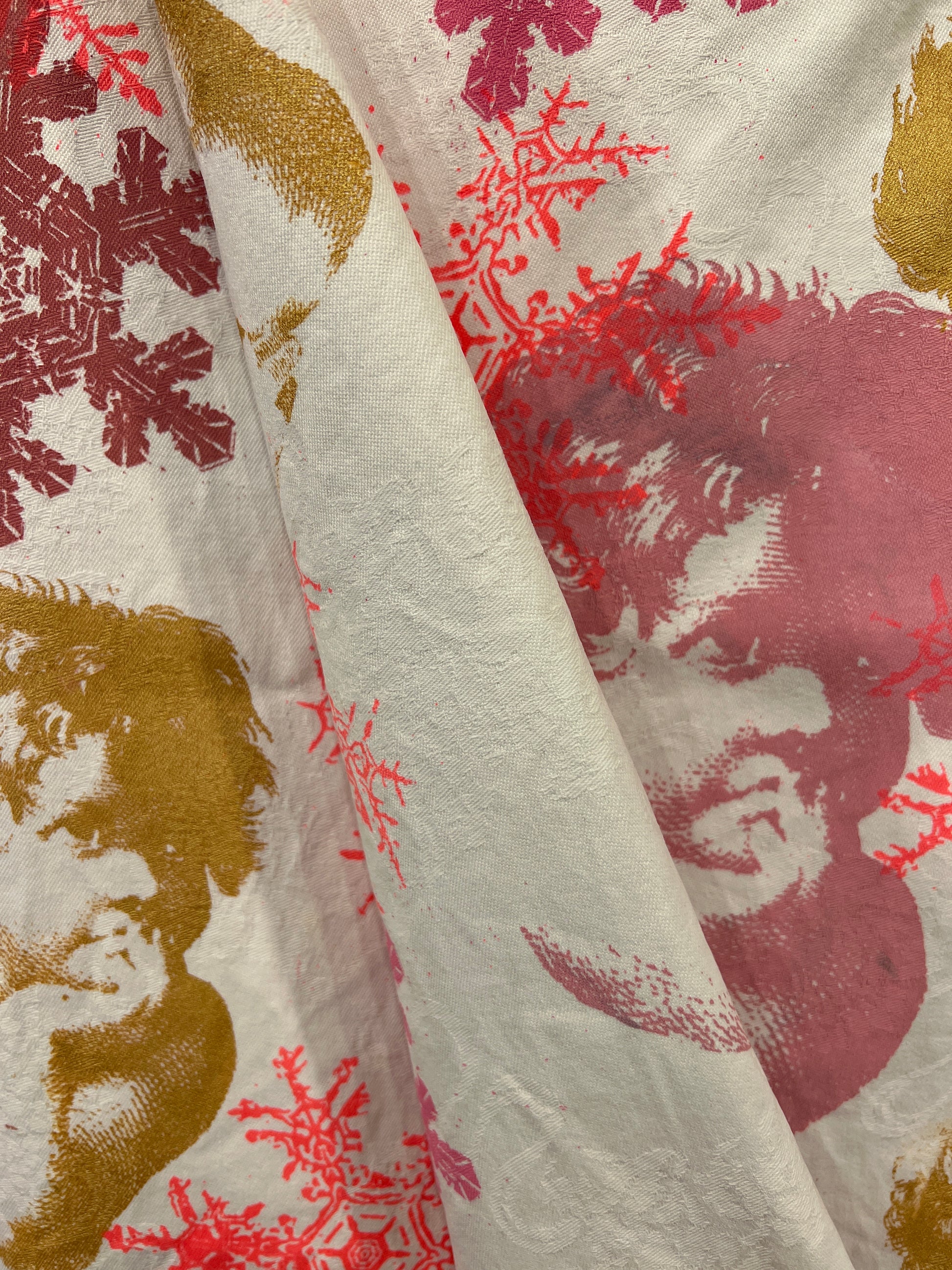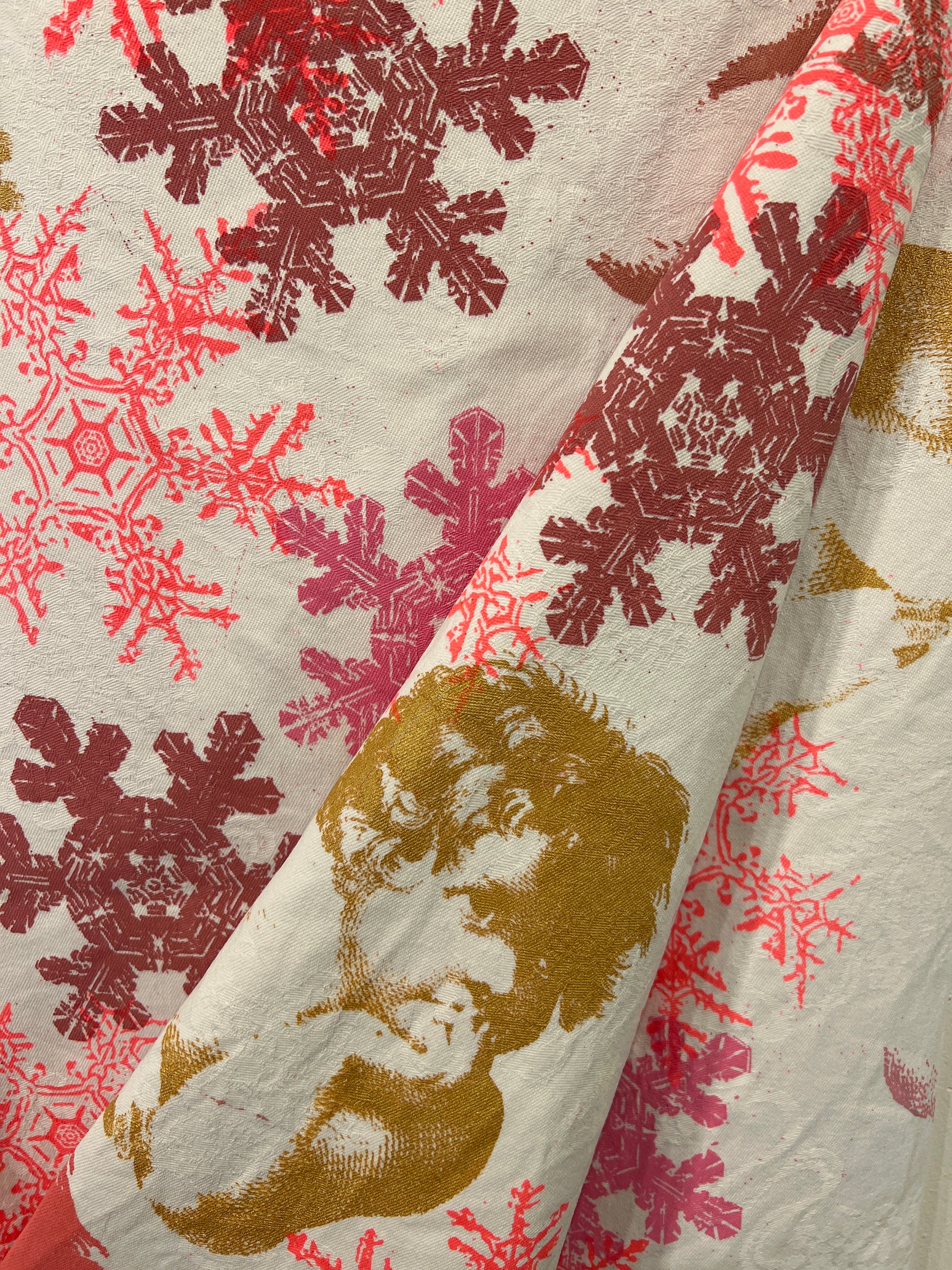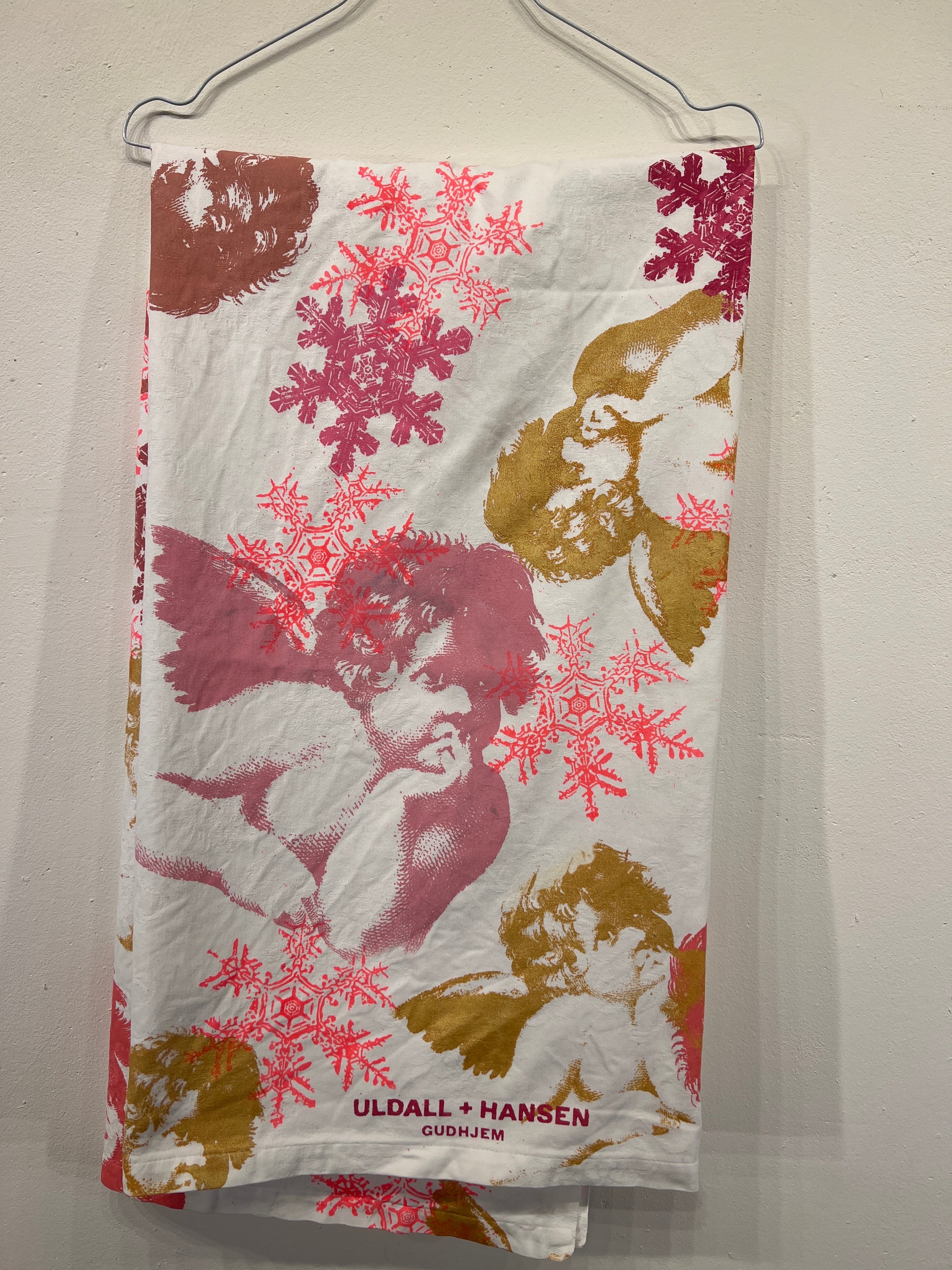 Håndtrykt dug ( gammel kvalitet s duge) med smukke motiver. Trykt på bomuld, der tåler vask på 40 -60 grader. Efter først at have stryget den, på højste varme.