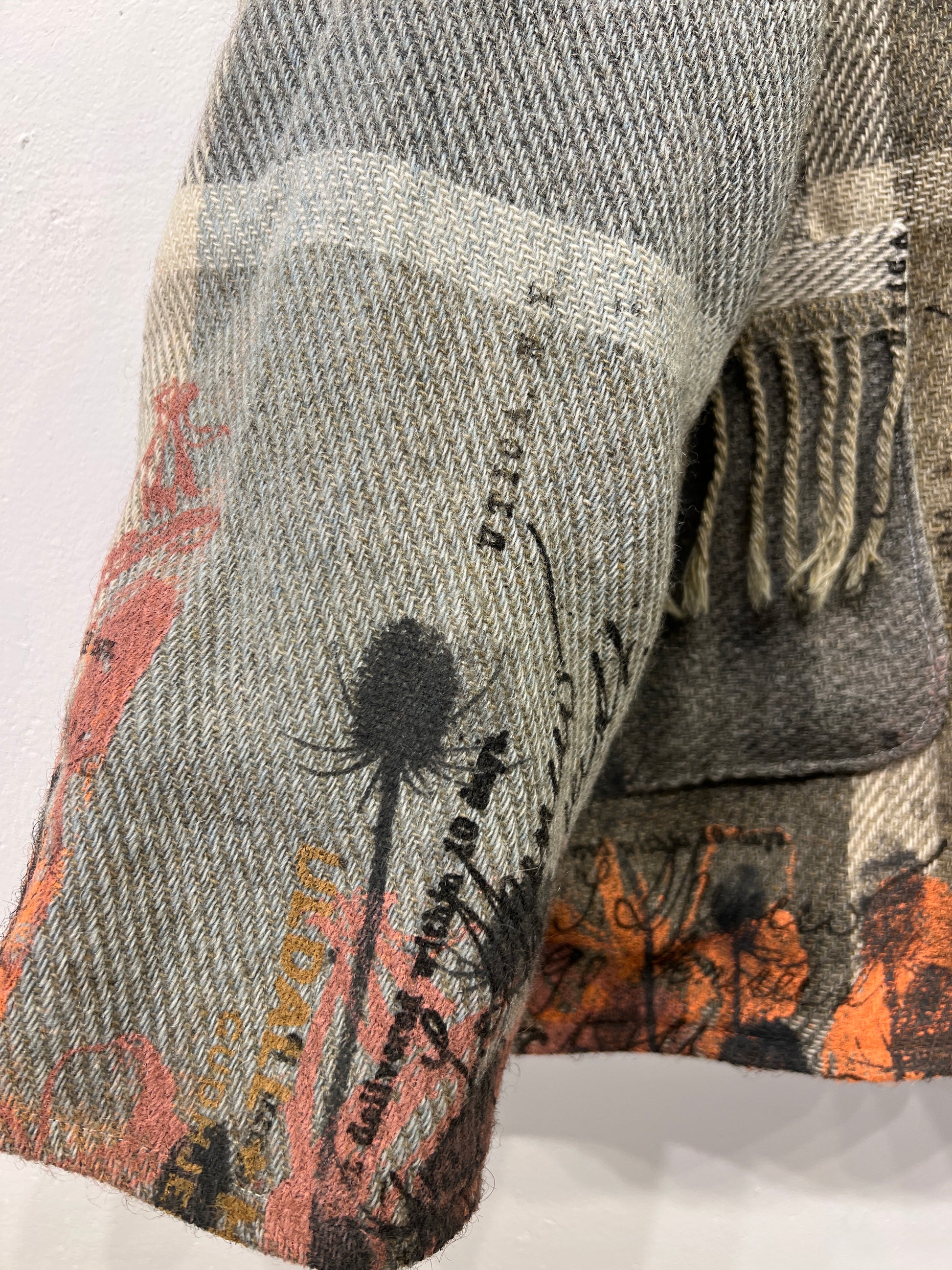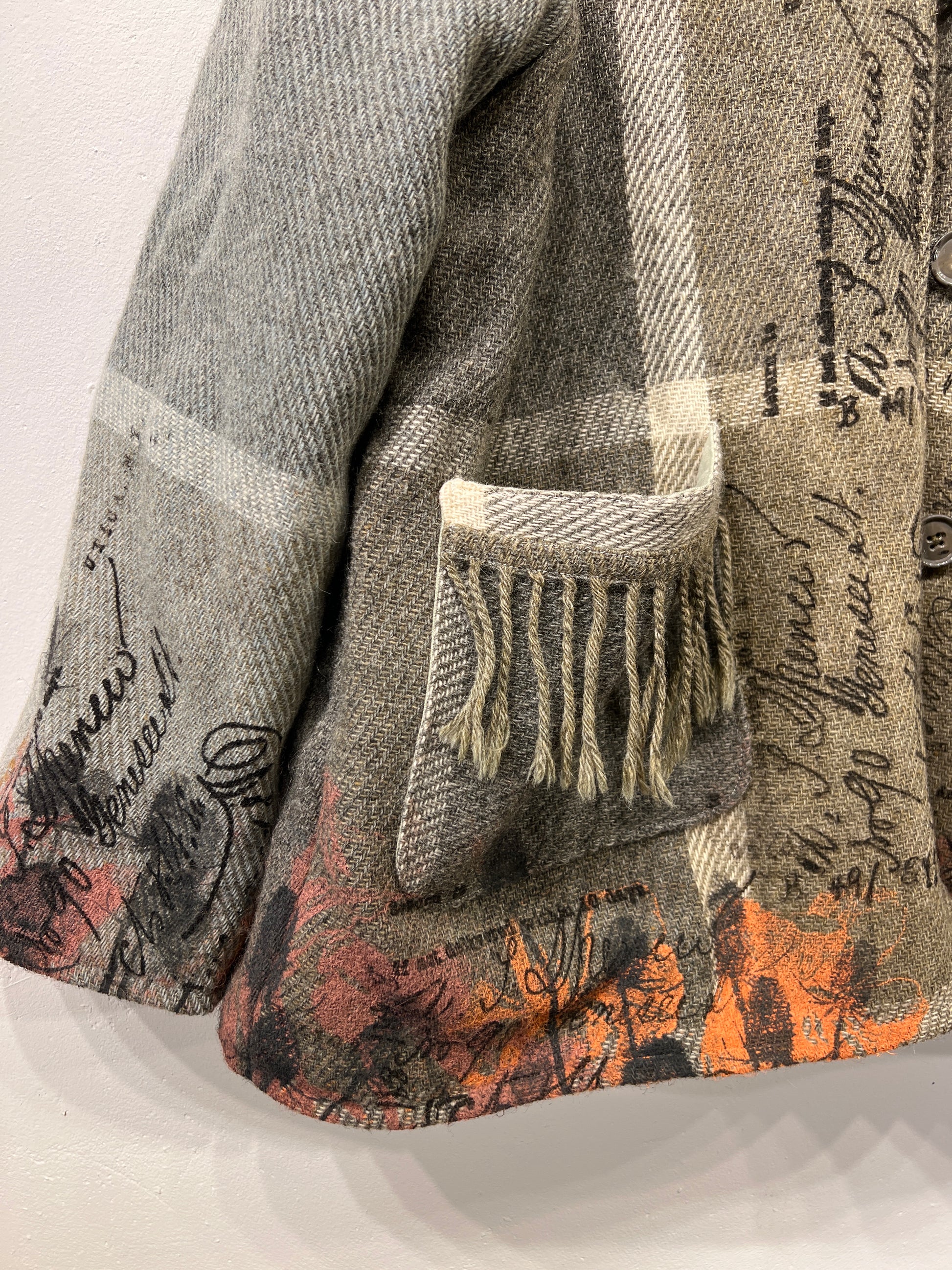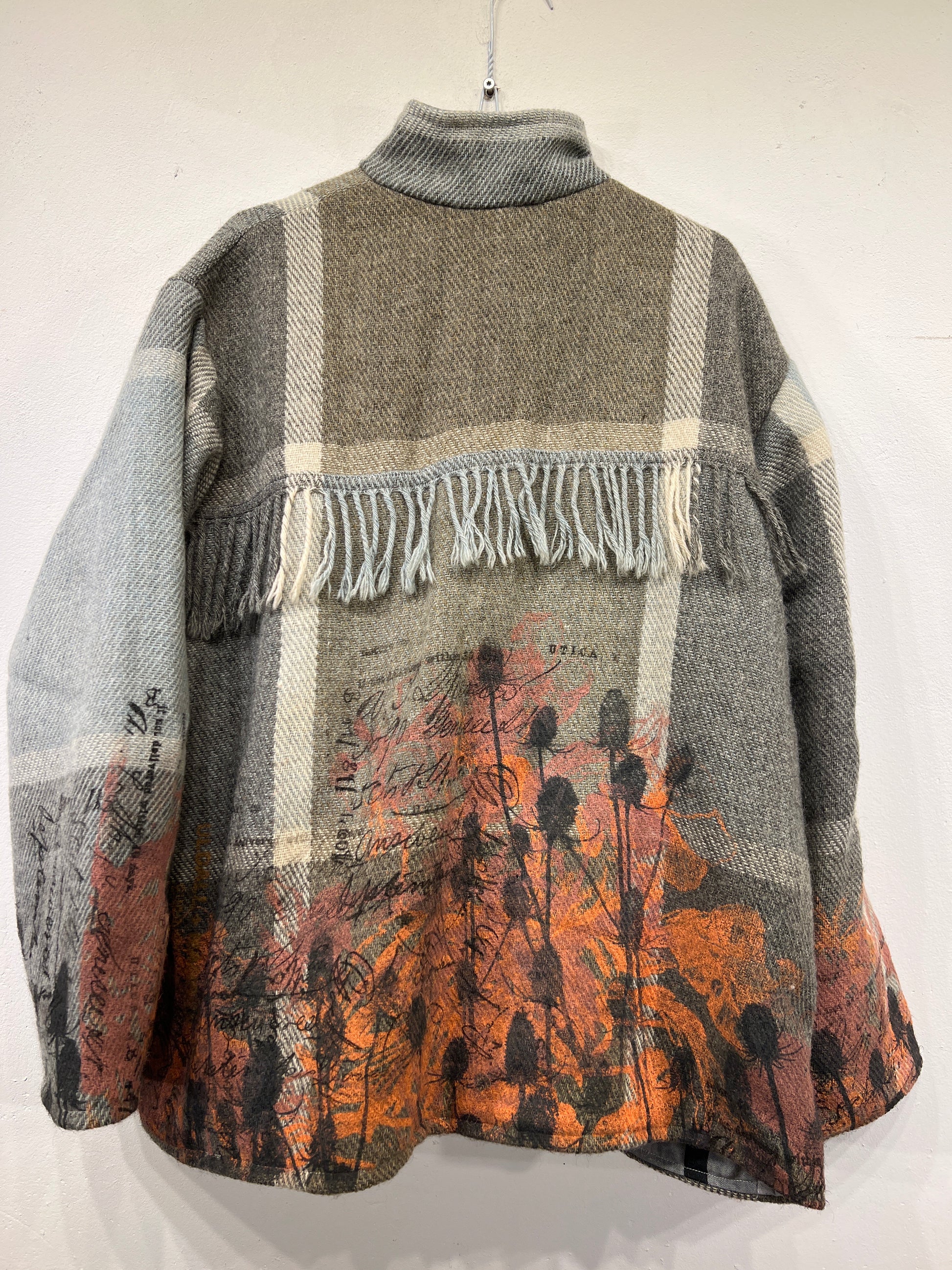 Resultatet er en bæredygtig og kunstnerisk fortolkning af den klassiske jakke, hvor håndværk, kreativitet og genbrug går op i en tidløs helhed.