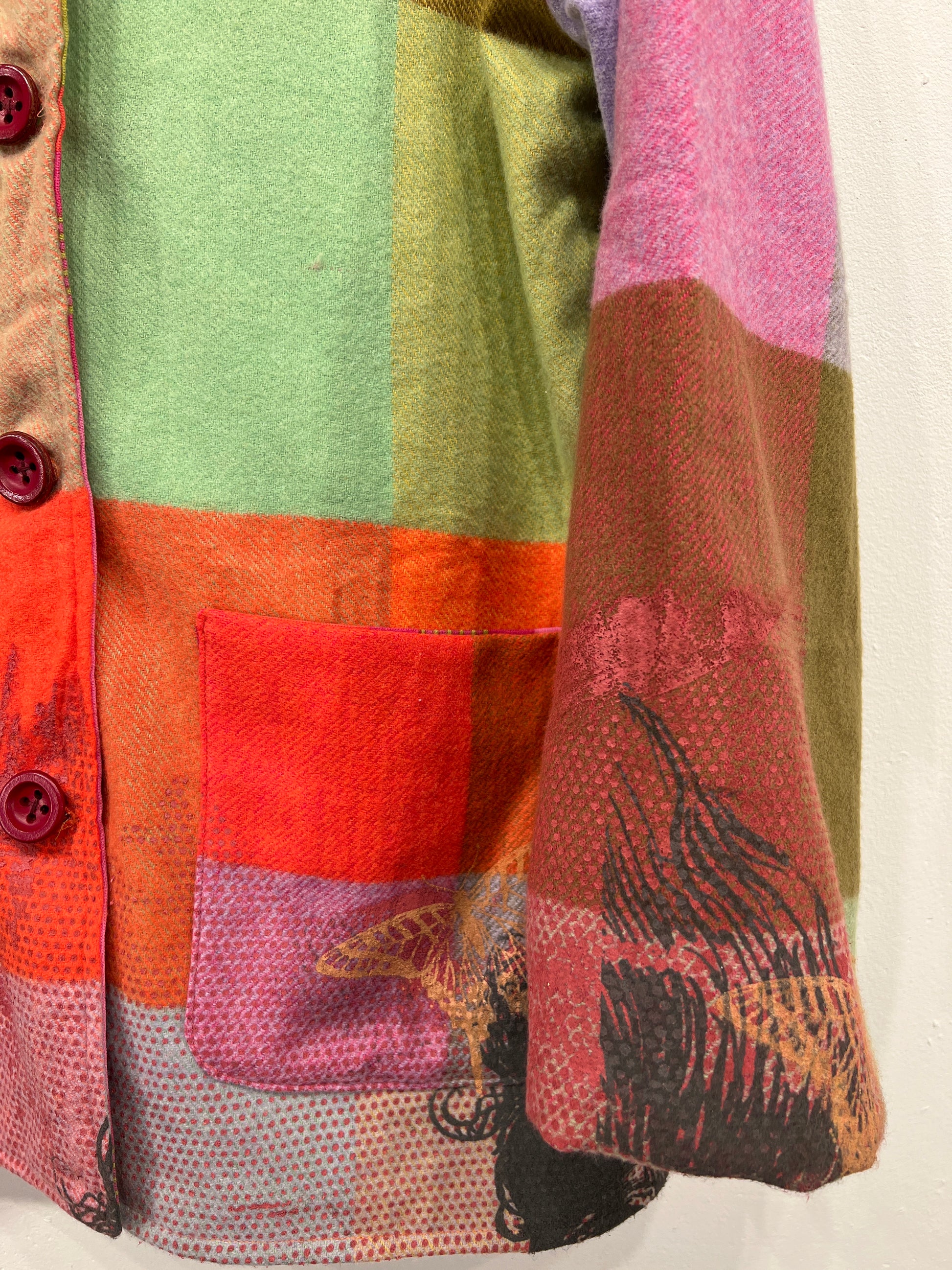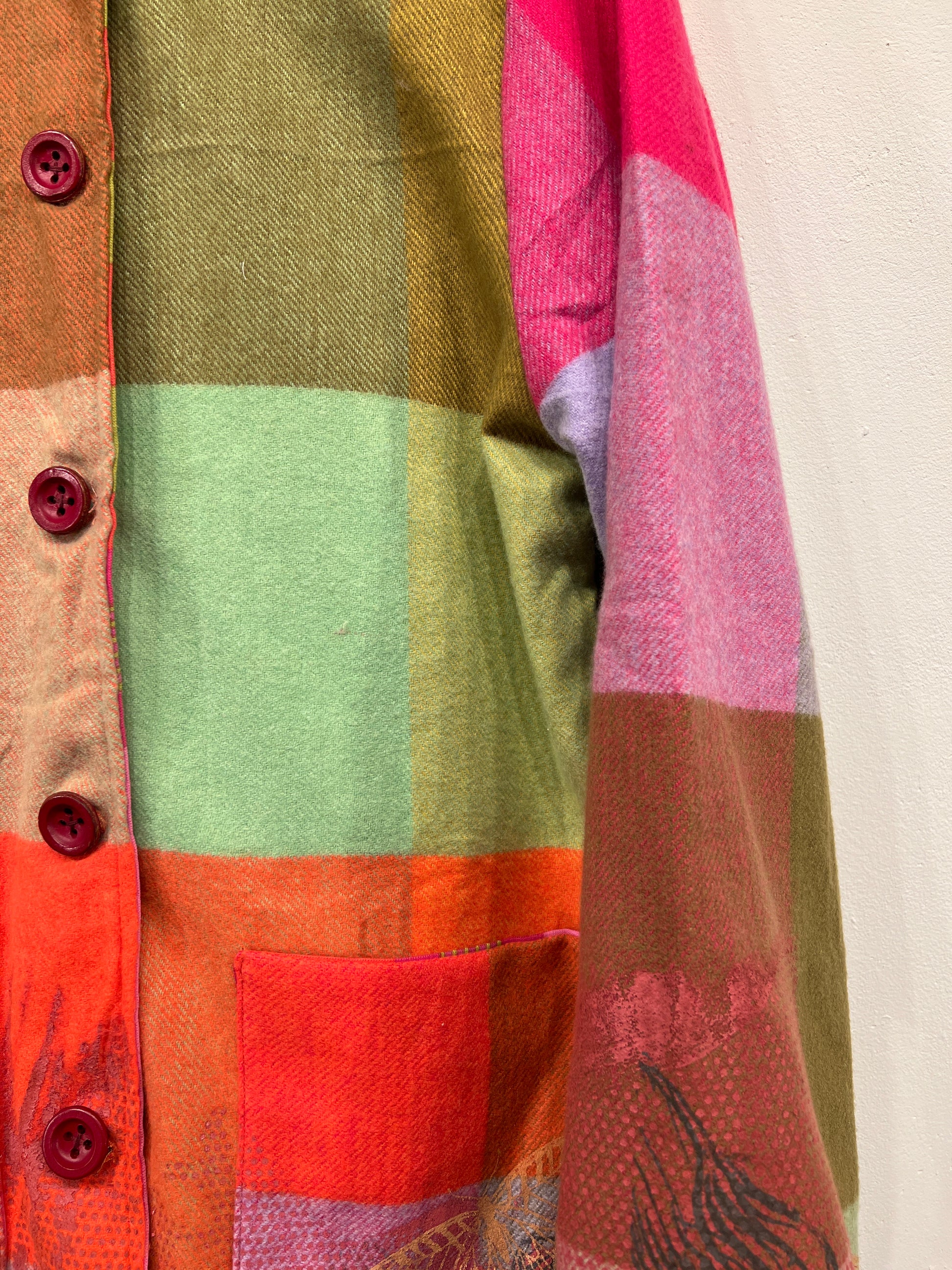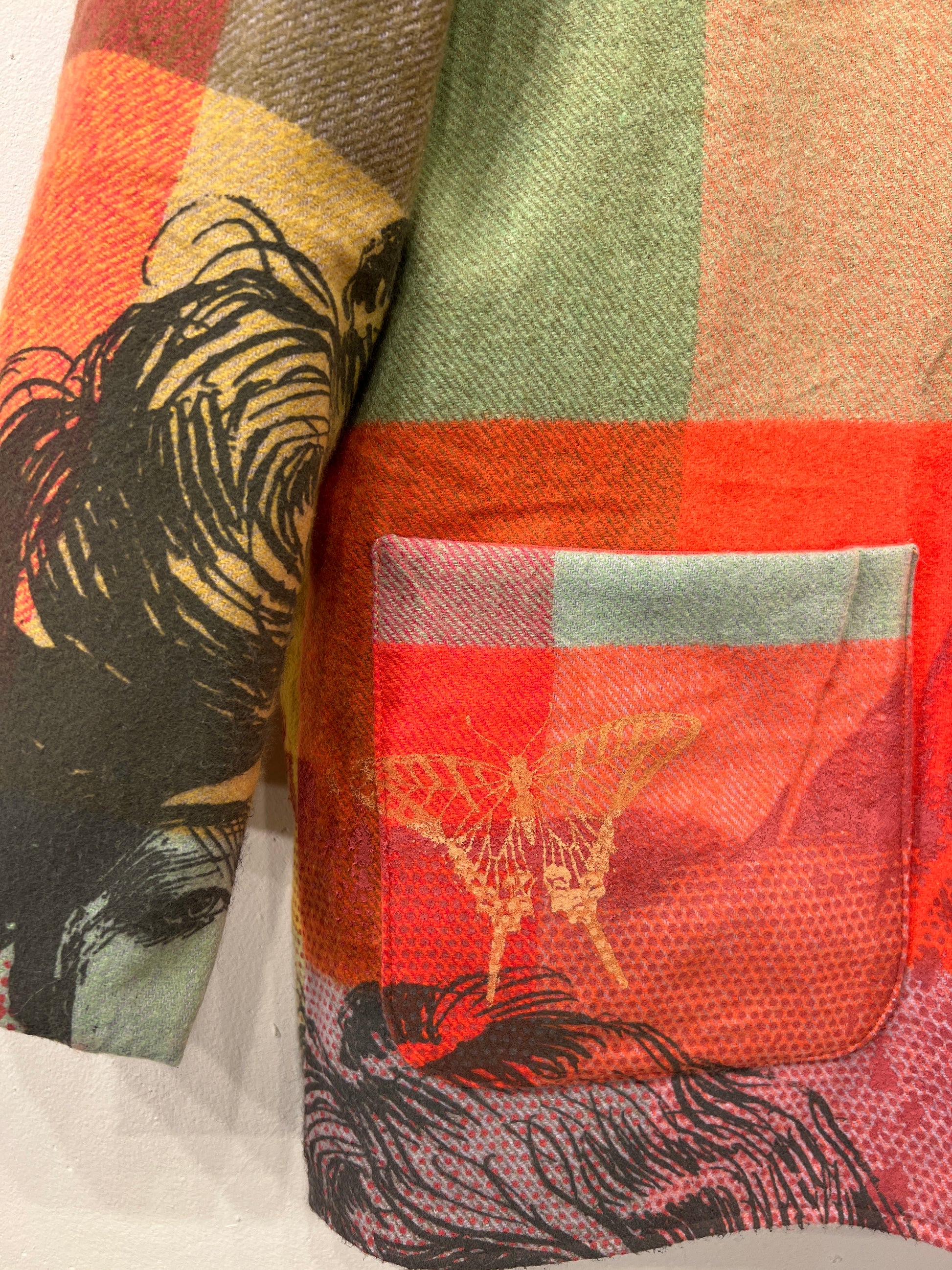 Resultatet er en bæredygtig og kunstnerisk fortolkning af den klassiske jakke, hvor håndværk, kreativitet og genbrug går op i en tidløs helhed.
