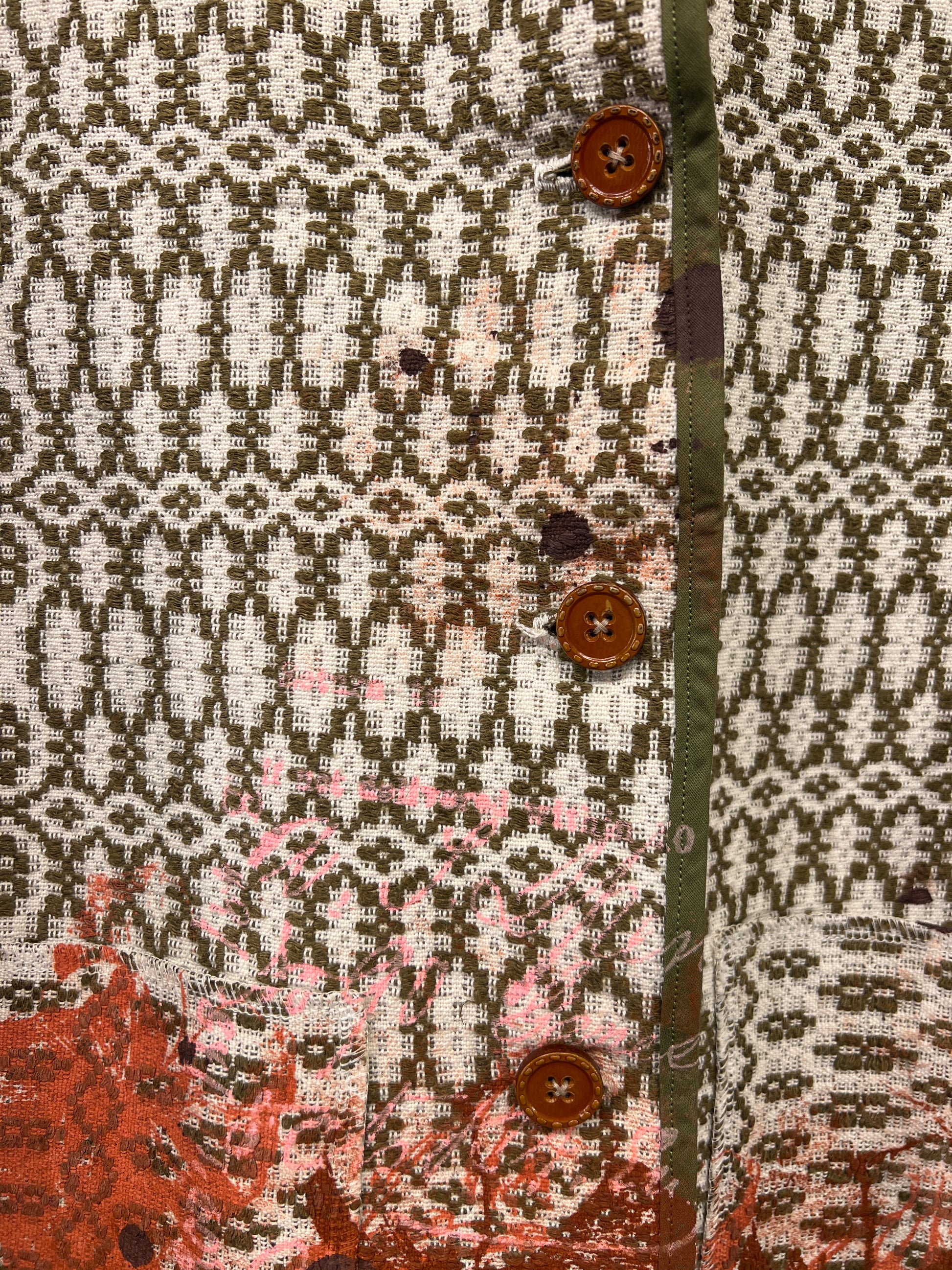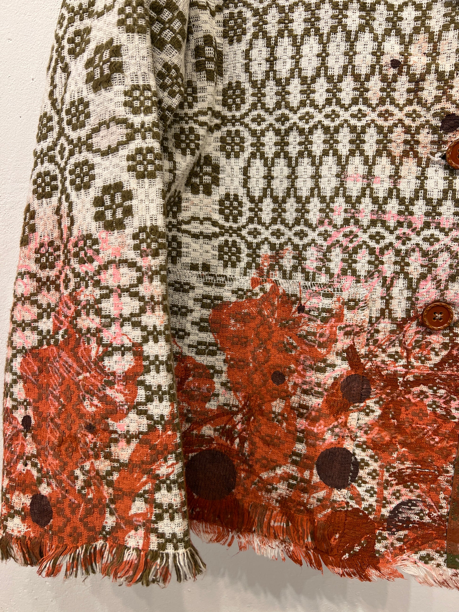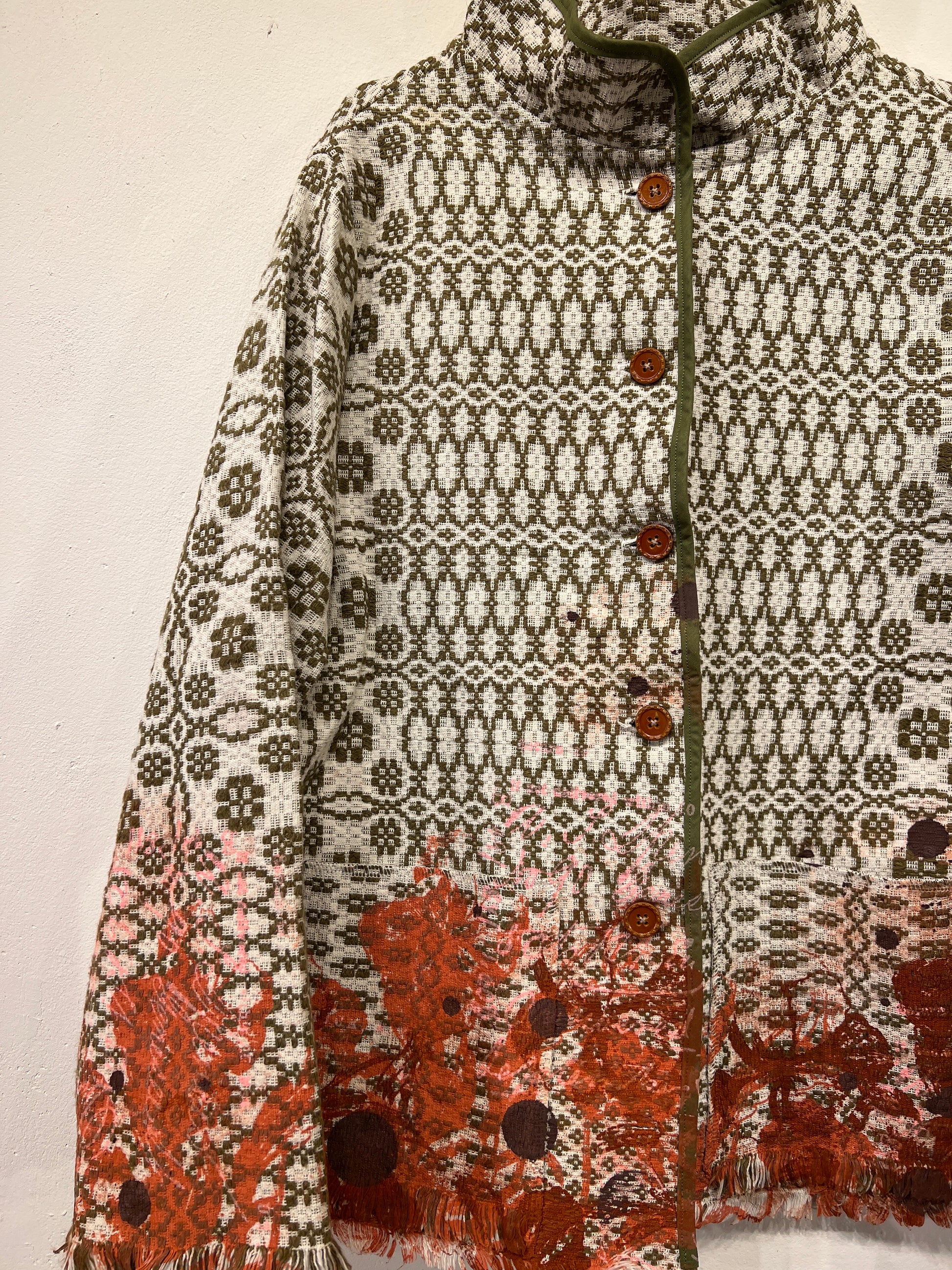 Resultatet er en bæredygtig og kunstnerisk fortolkning af den klassiske jakke, hvor håndværk, kreativitet og genbrug går op i en tidløs helhed.
