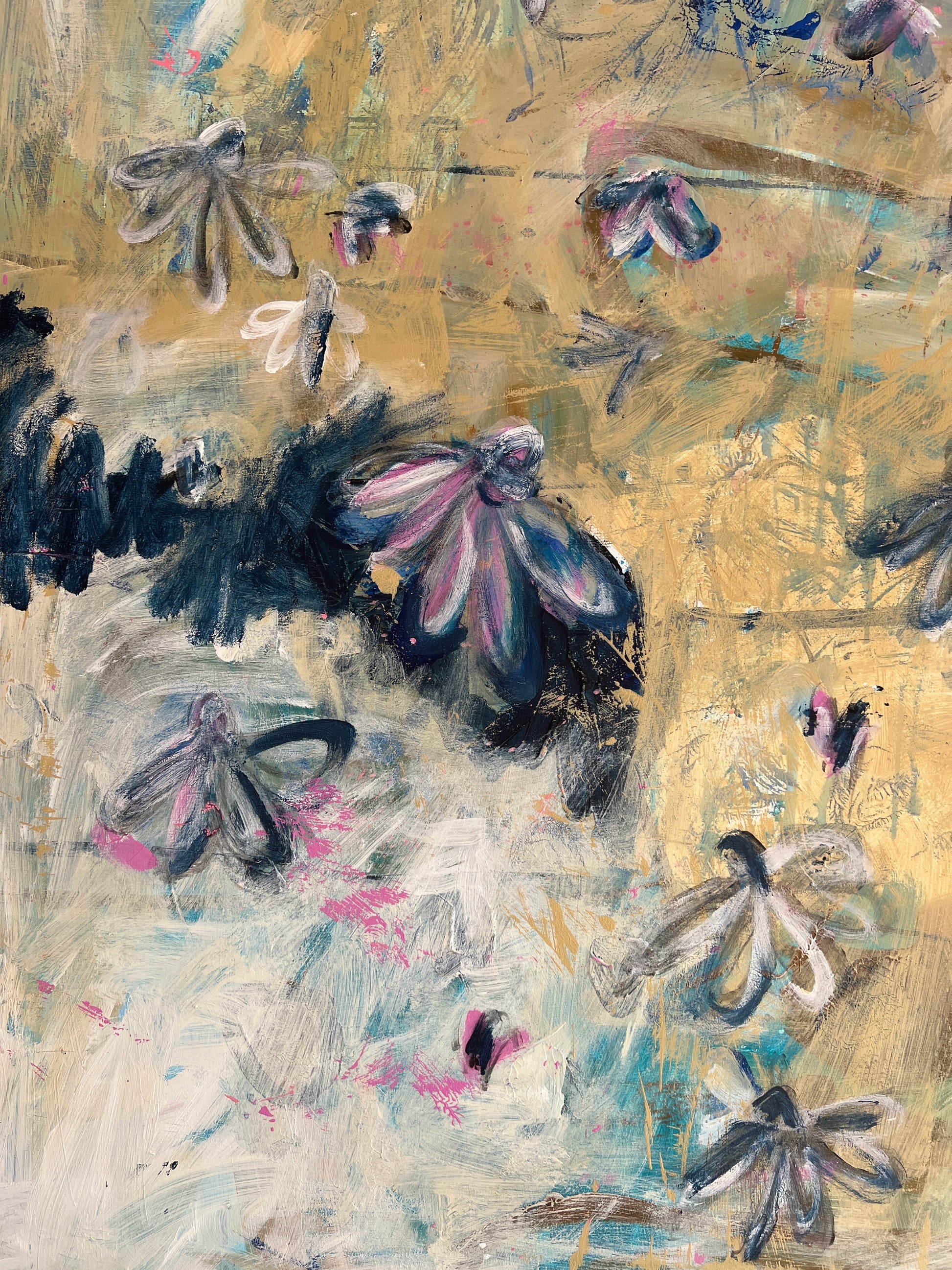Dette værk er malet af Jeanette Uldall, kunstner bosat i Gudhjem. Hun forener det figurative og det abstrakte i en levende og moderne fortolkning af en blomsteropstilling. De brede penselstrøg, den markante sortlinjede komposition og de varme jordfarver skaber et udtryk, der både er kraftfuldt og poetisk. Uldalls sikre formsprog og intuitive farvevalg giver værket en særlig rytme og dybde, som gør det let genkendeligt som en del af hendes kunstneriske univers.