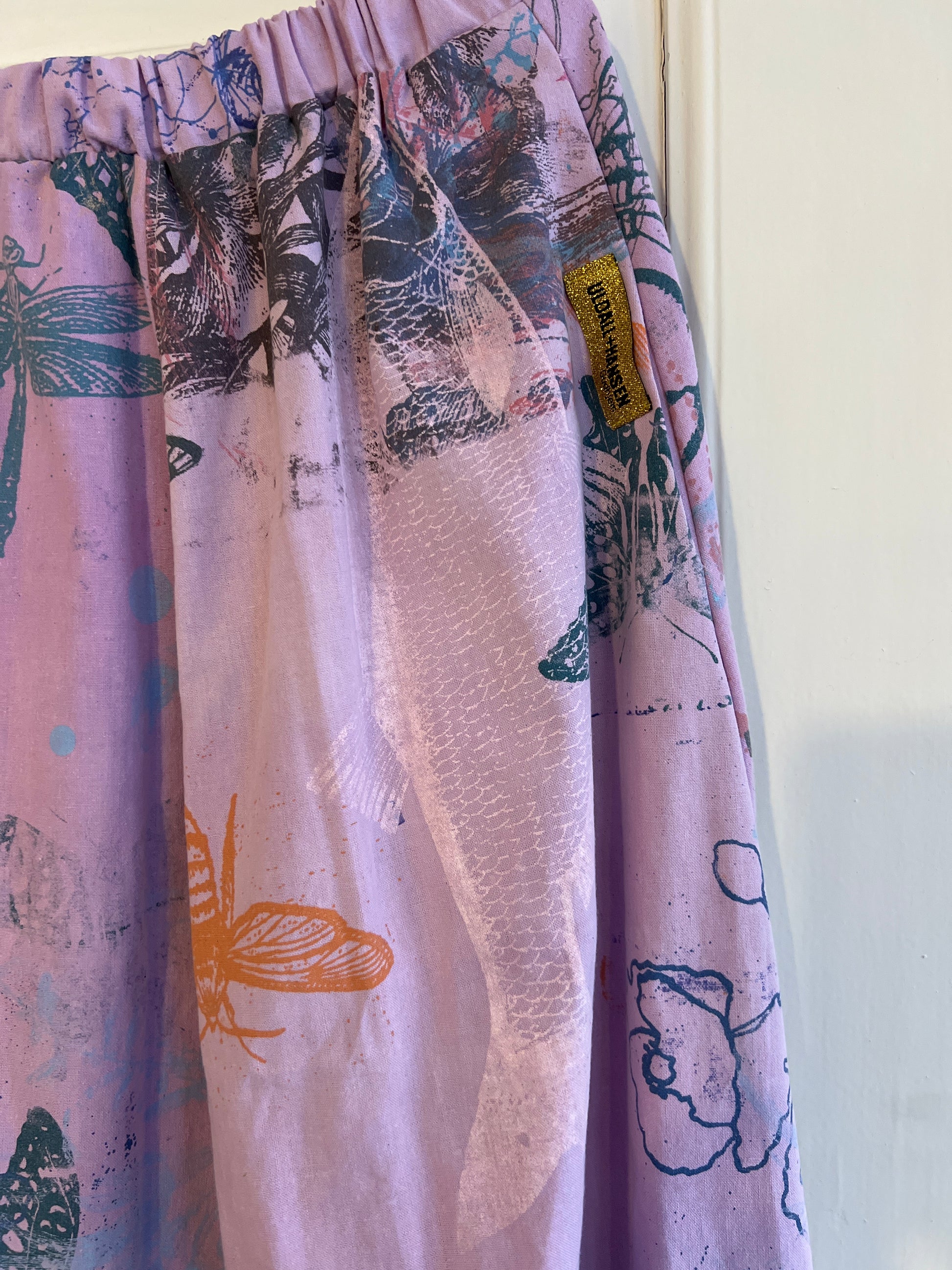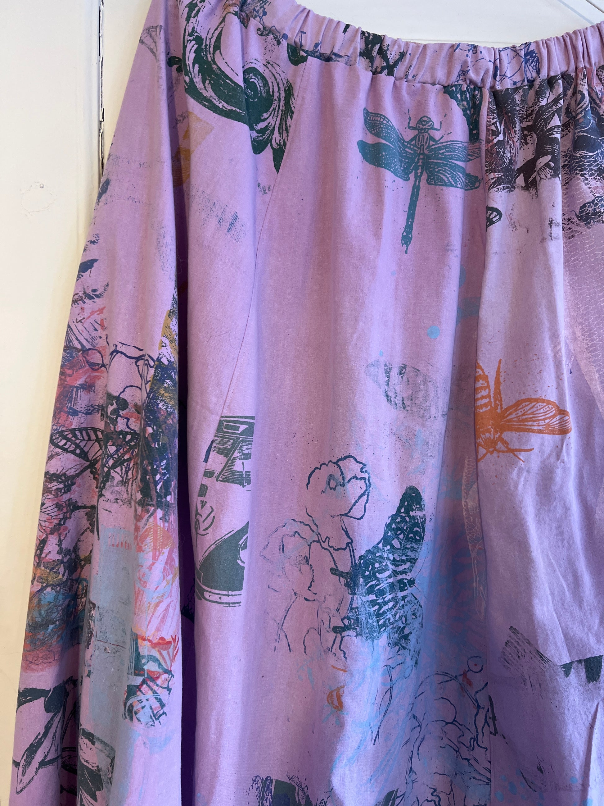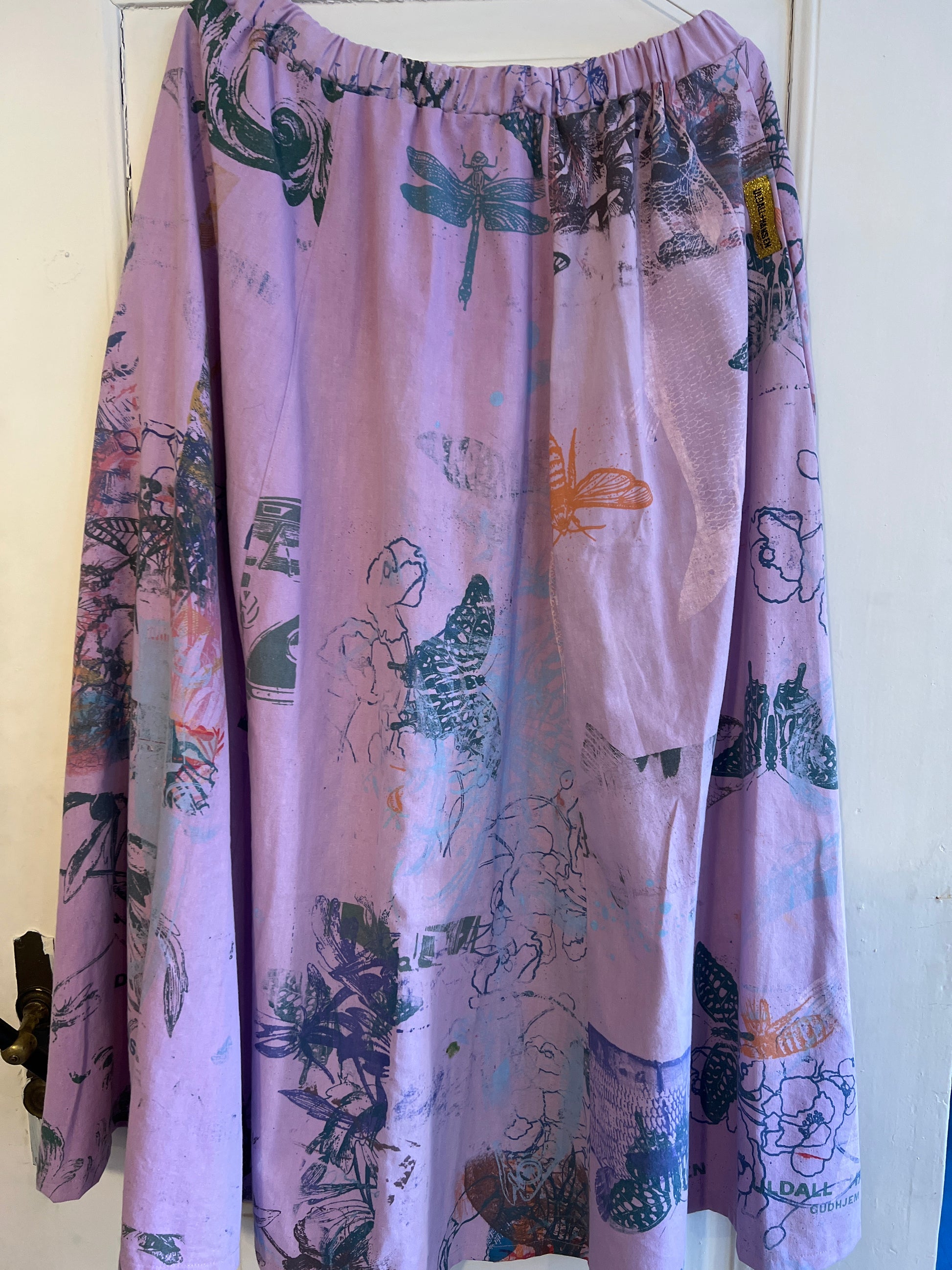 Skøn justerbar nederdel med lommer, længde 88 cm. Syet af upcyclede duge med unika håndtryk