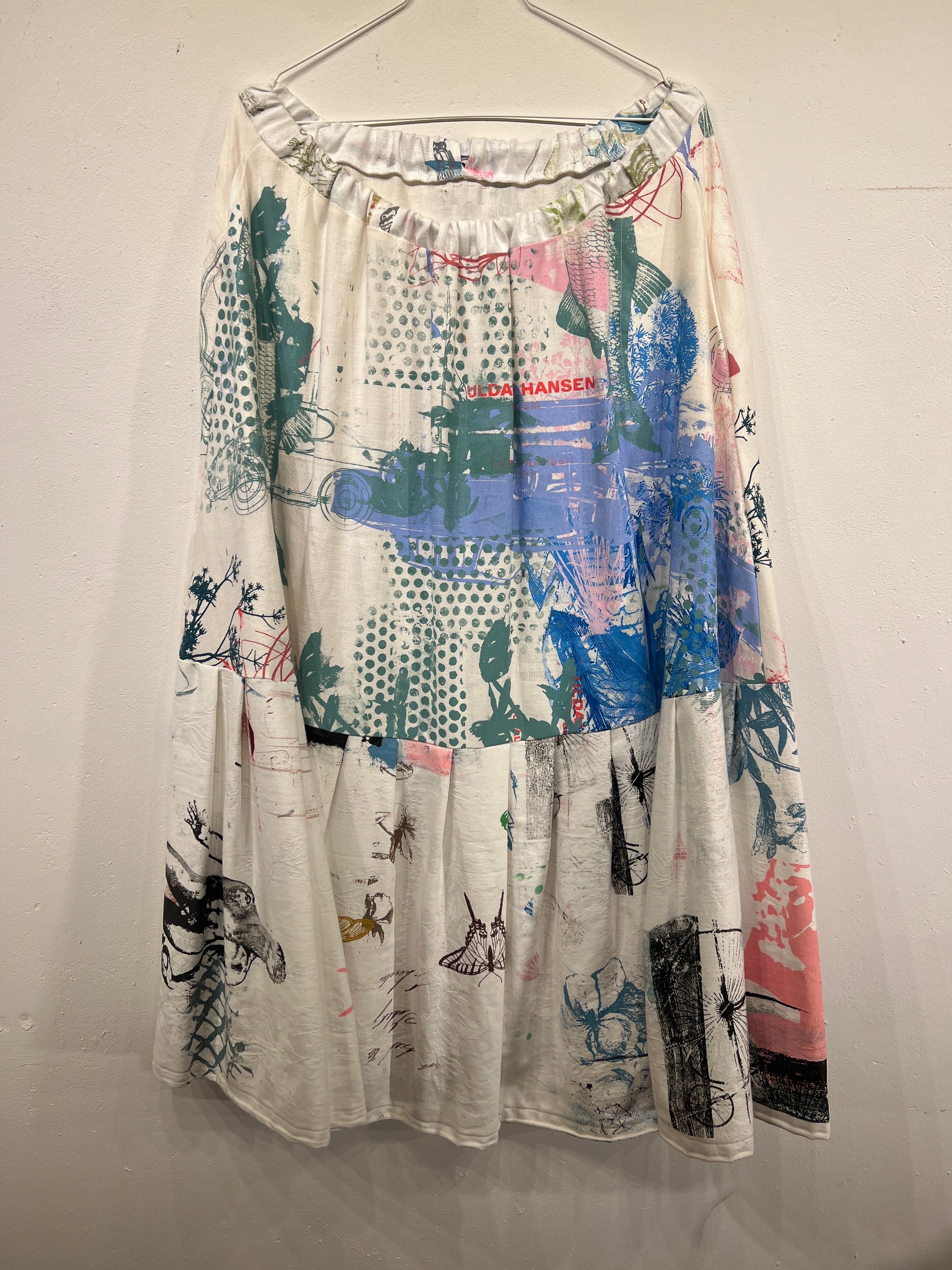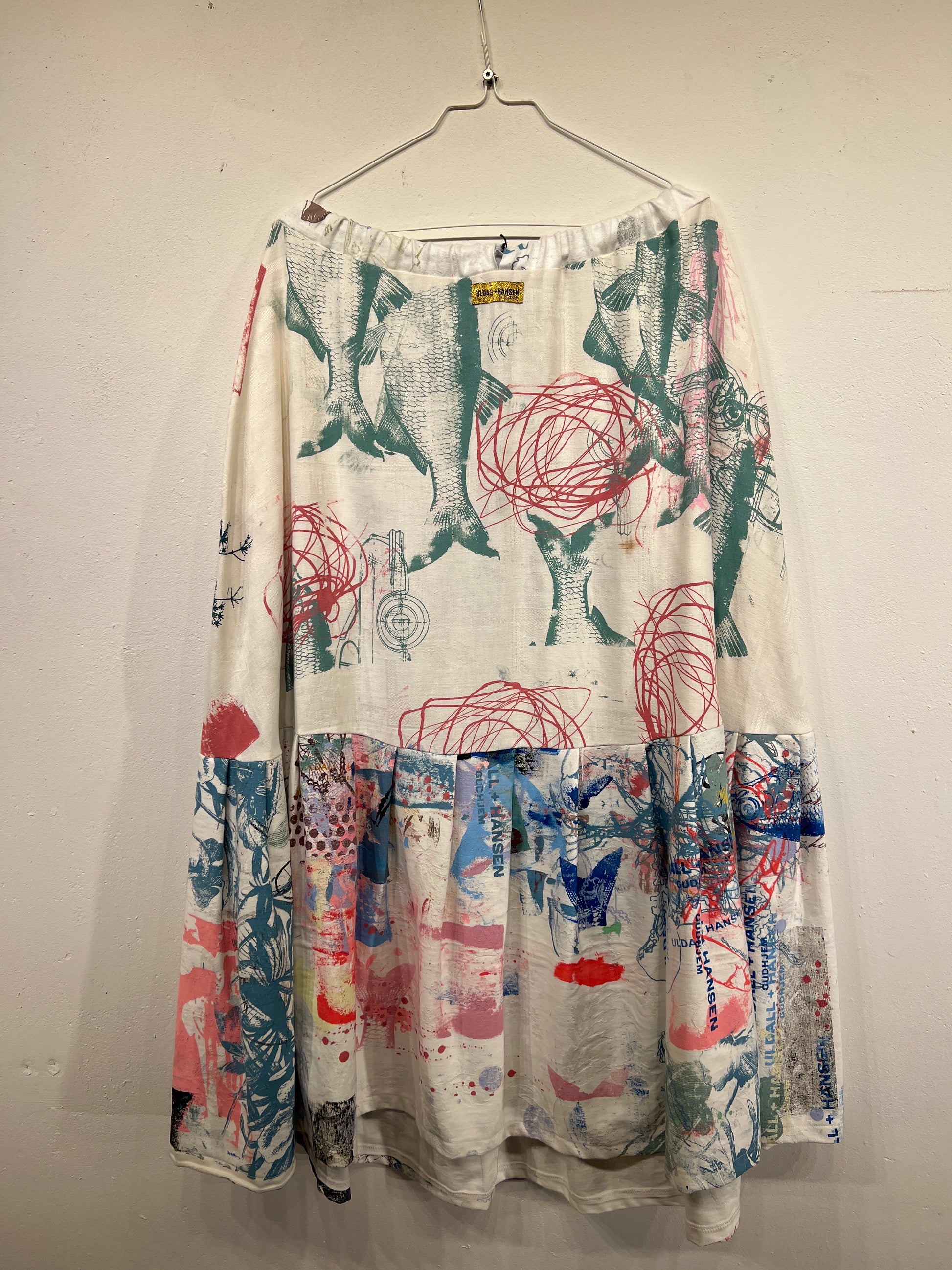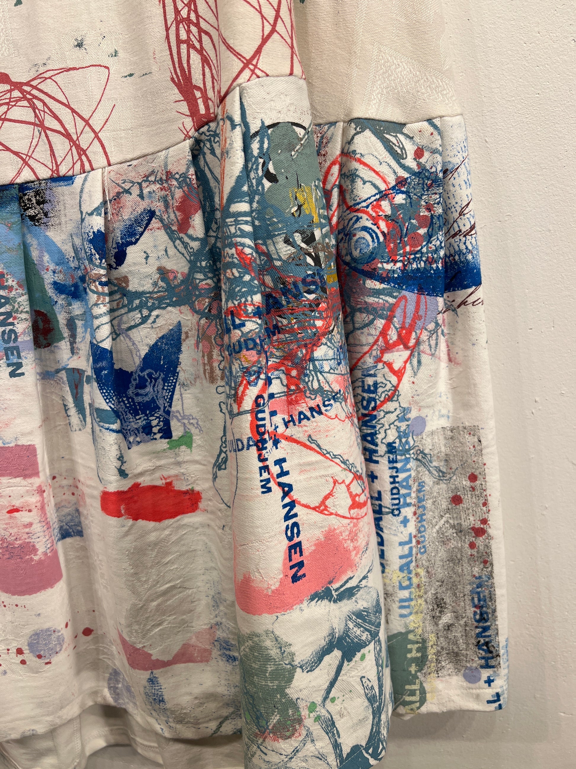 Skøn justerbar nederdel med lommer, længde 88 cm. Syet af upcyclede duge med unika håndtryk