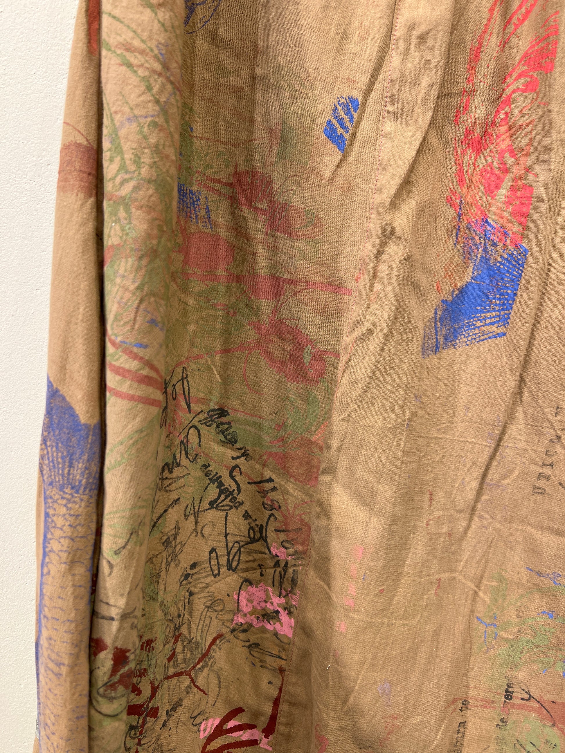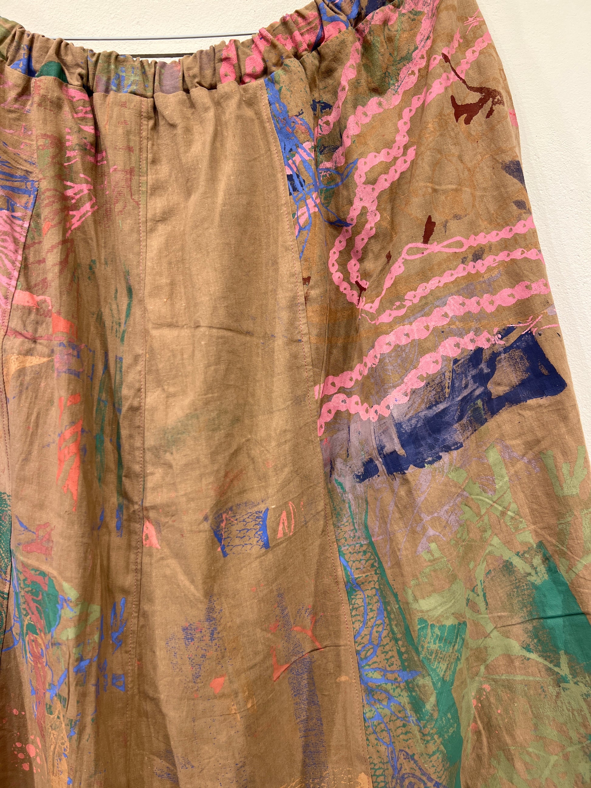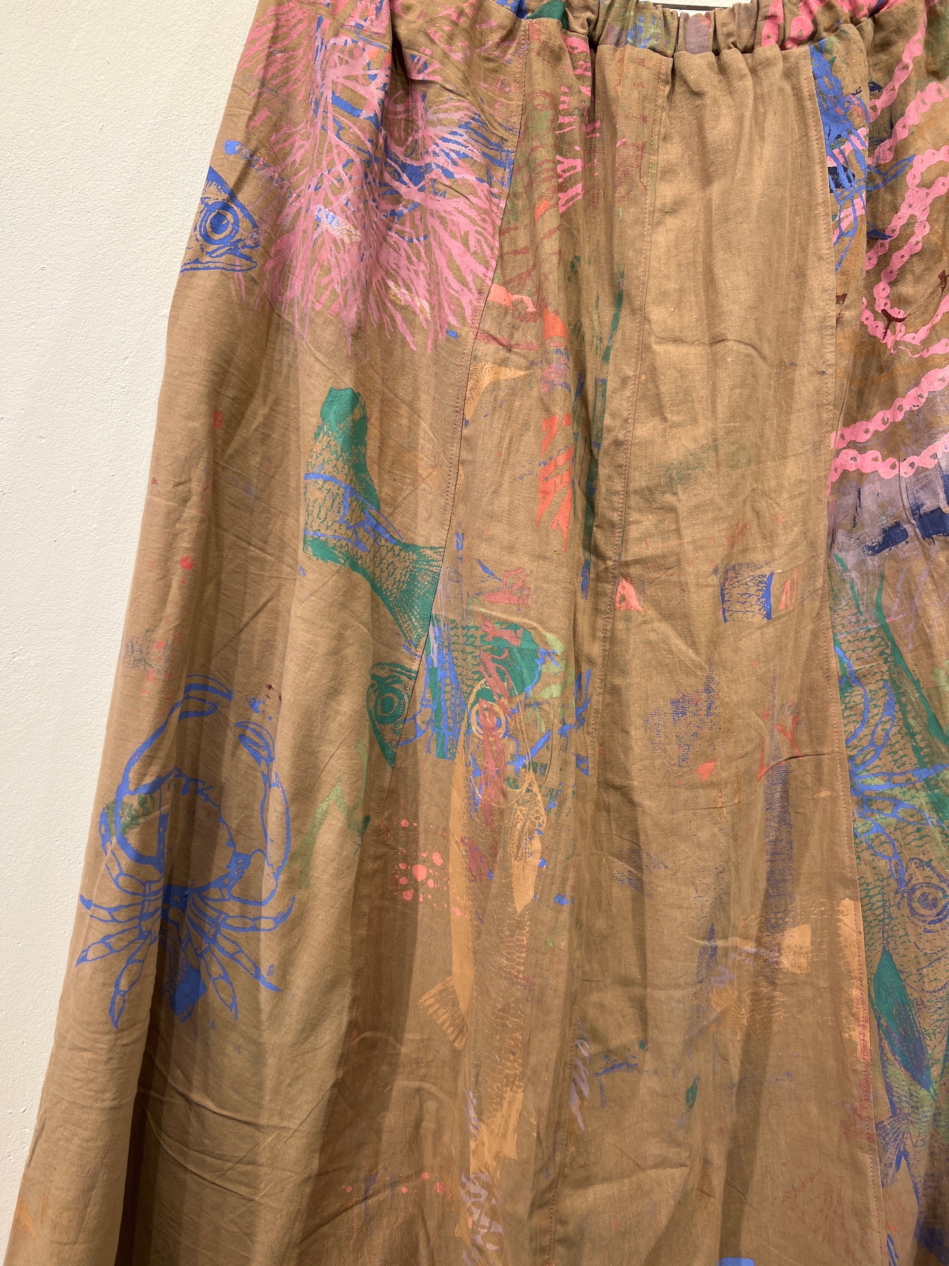 Skøn justerbar nederdel med lommer, ca længde 88 cm. Syet af upcyclede duge med unika håndtryk