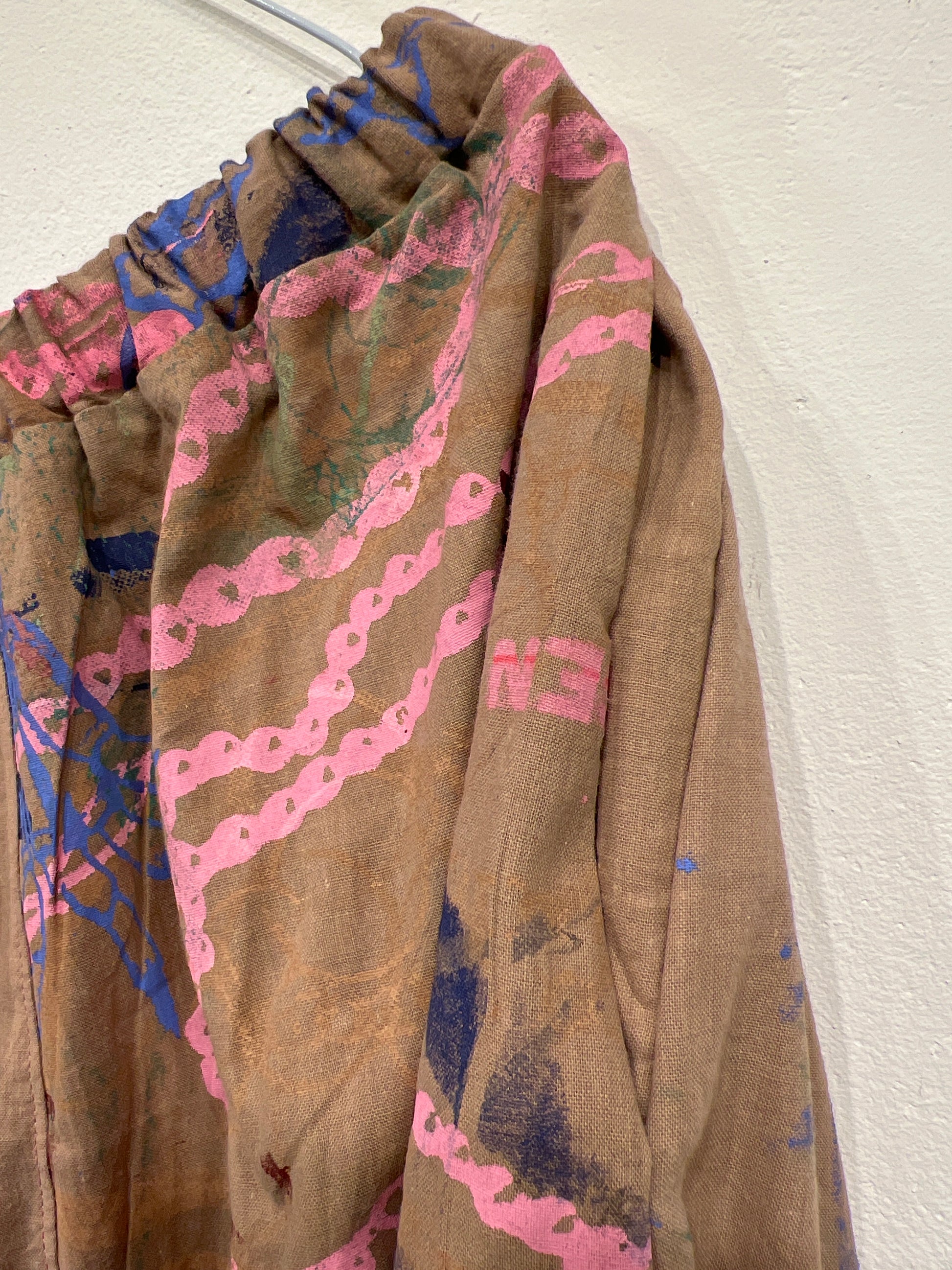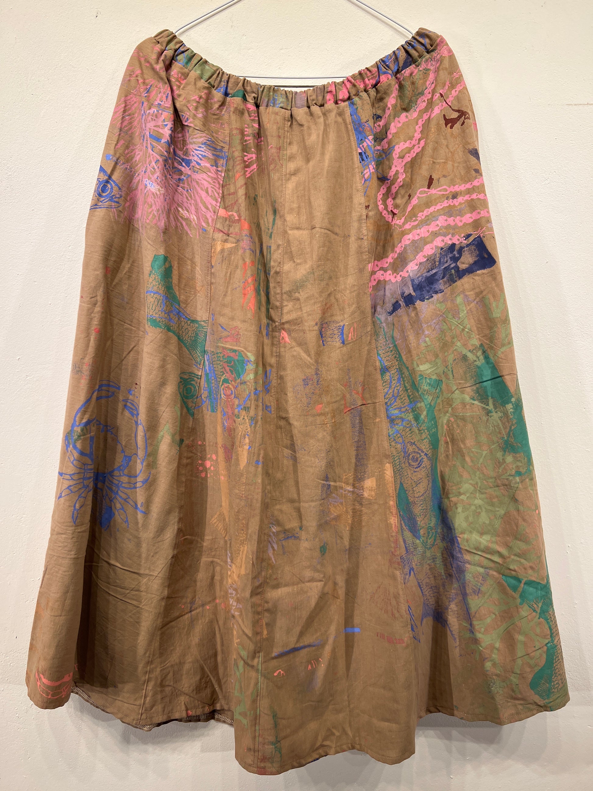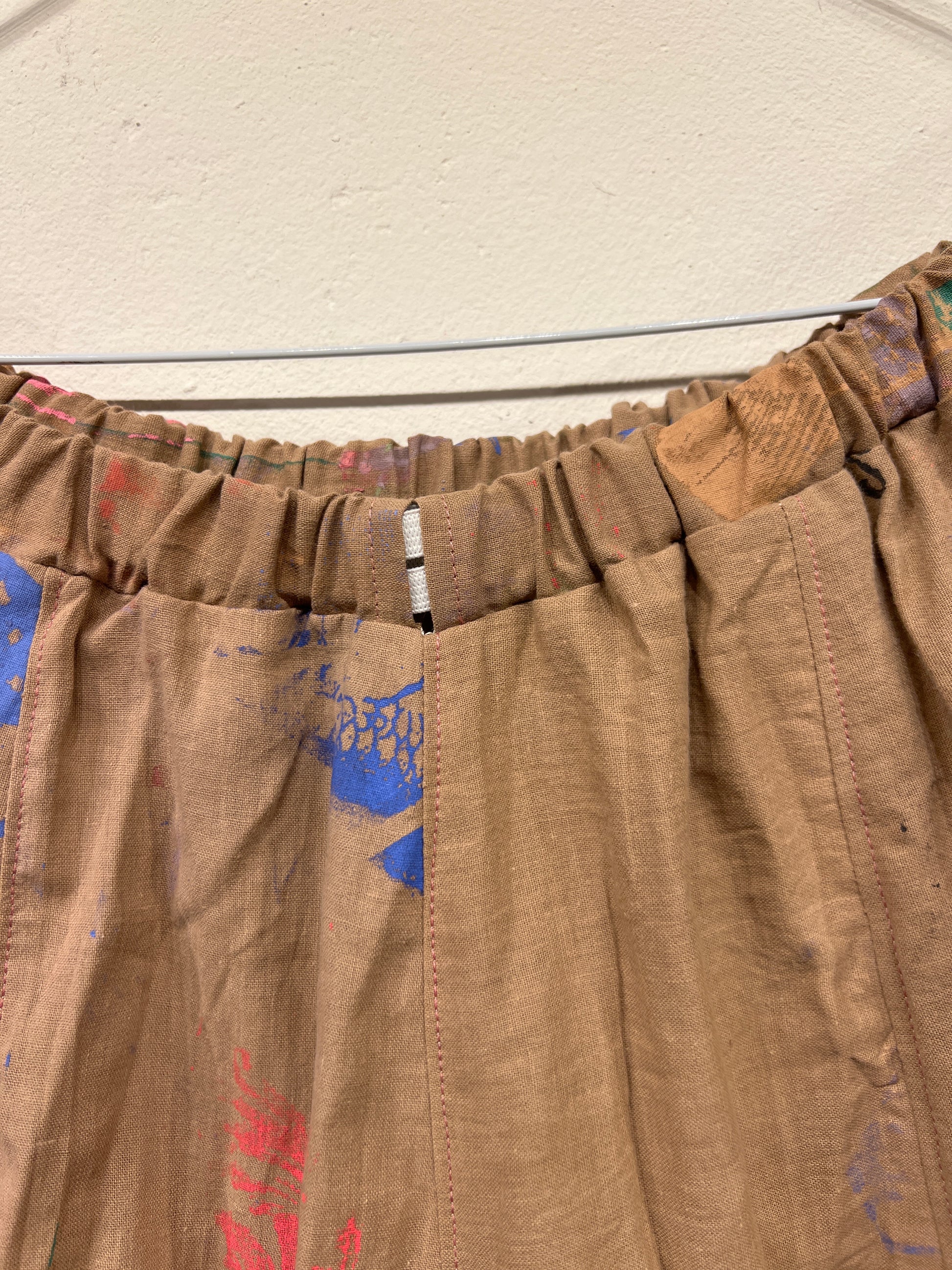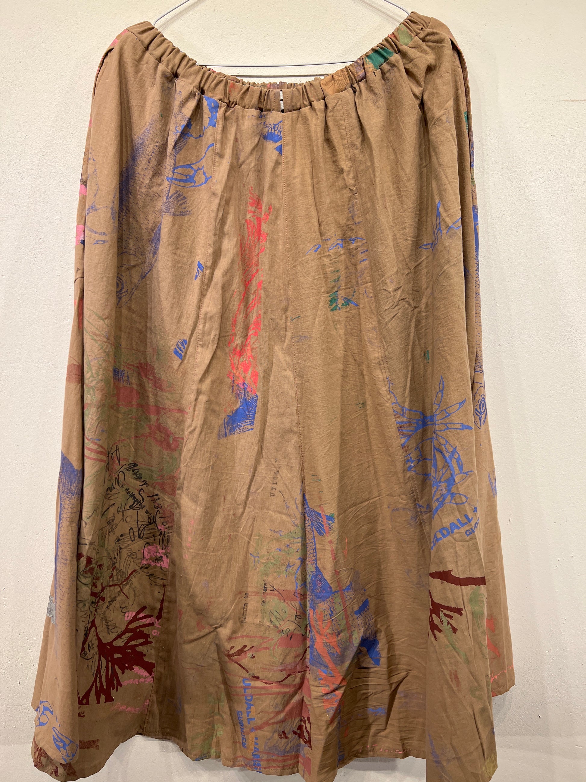 Skøn justerbar nederdel med lommer, ca længde 88 cm. Syet af upcyclede duge med unika håndtryk