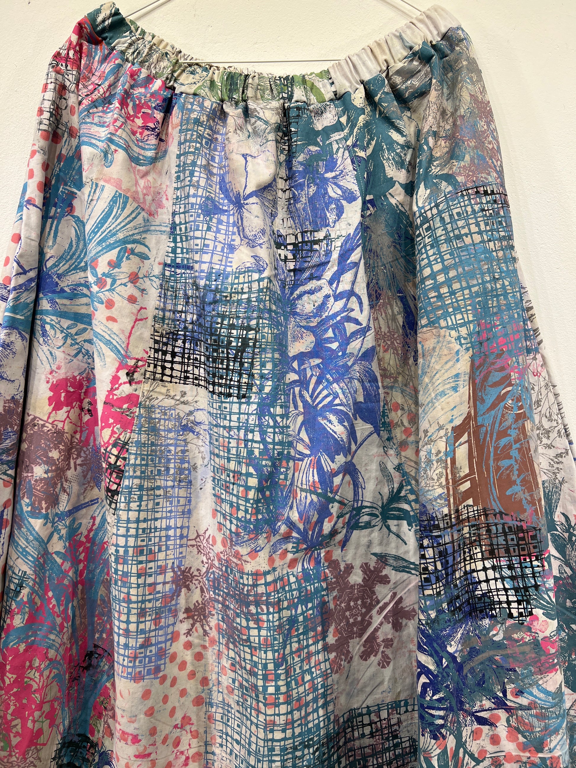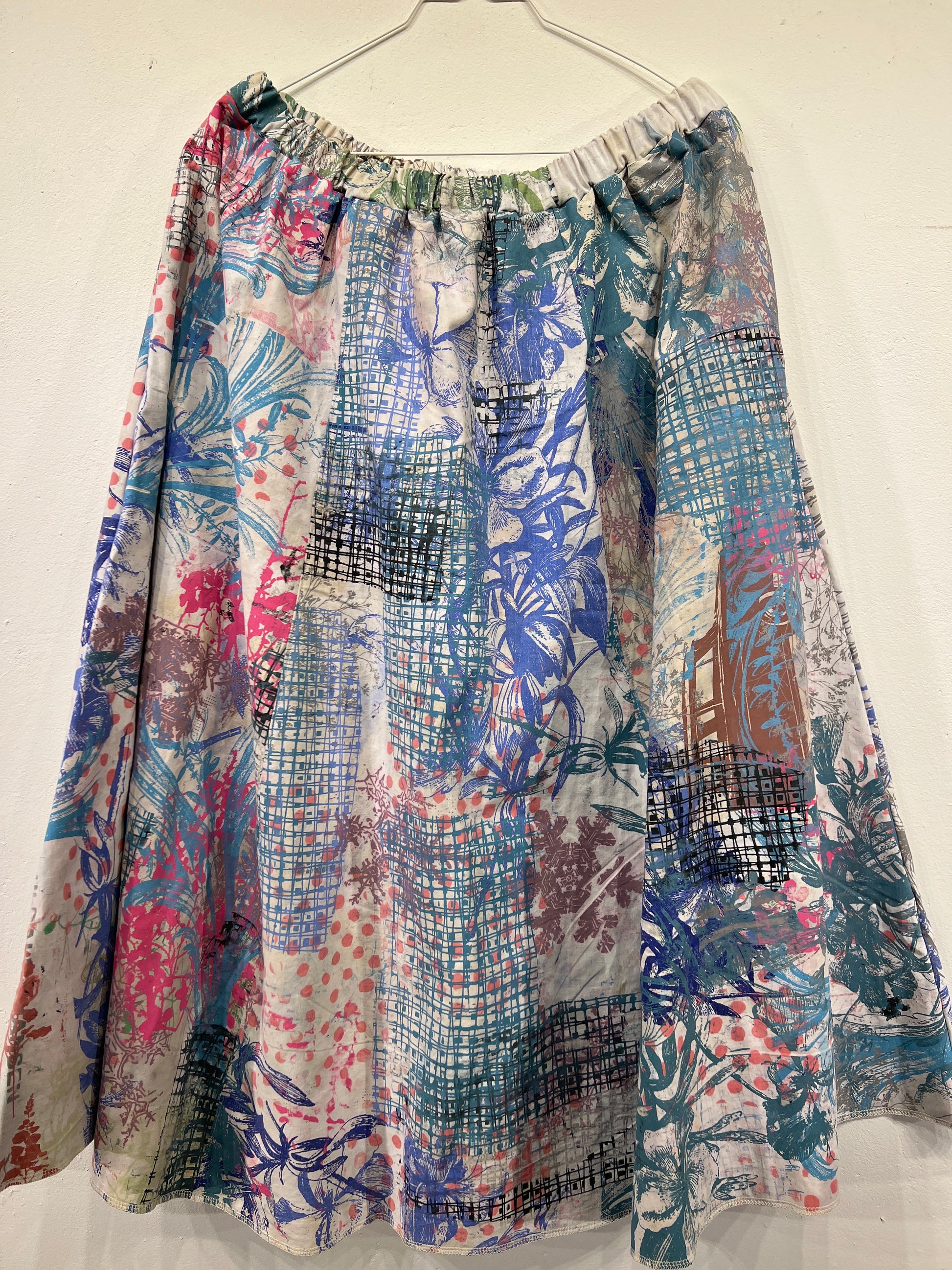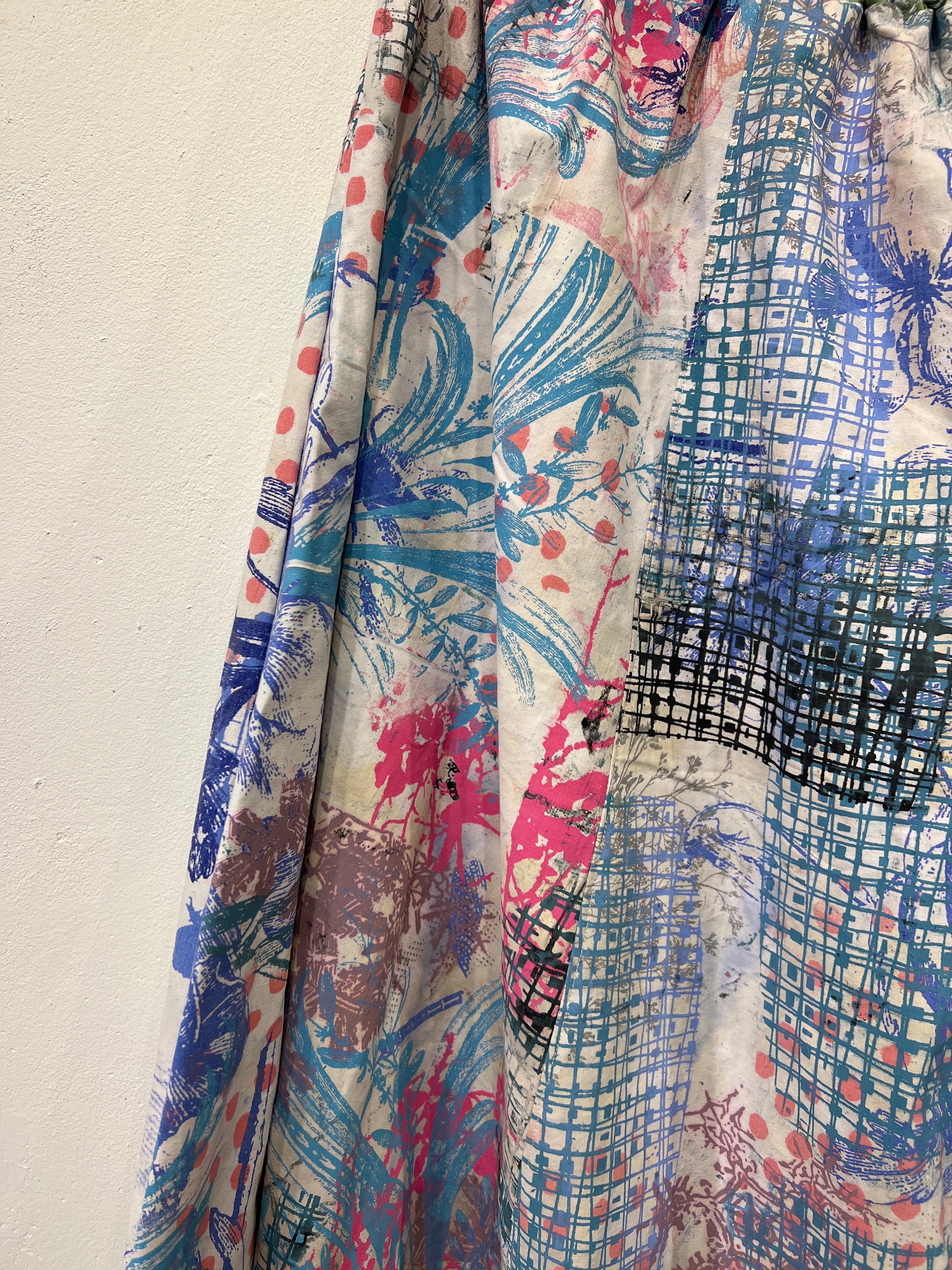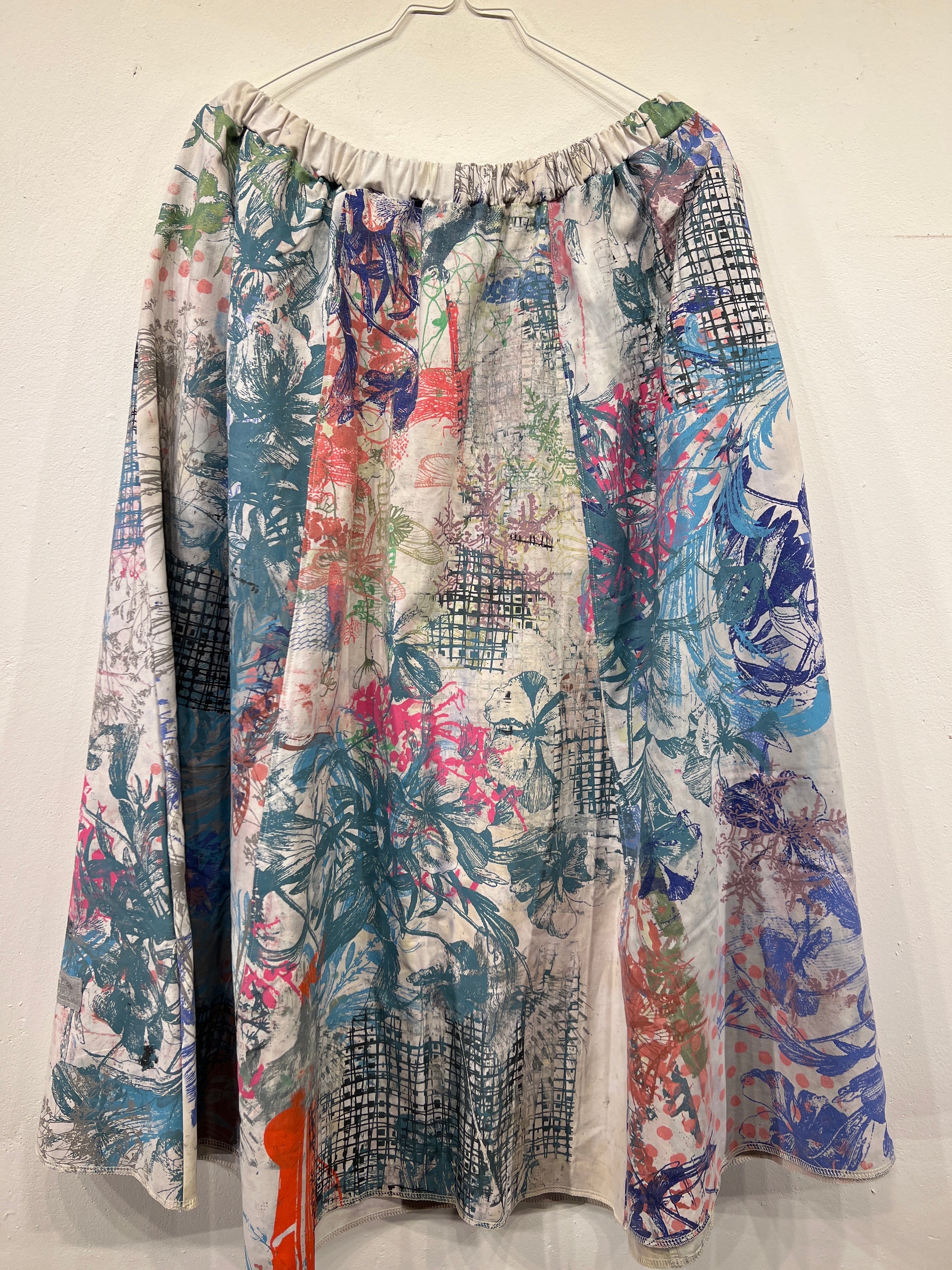 Skøn justerbar nederdel med lommer, ca længde 88 cm. Syet af upcyclede duge med unika håndtryk