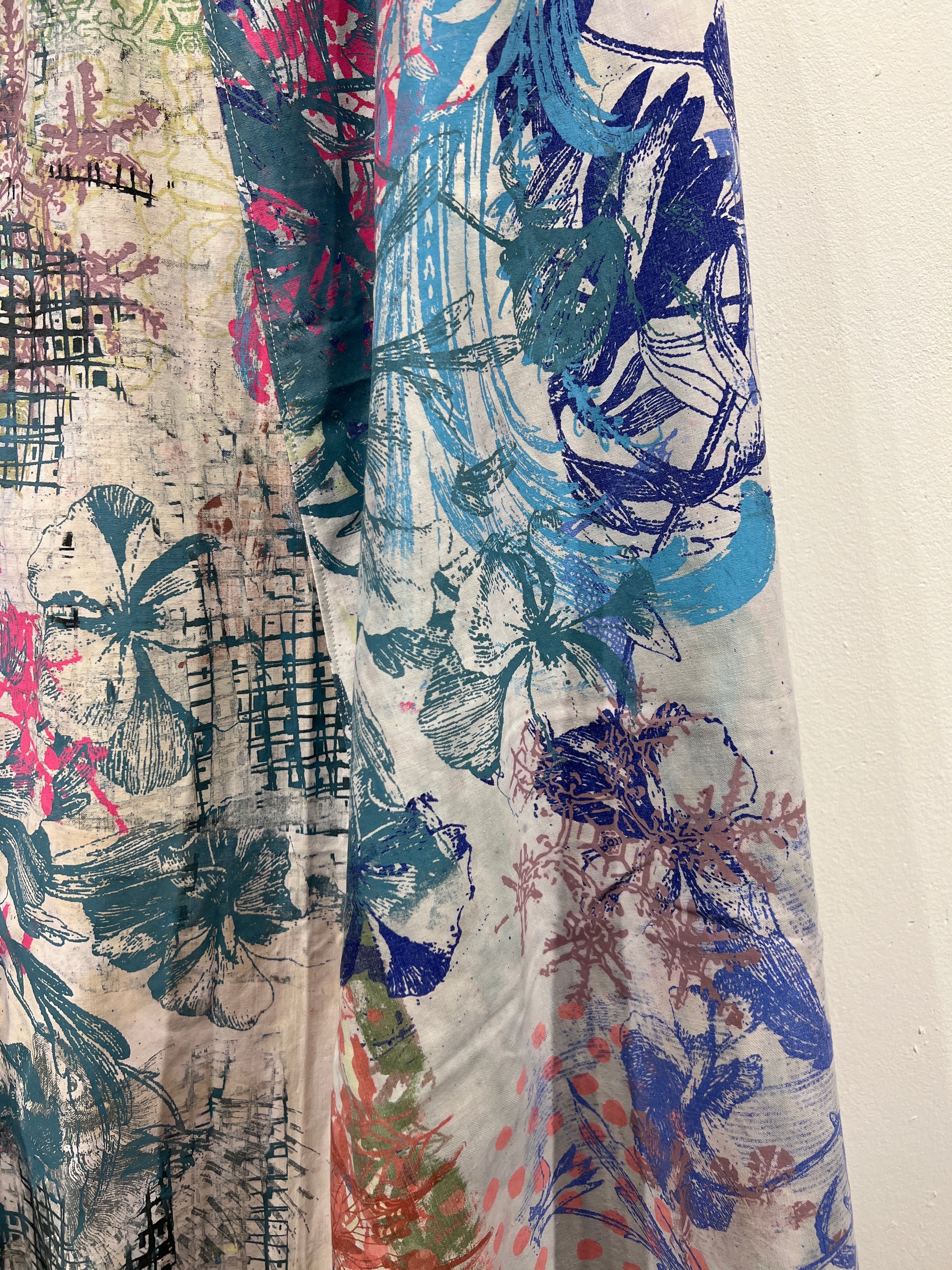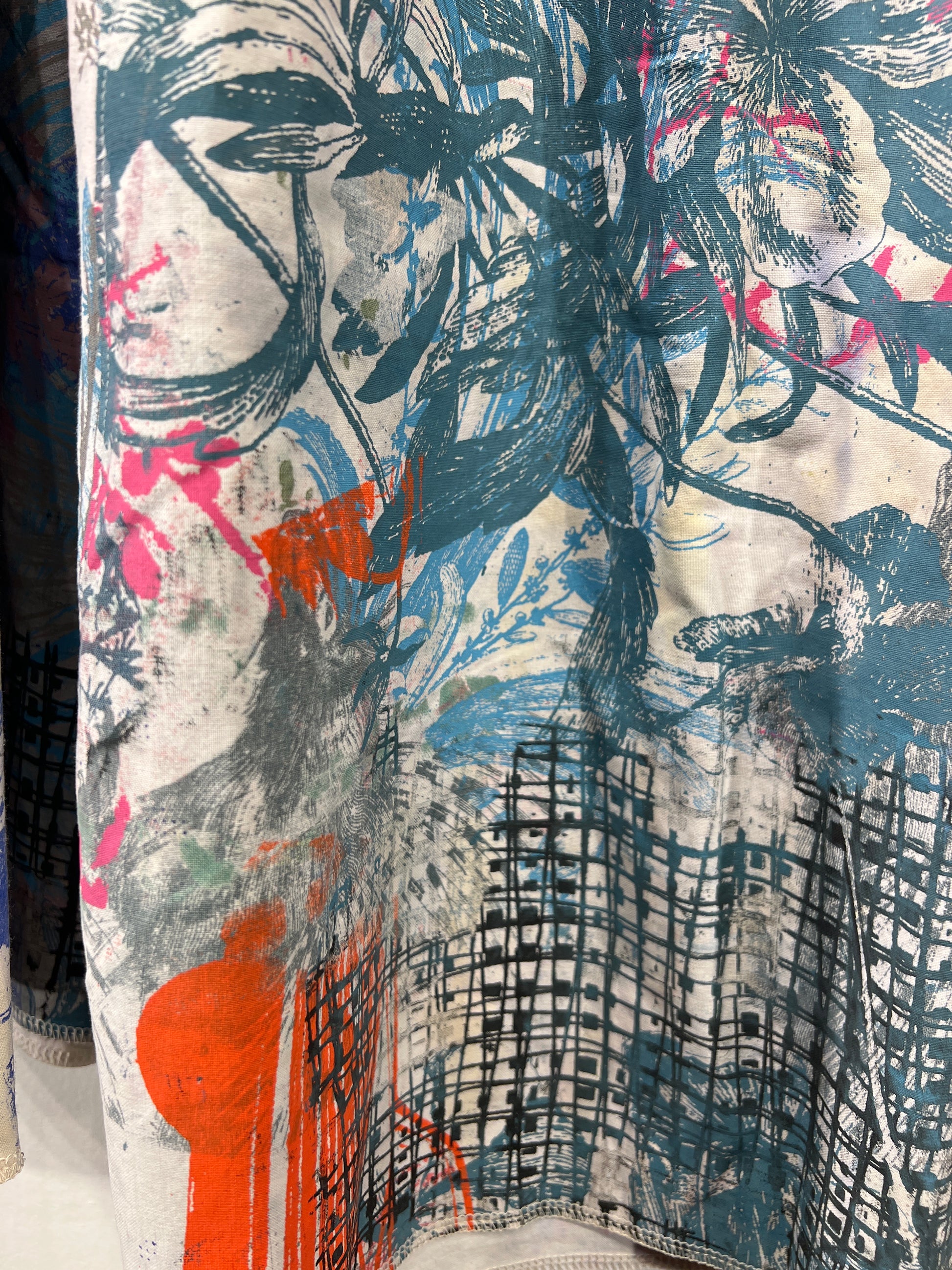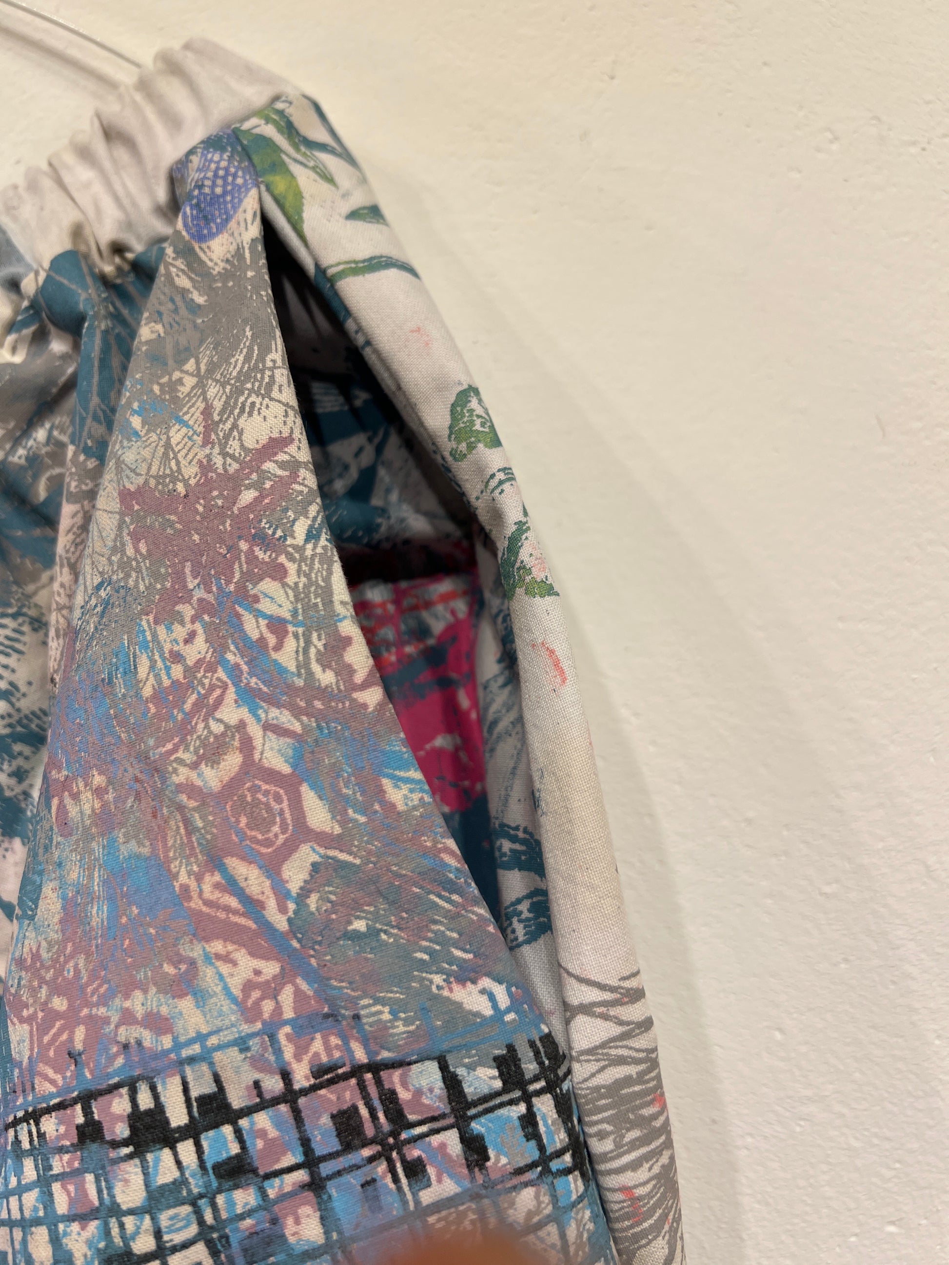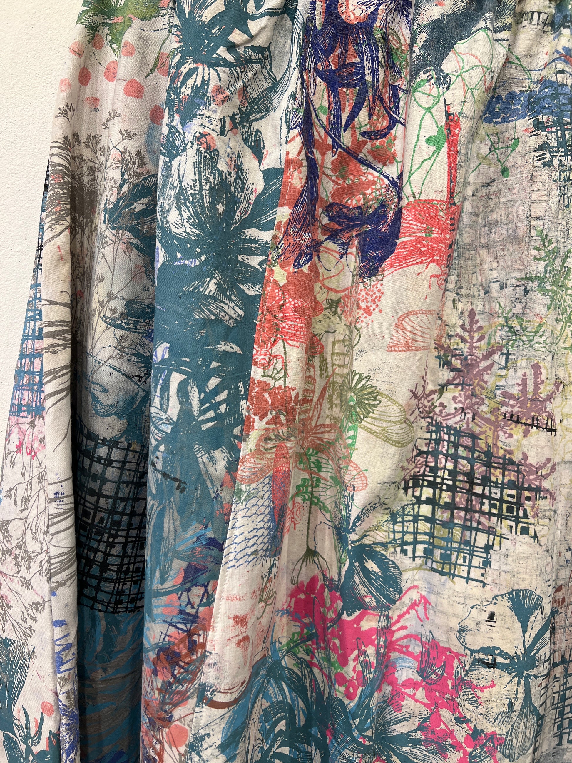 Skøn justerbar nederdel med lommer, ca længde 88 cm. Syet af upcyclede duge med unika håndtryk