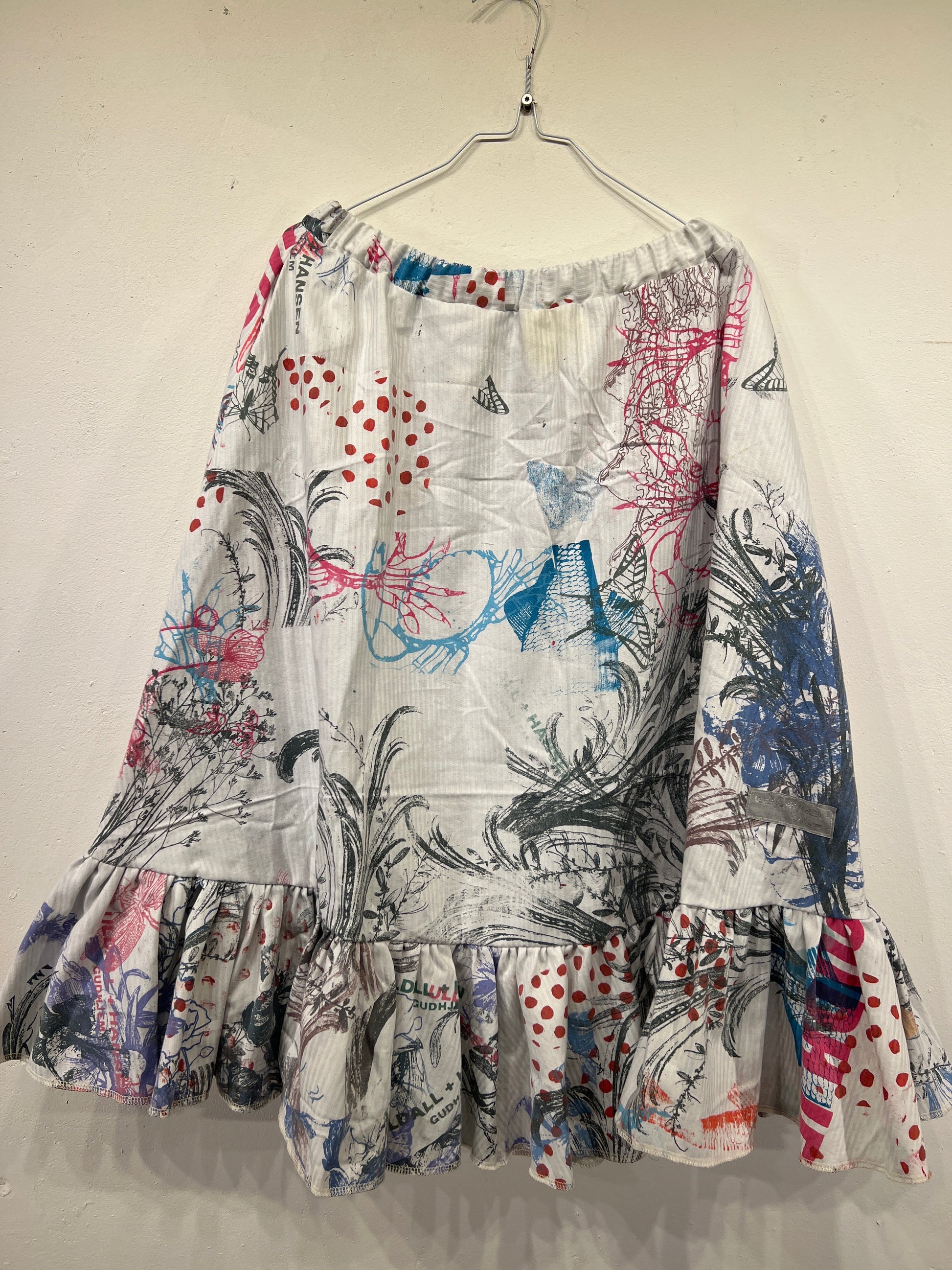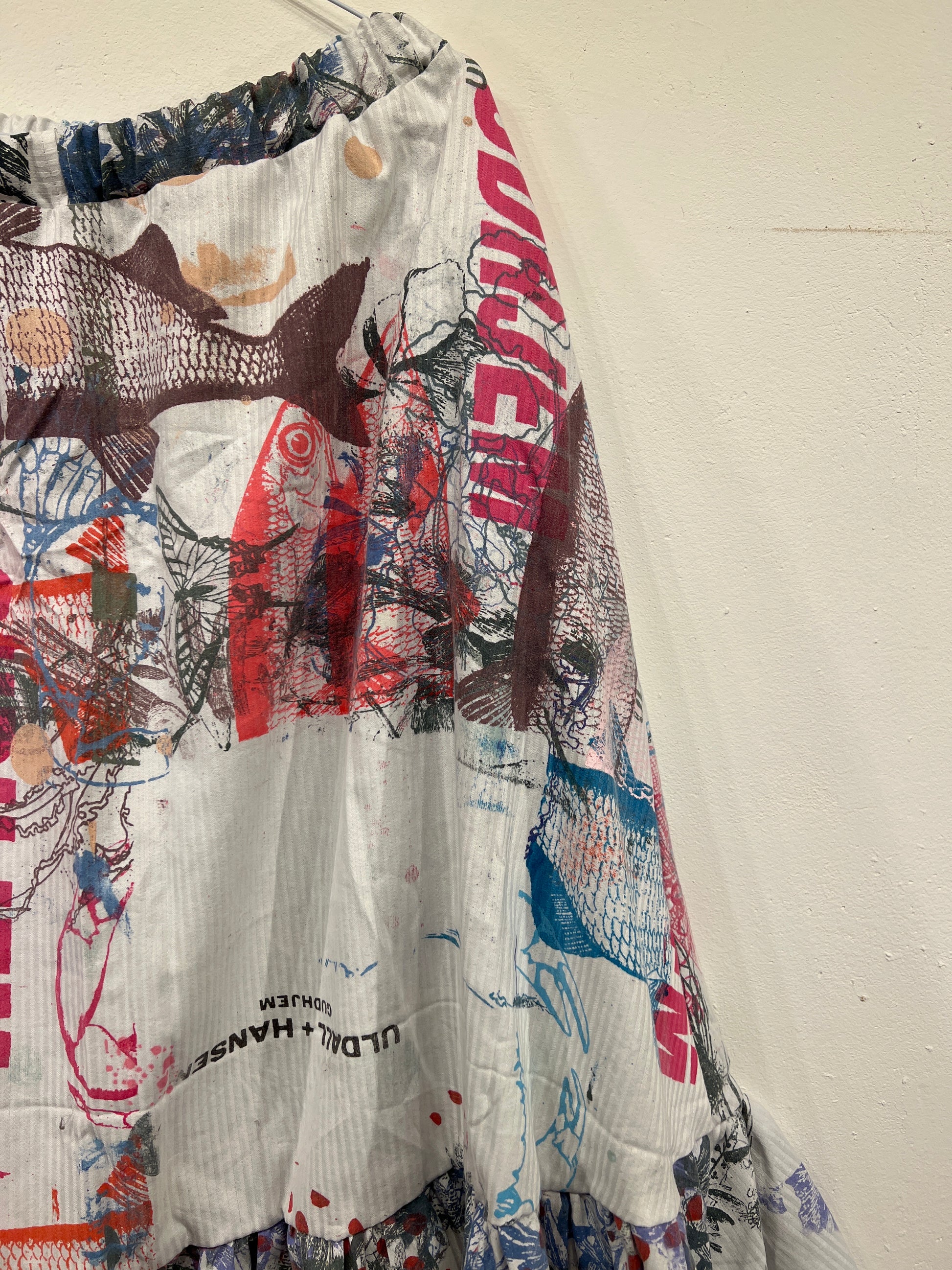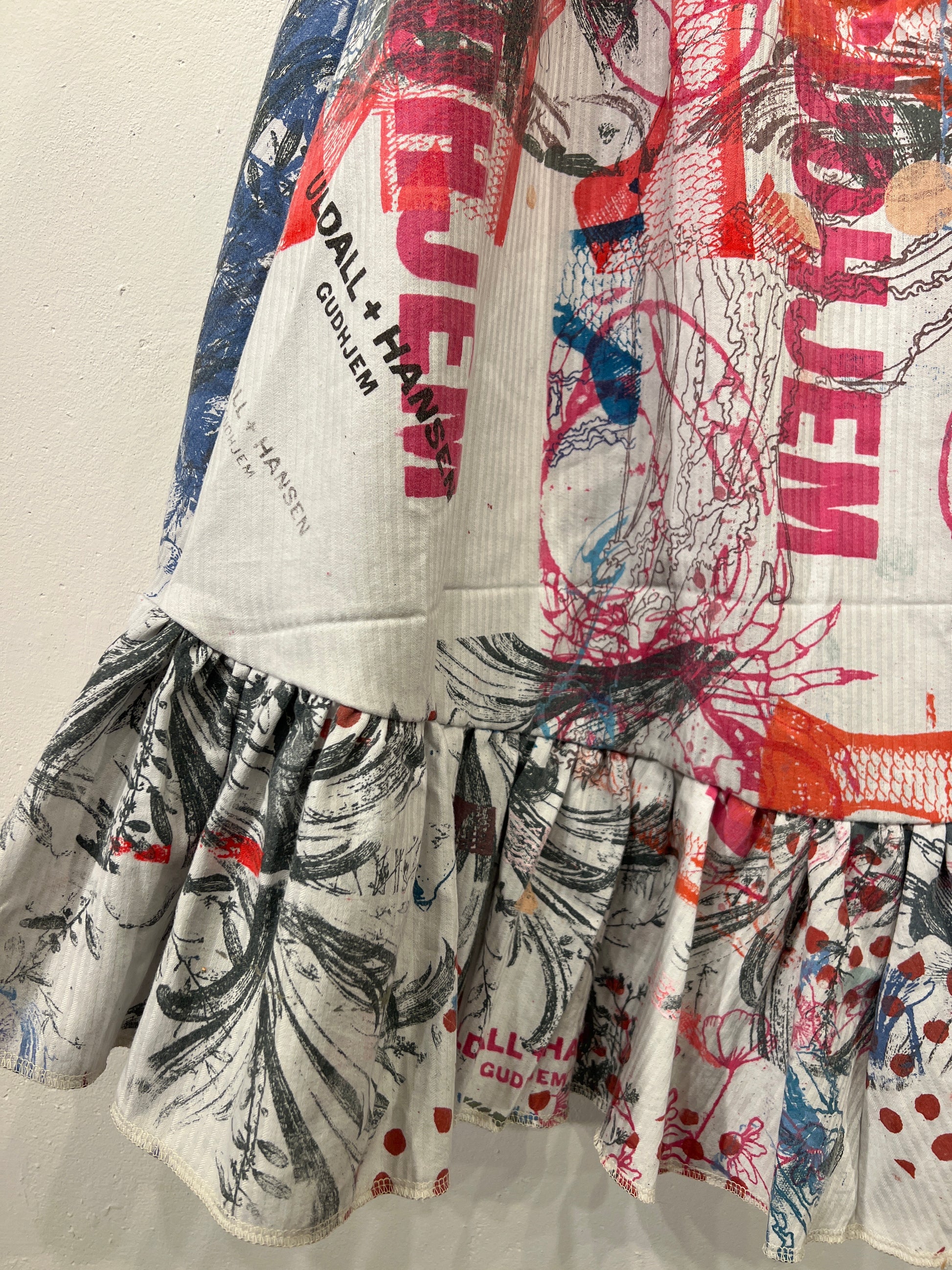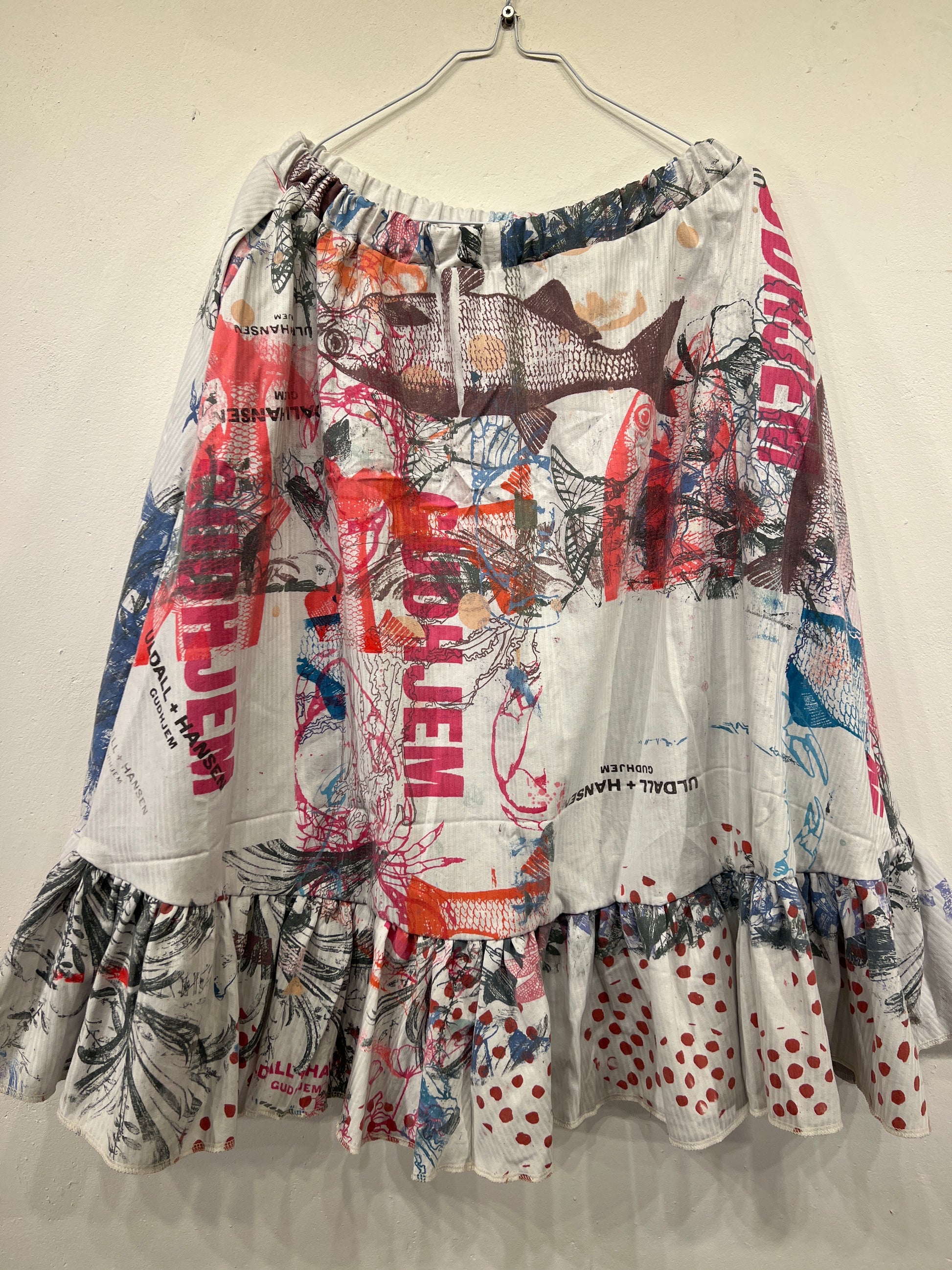 Skøn justerbar nederdel med lommer, ca længde 88 cm. Syet af upcyclede duge med unika håndtryk
