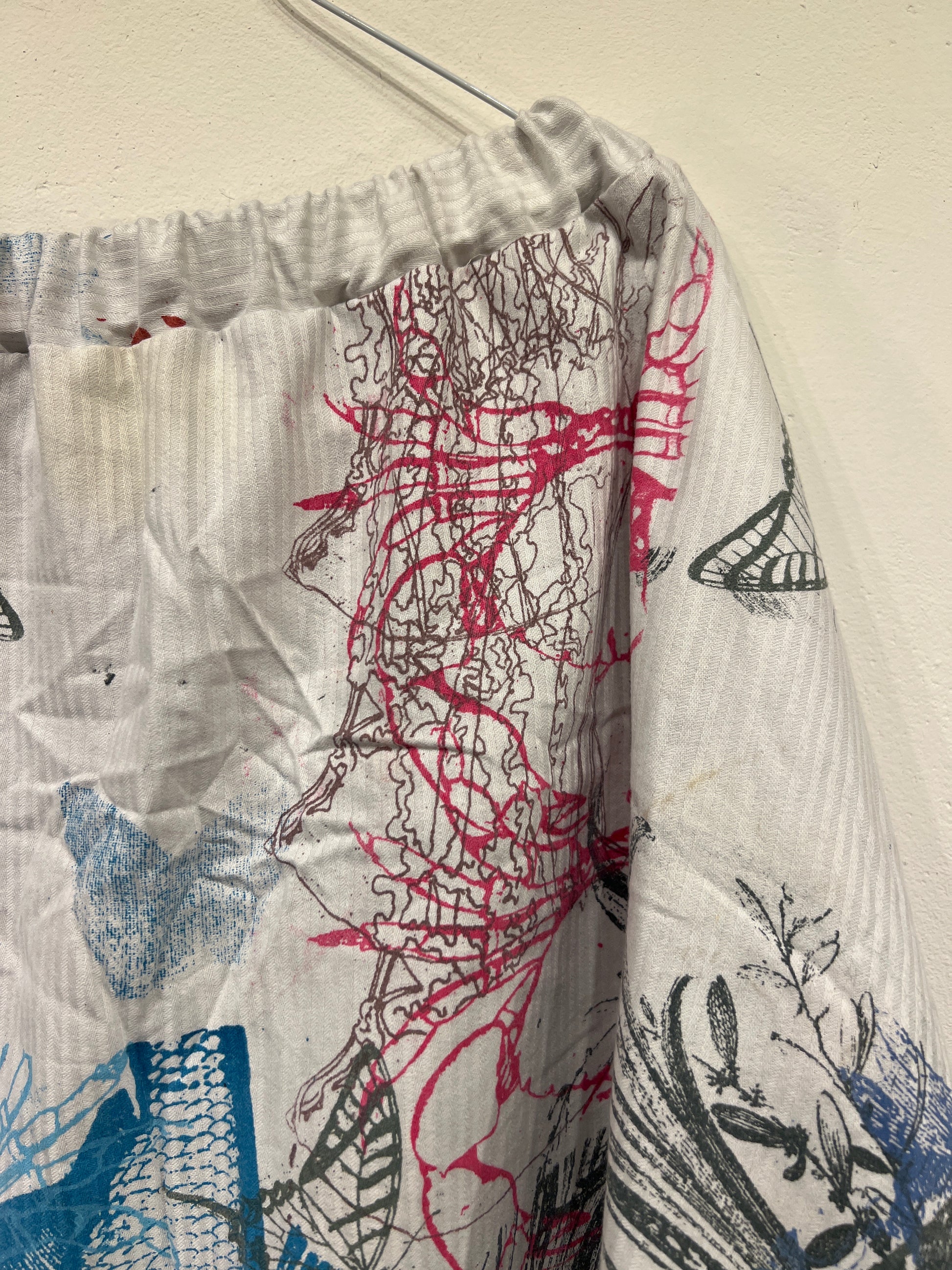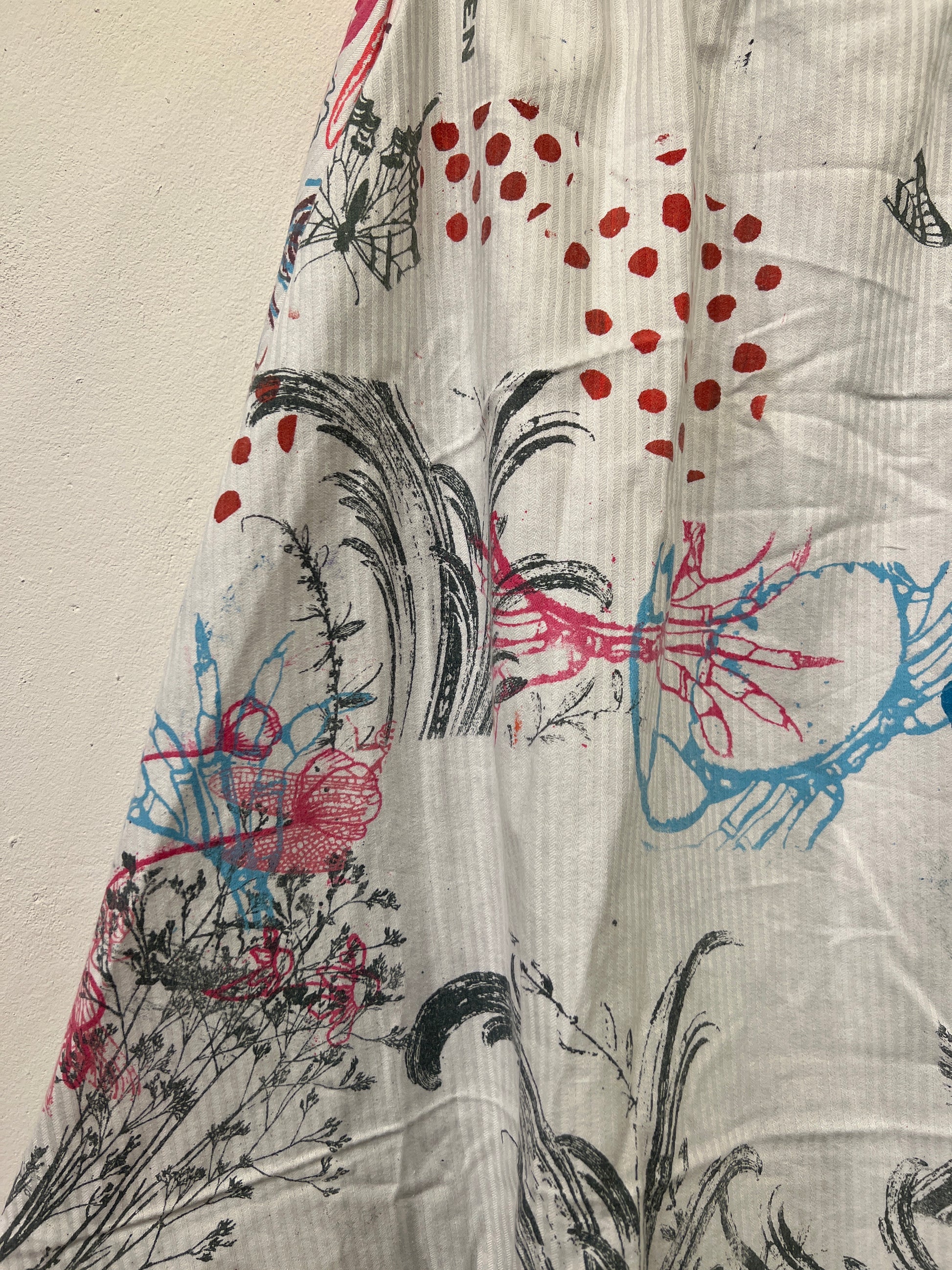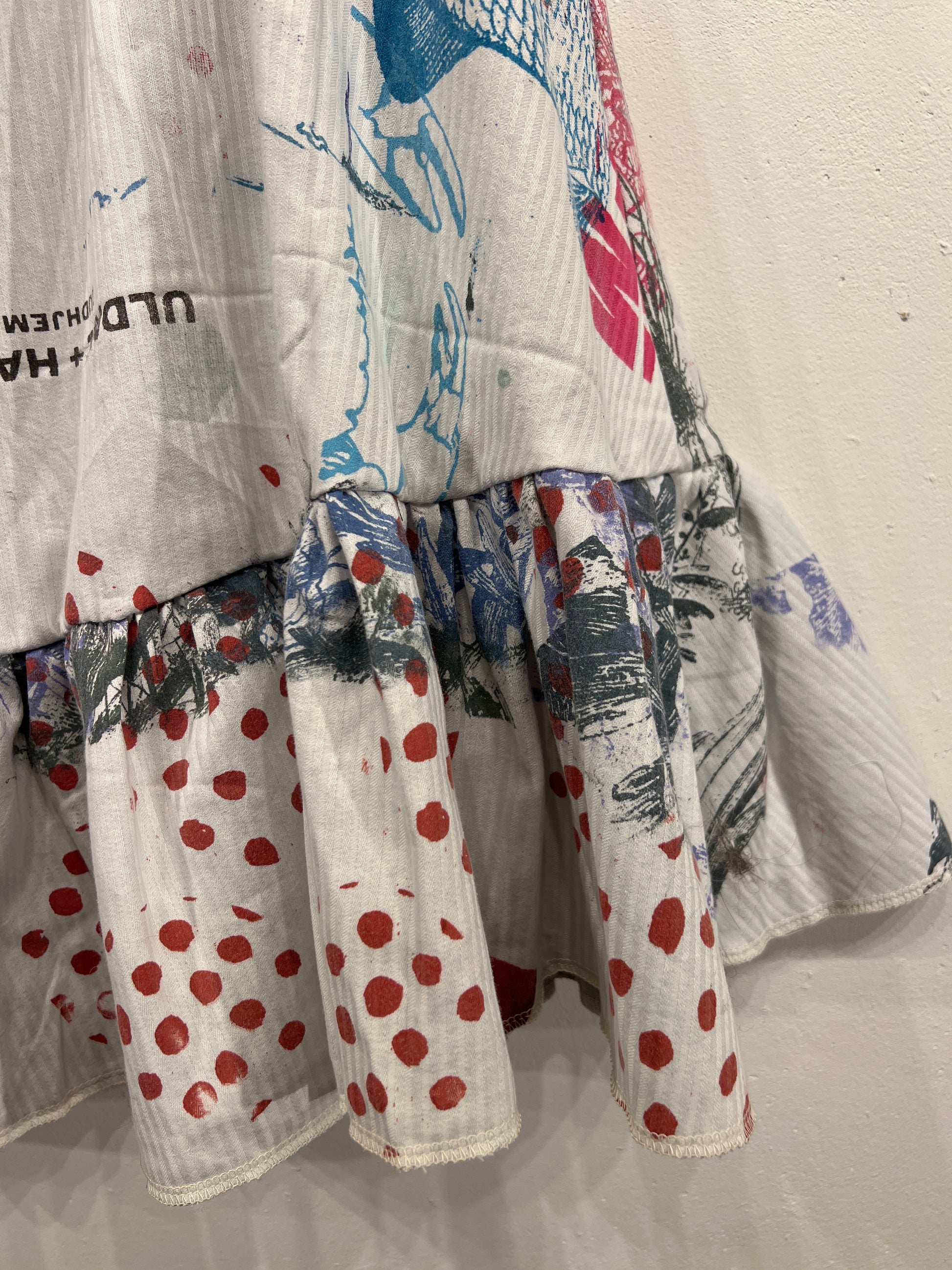 Skøn justerbar nederdel med lommer, ca længde 88 cm. Syet af upcyclede duge med unika håndtryk