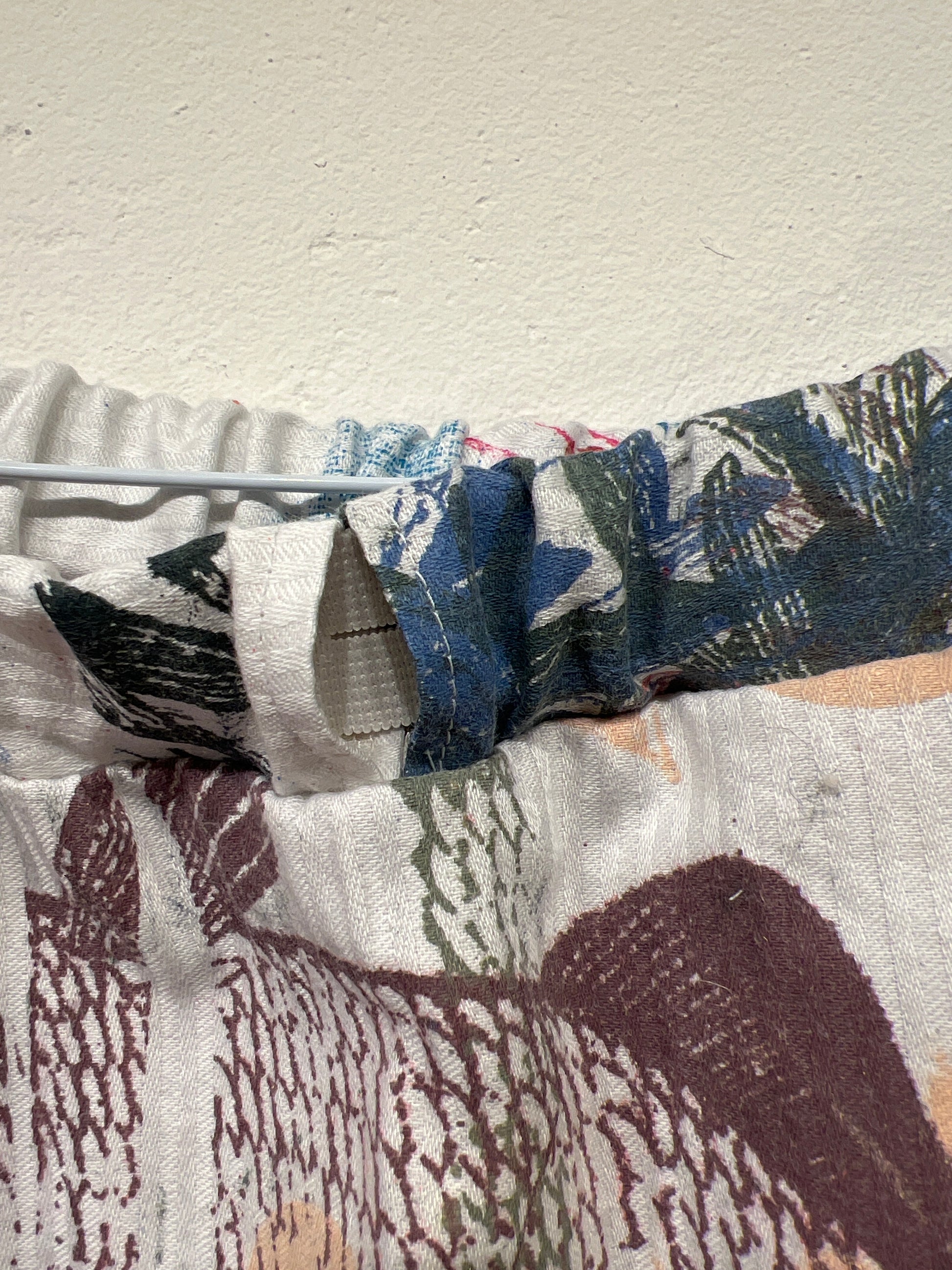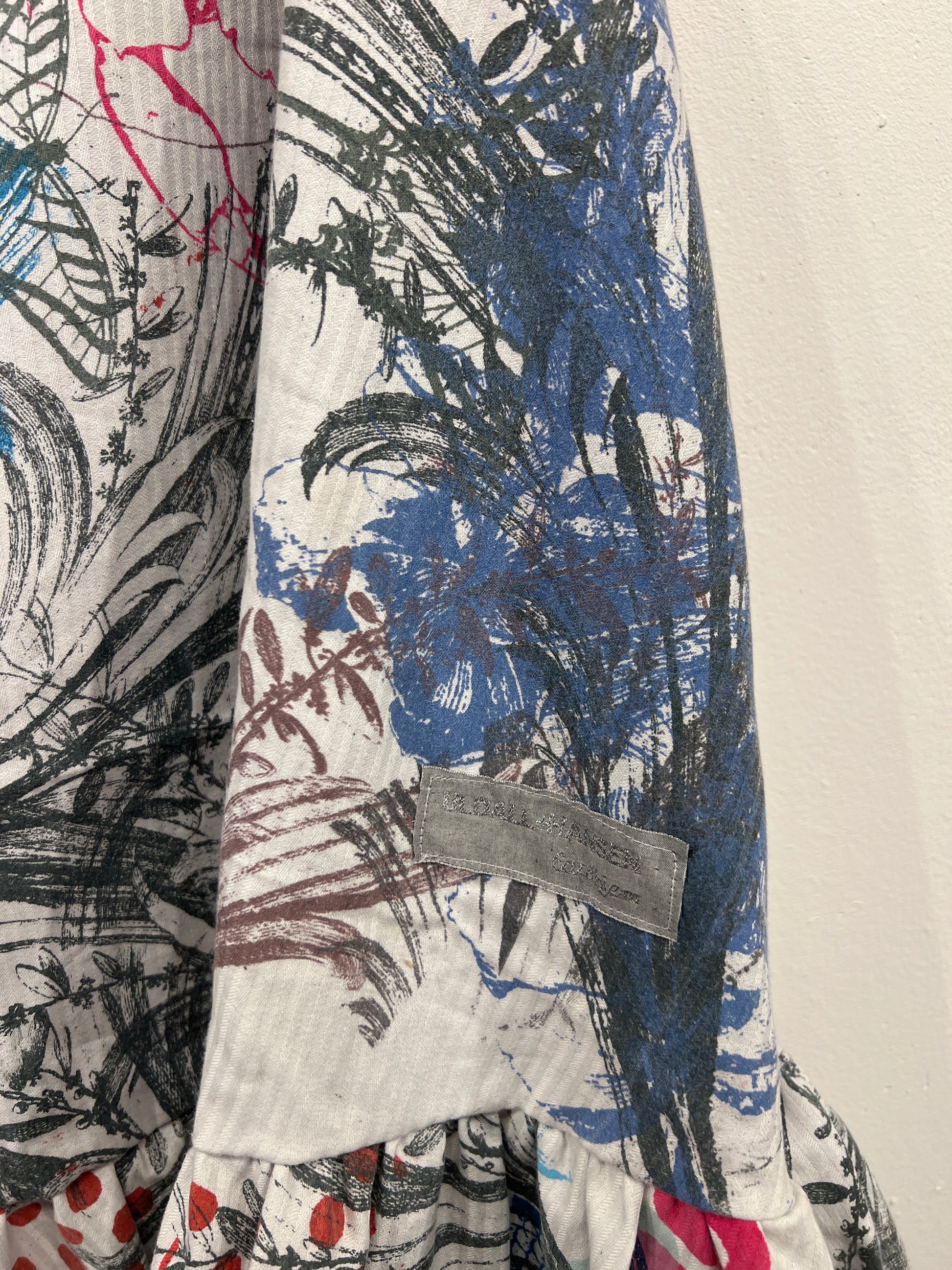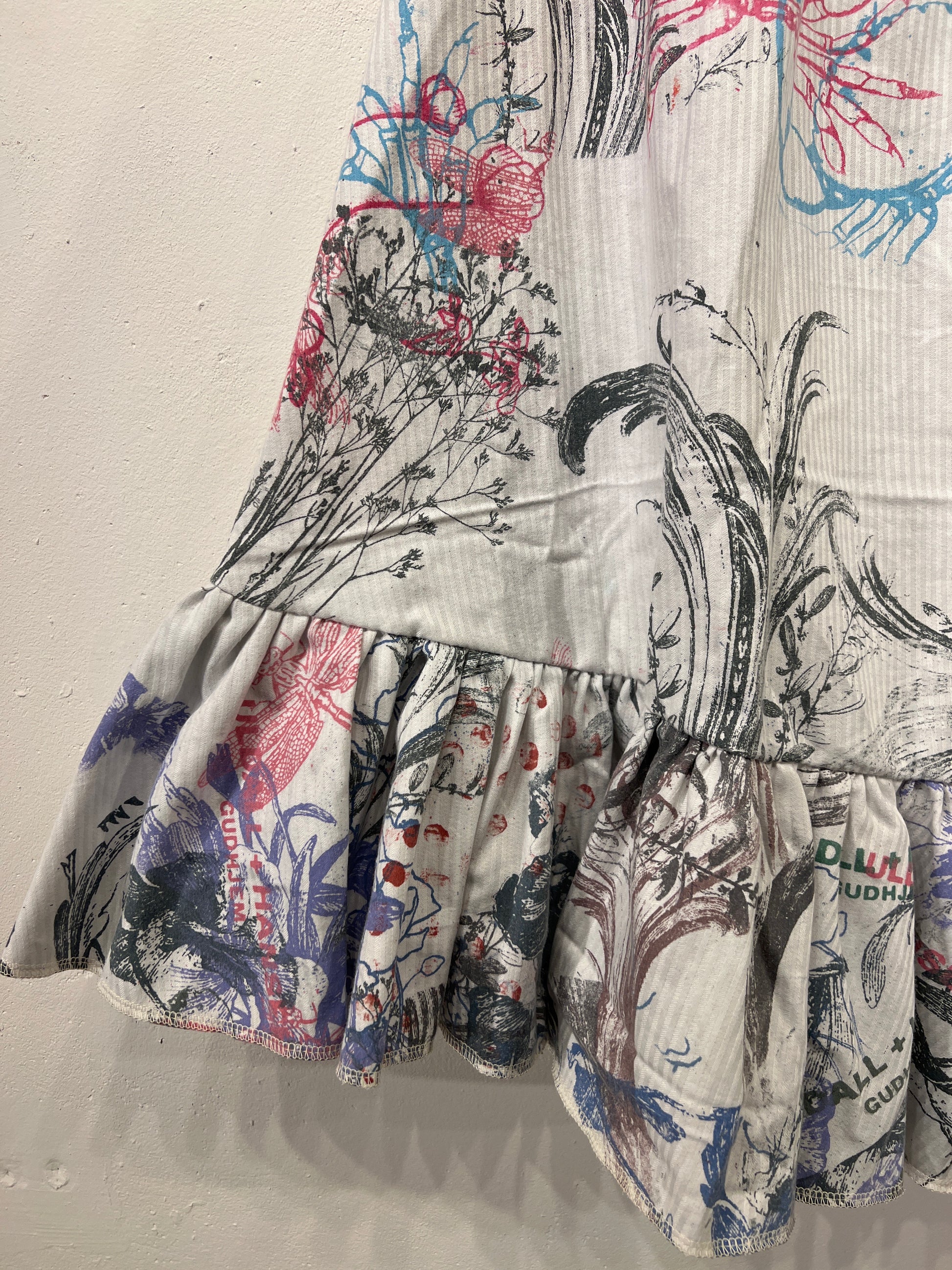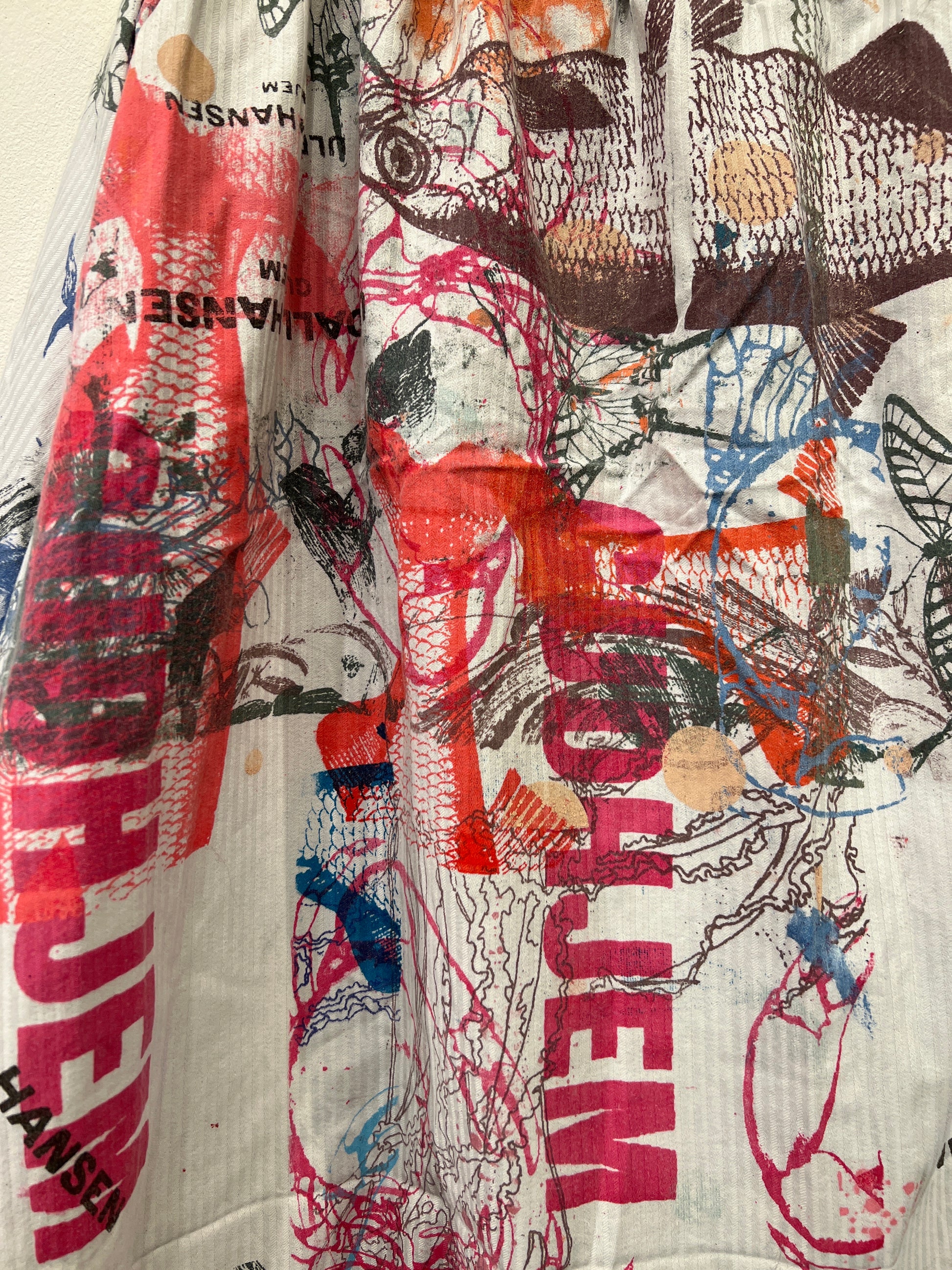 Skøn justerbar nederdel med lommer, ca længde 88 cm. Syet af upcyclede duge med unika håndtryk