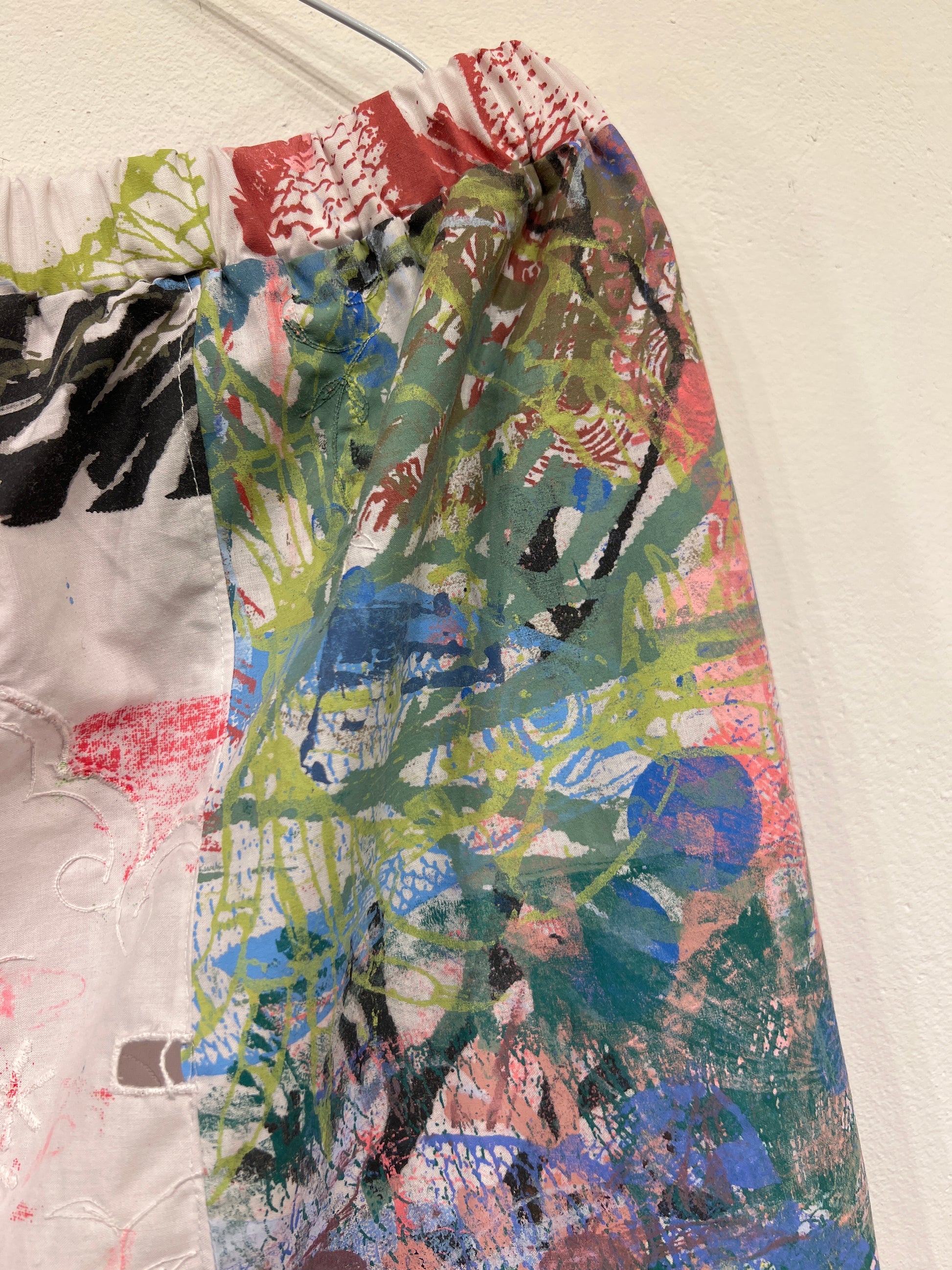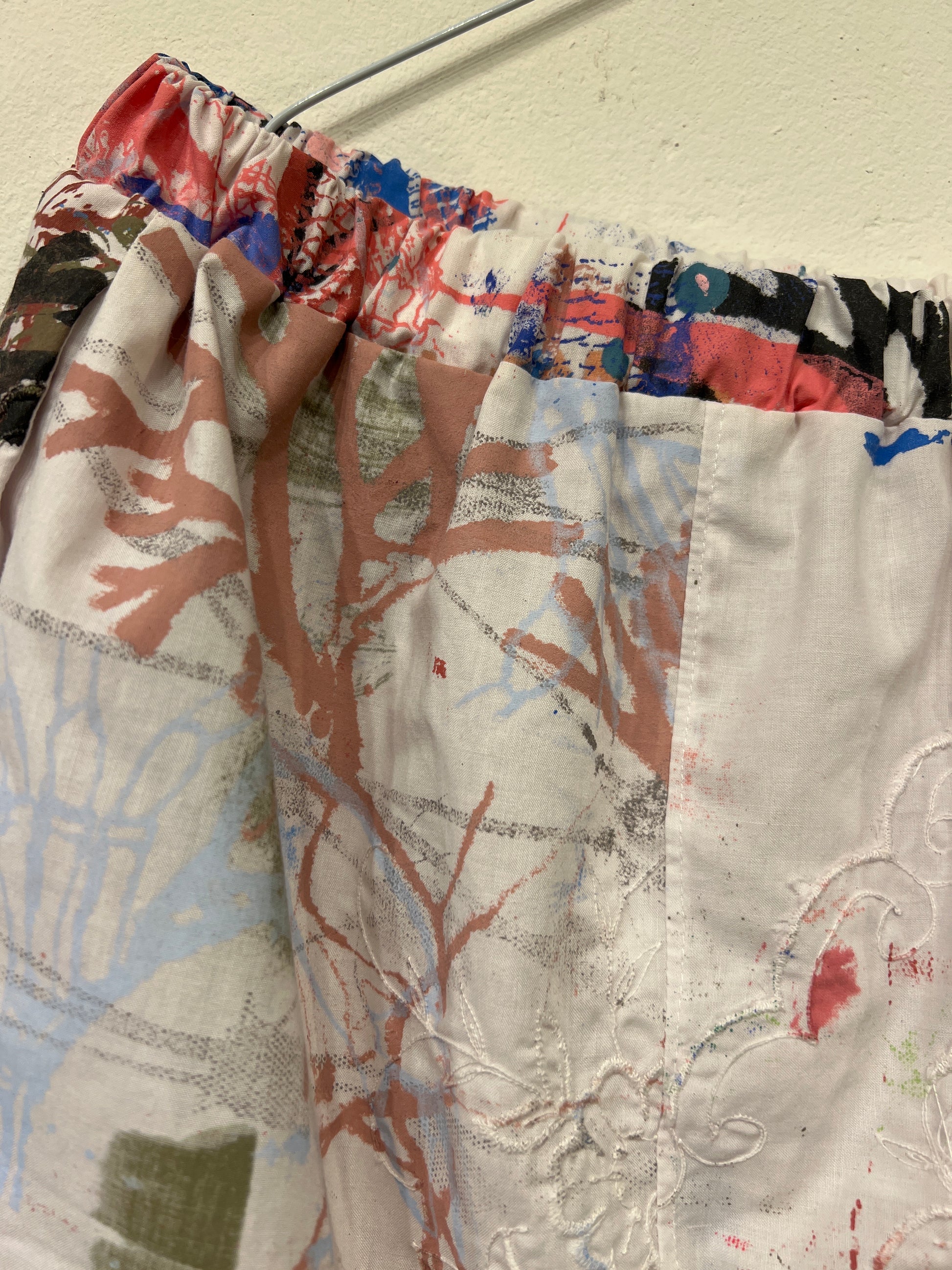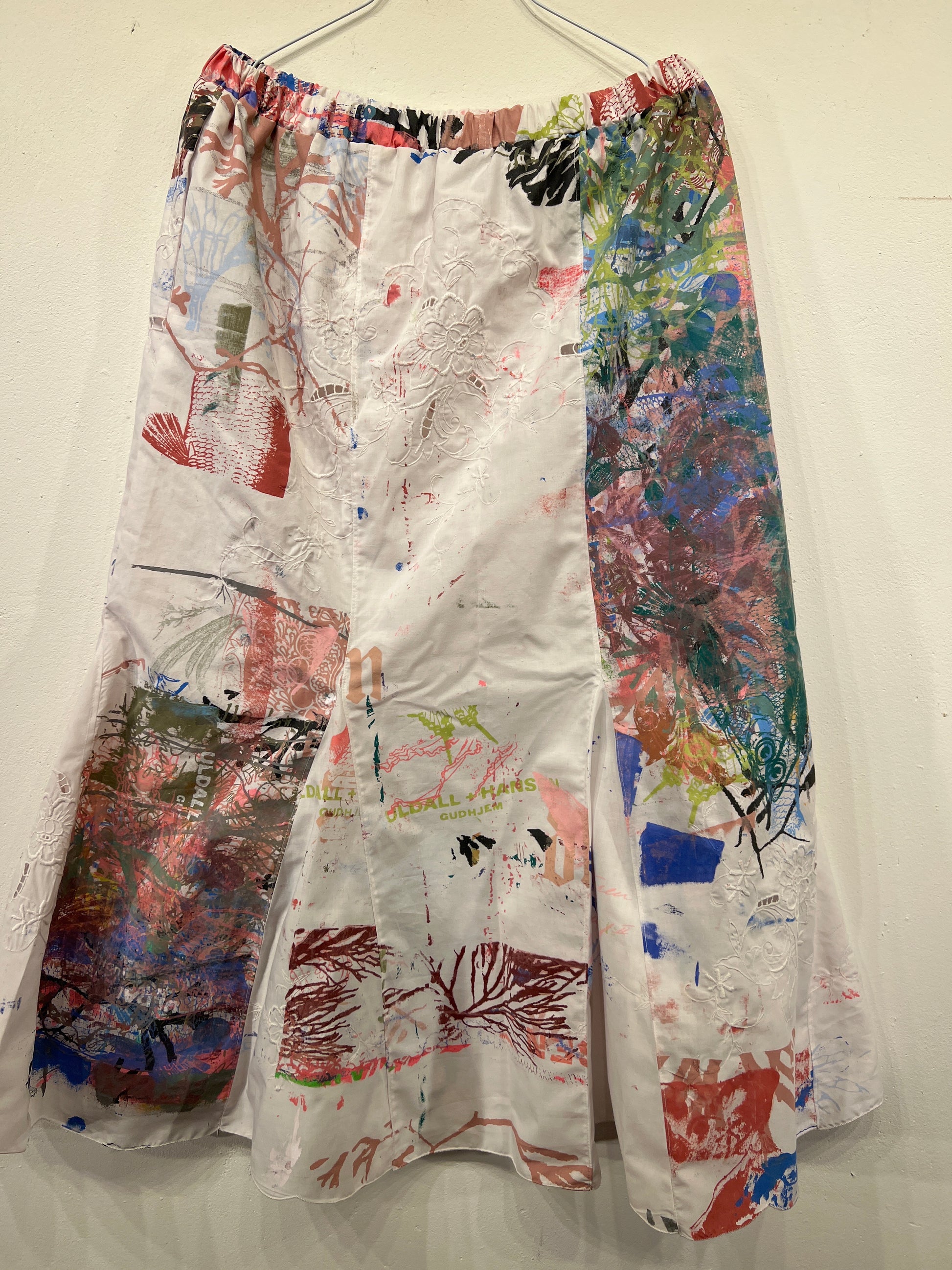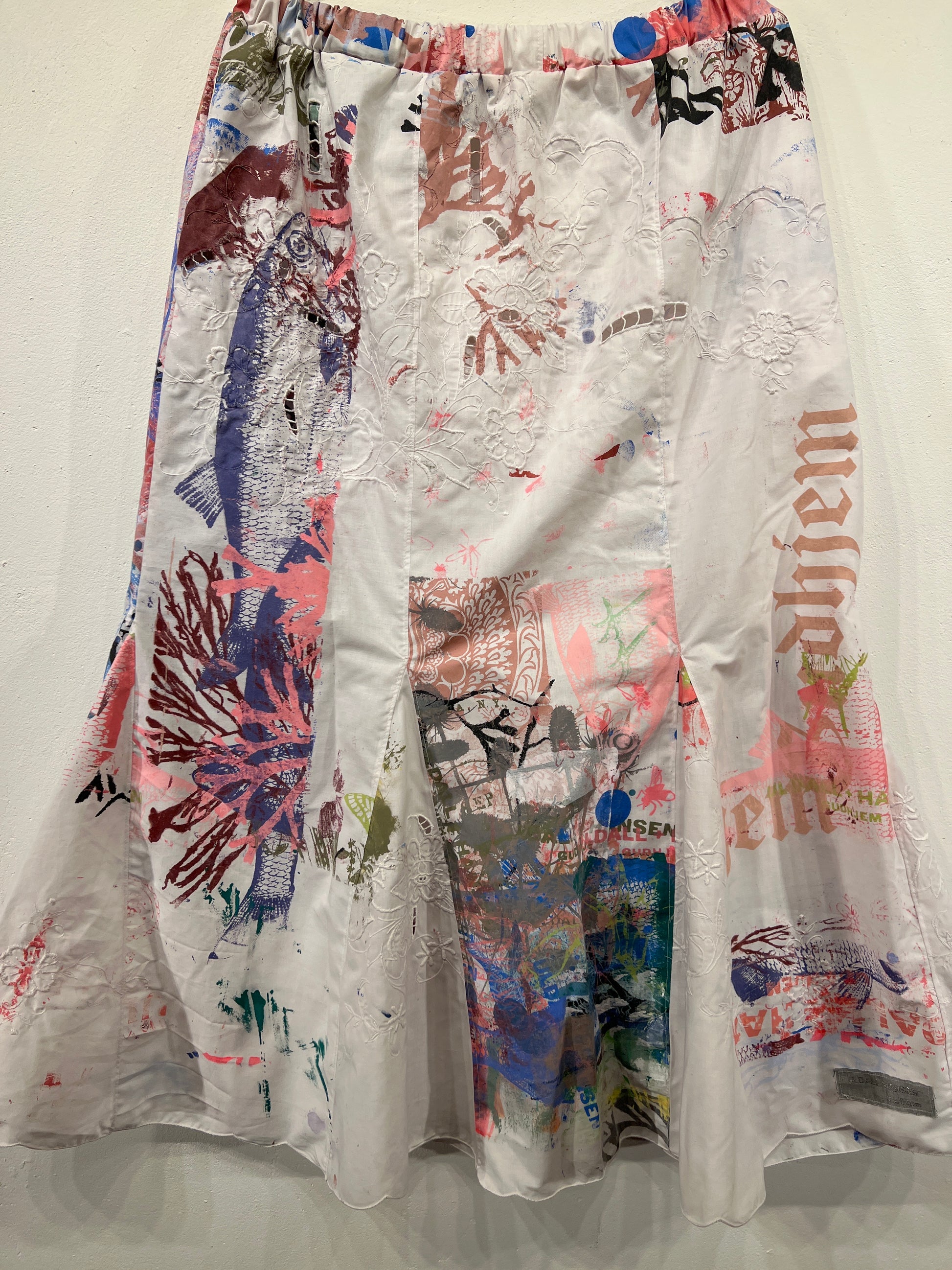 Skøn justerbar nederdel med lommer, ca længde 88 cm. Syet af upcyclede duge med unika håndtryk