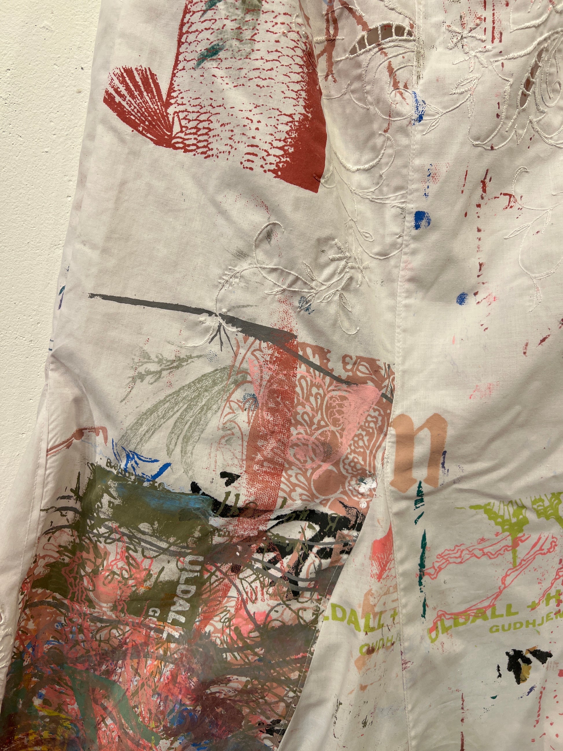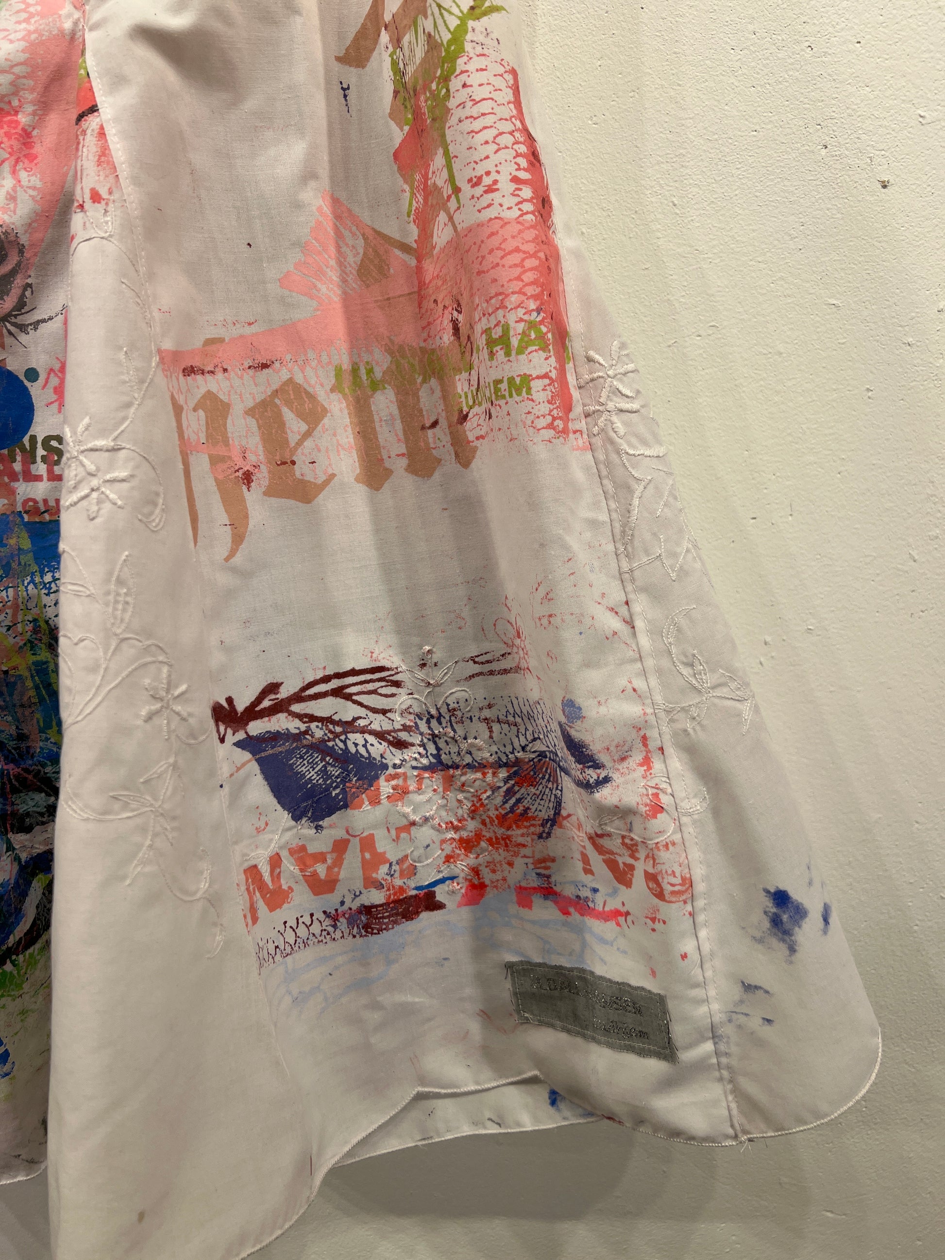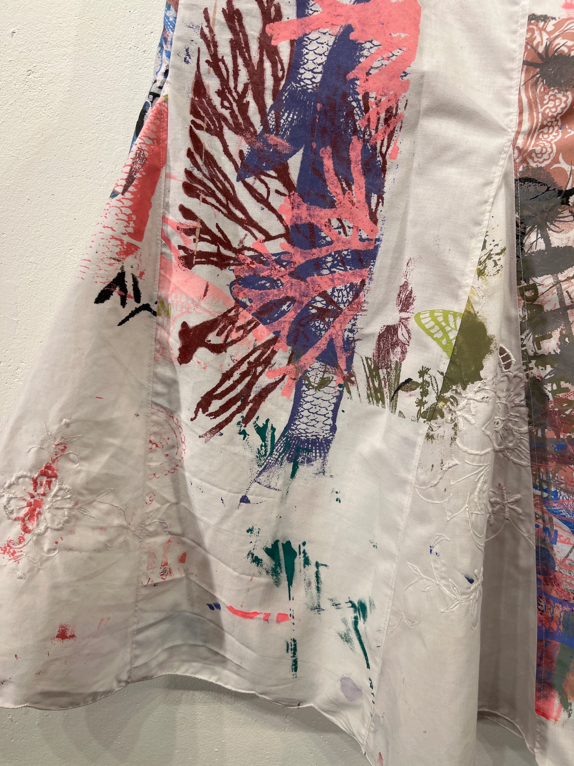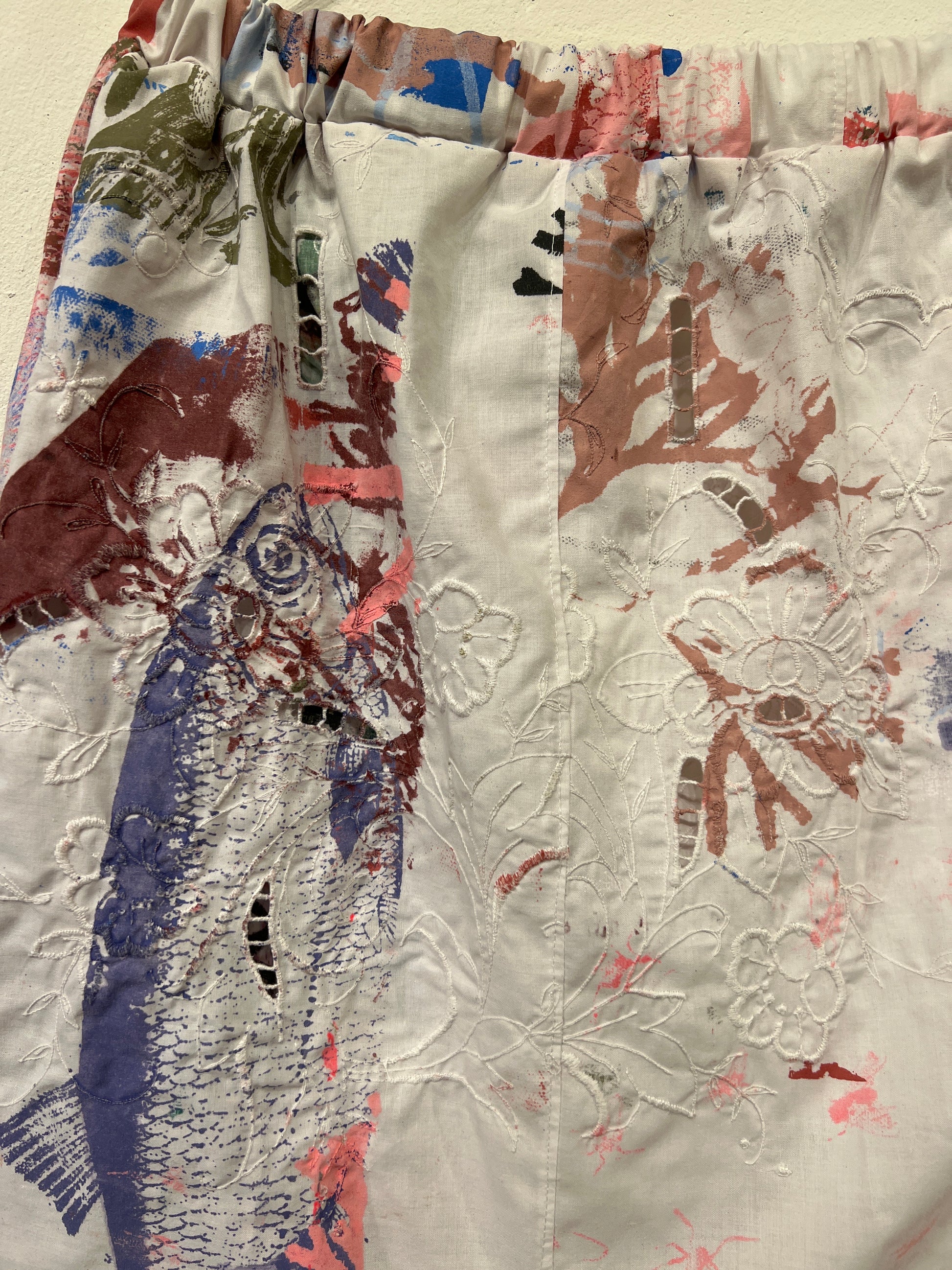 Skøn justerbar nederdel med lommer, ca længde 88 cm. Syet af upcyclede duge med unika håndtryk