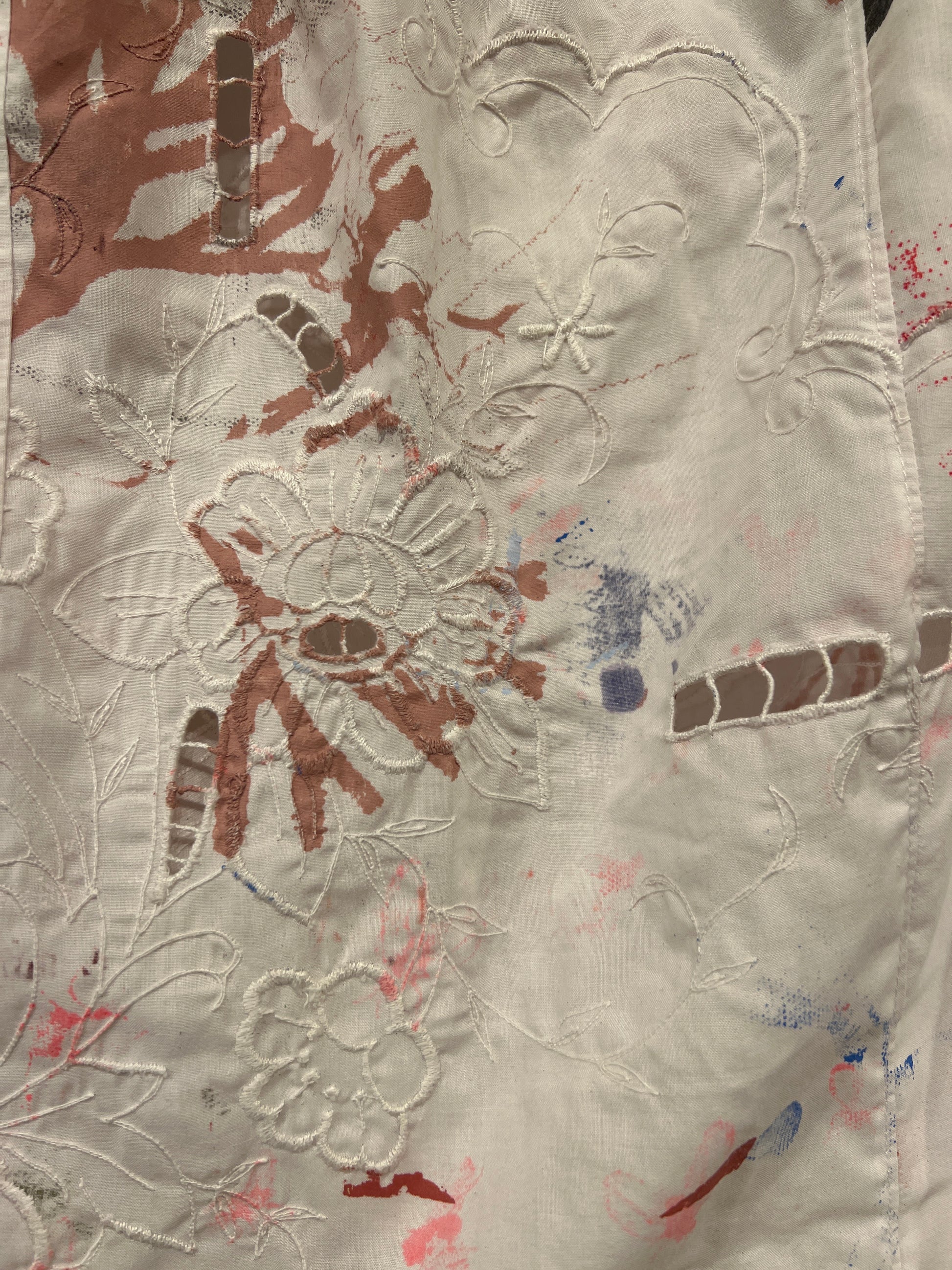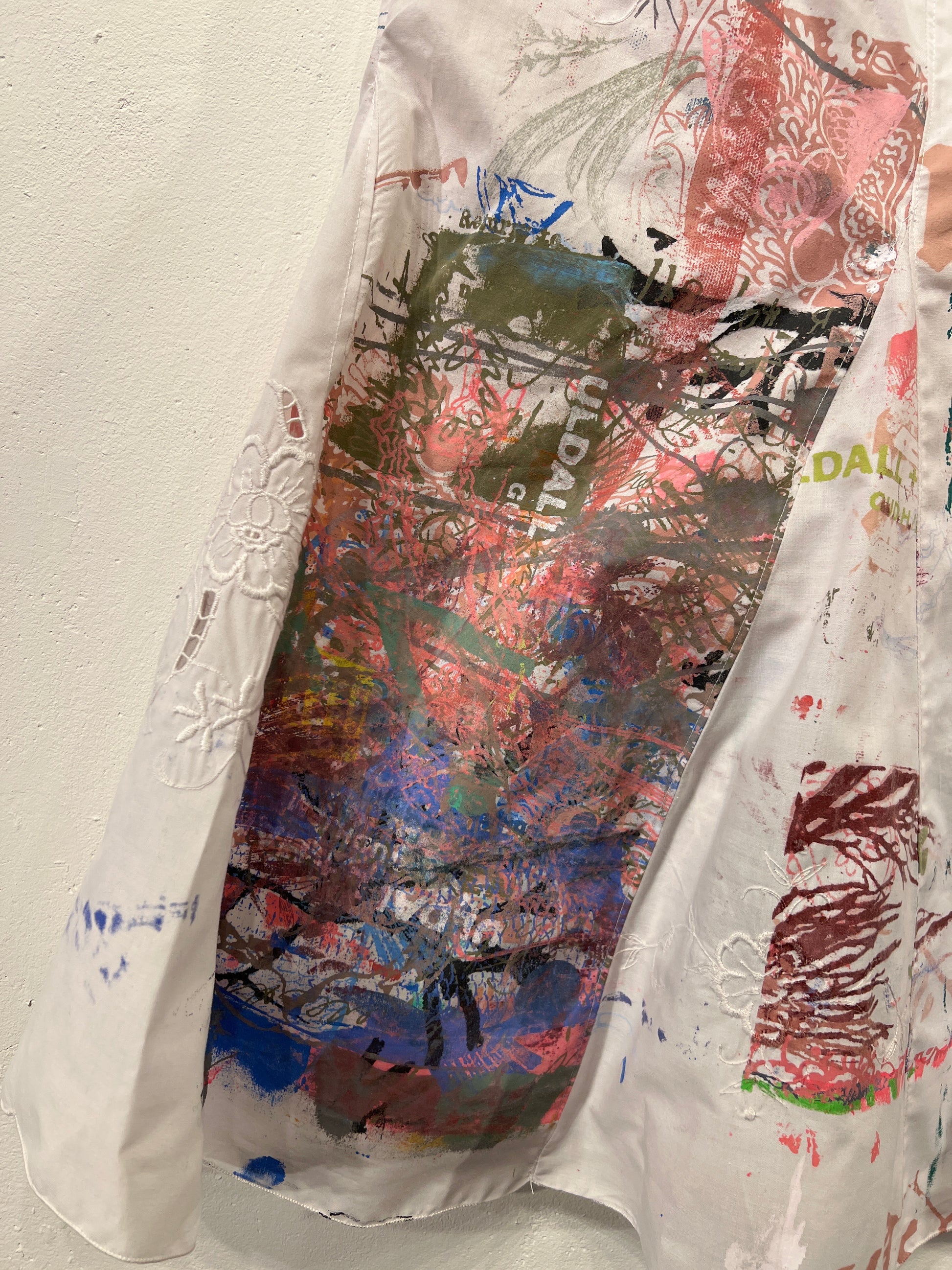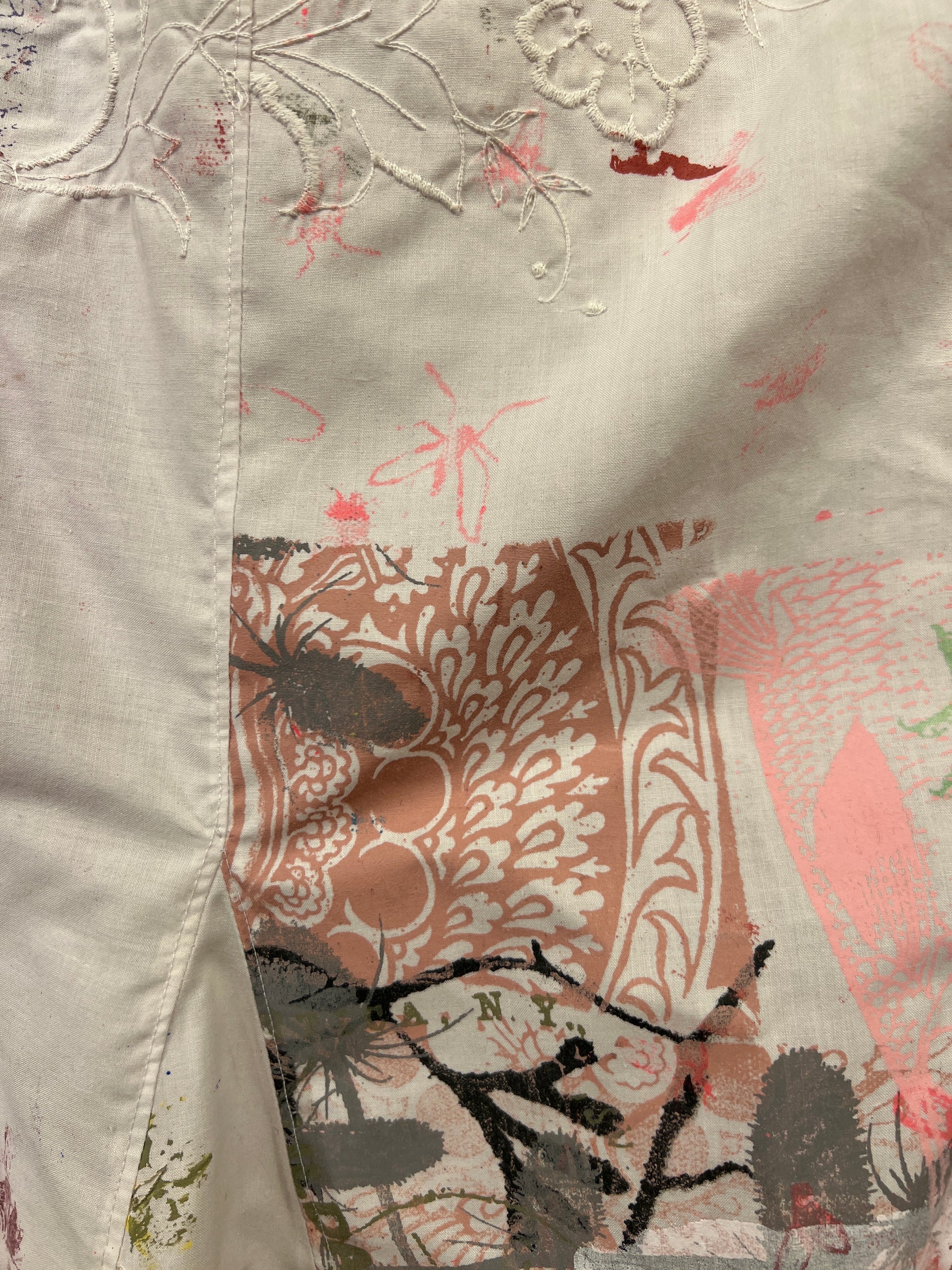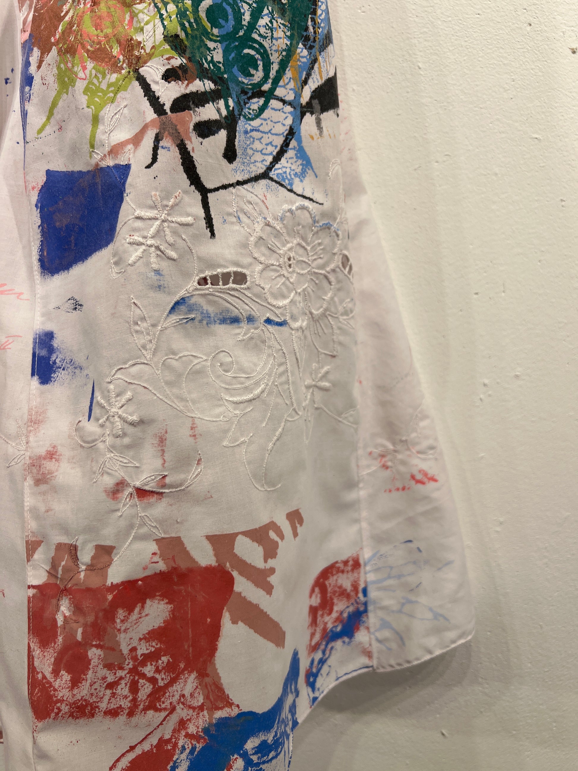 Skøn justerbar nederdel med lommer, ca længde 88 cm. Syet af upcyclede duge med unika håndtryk