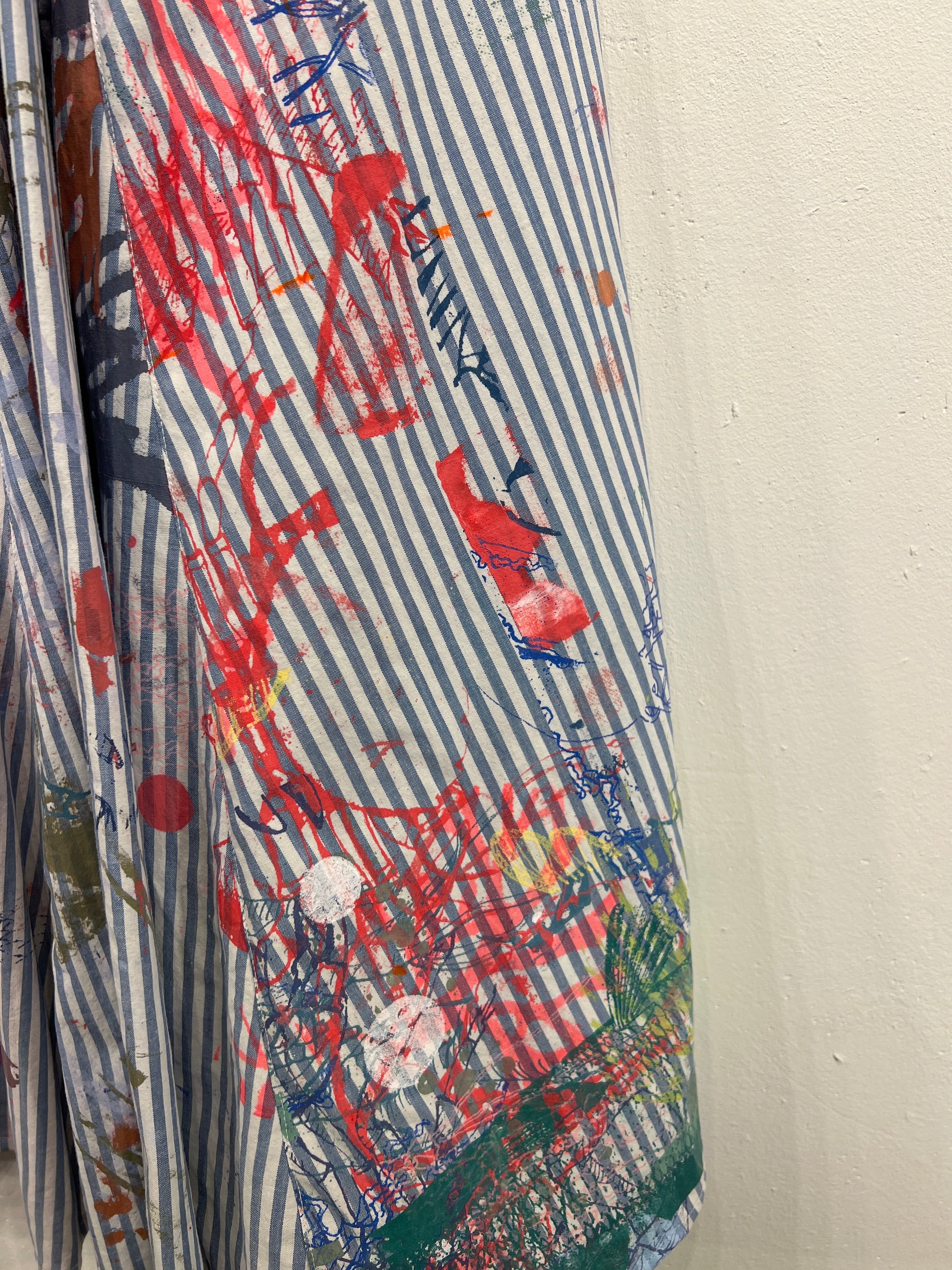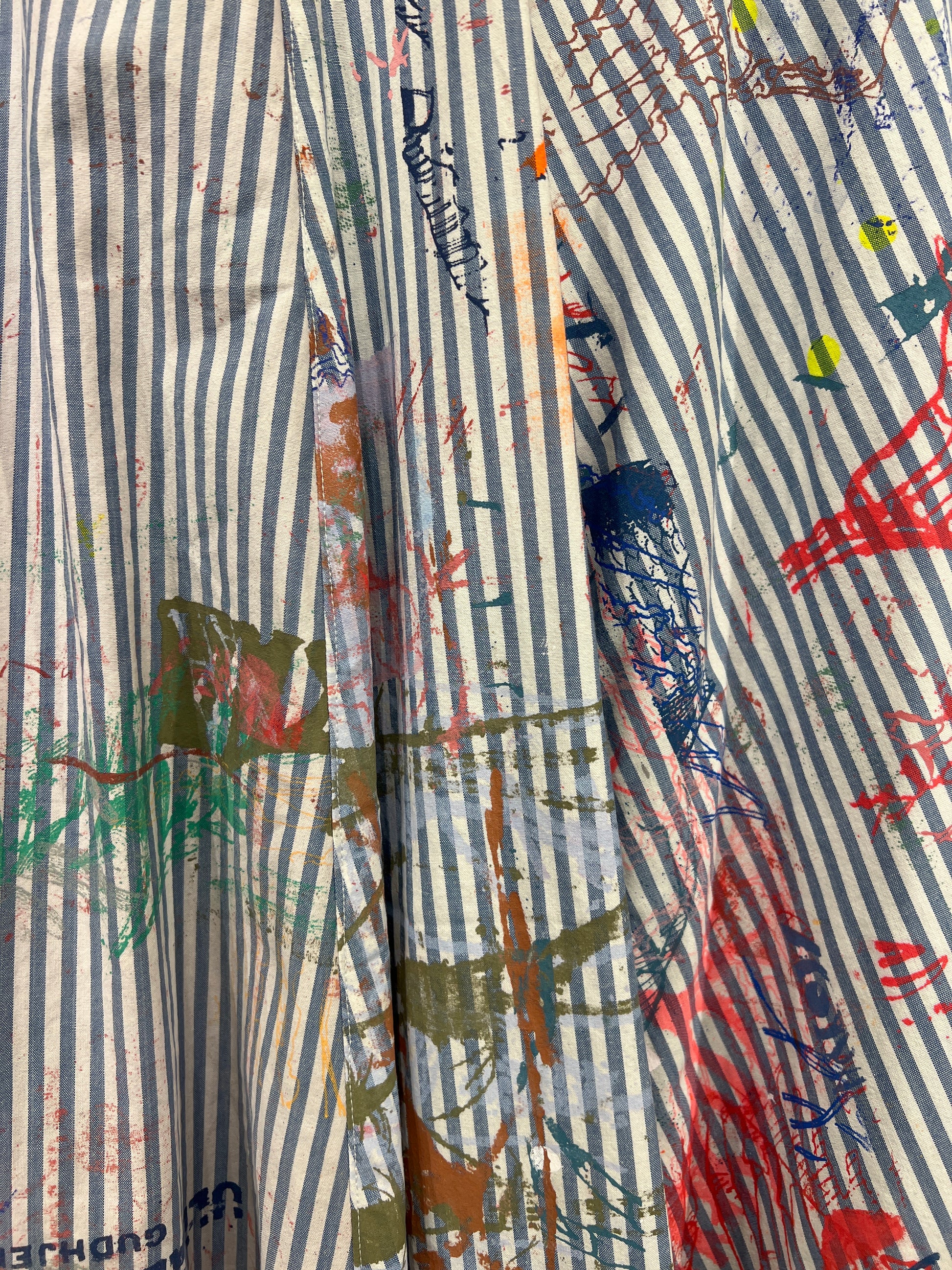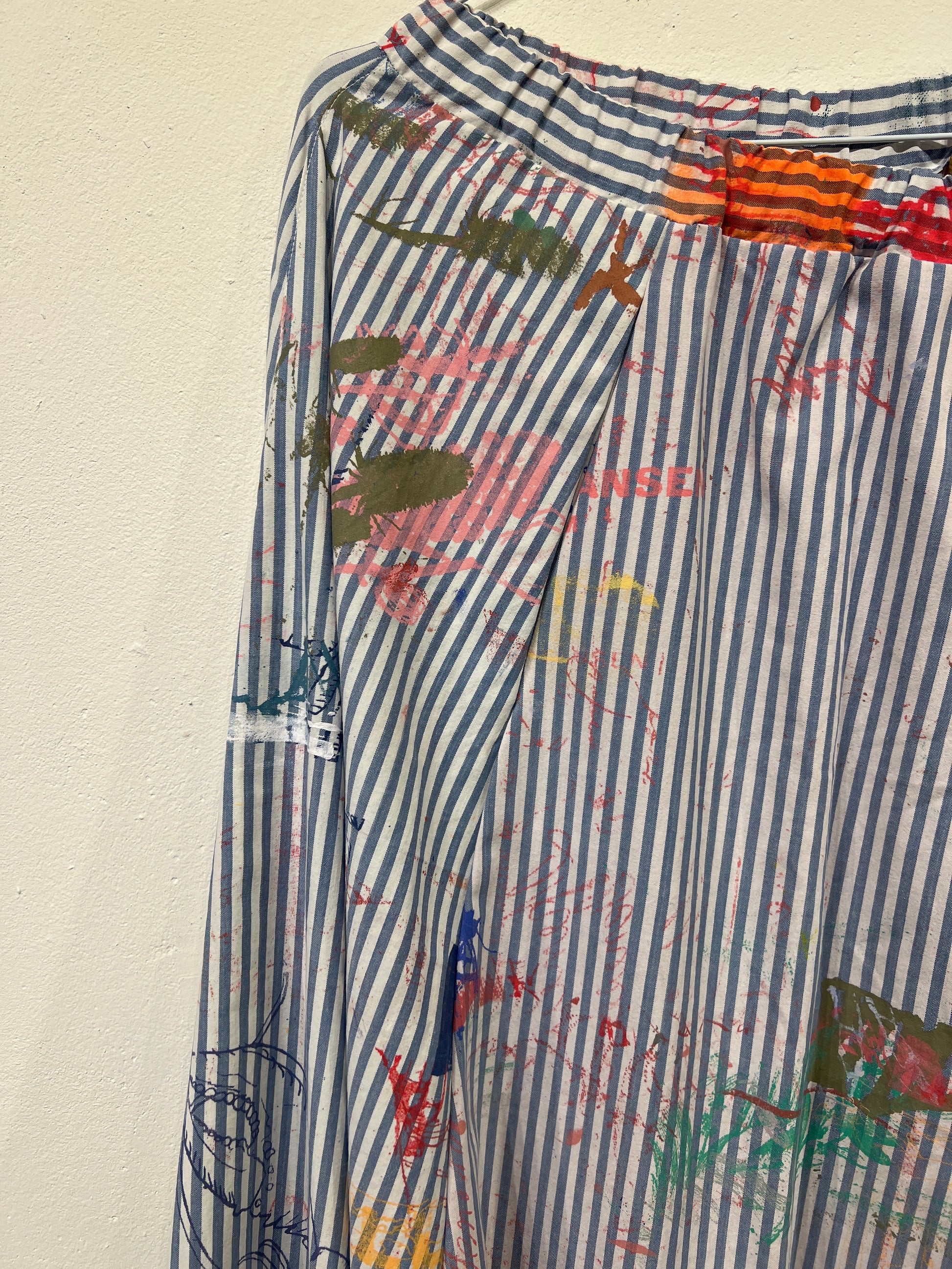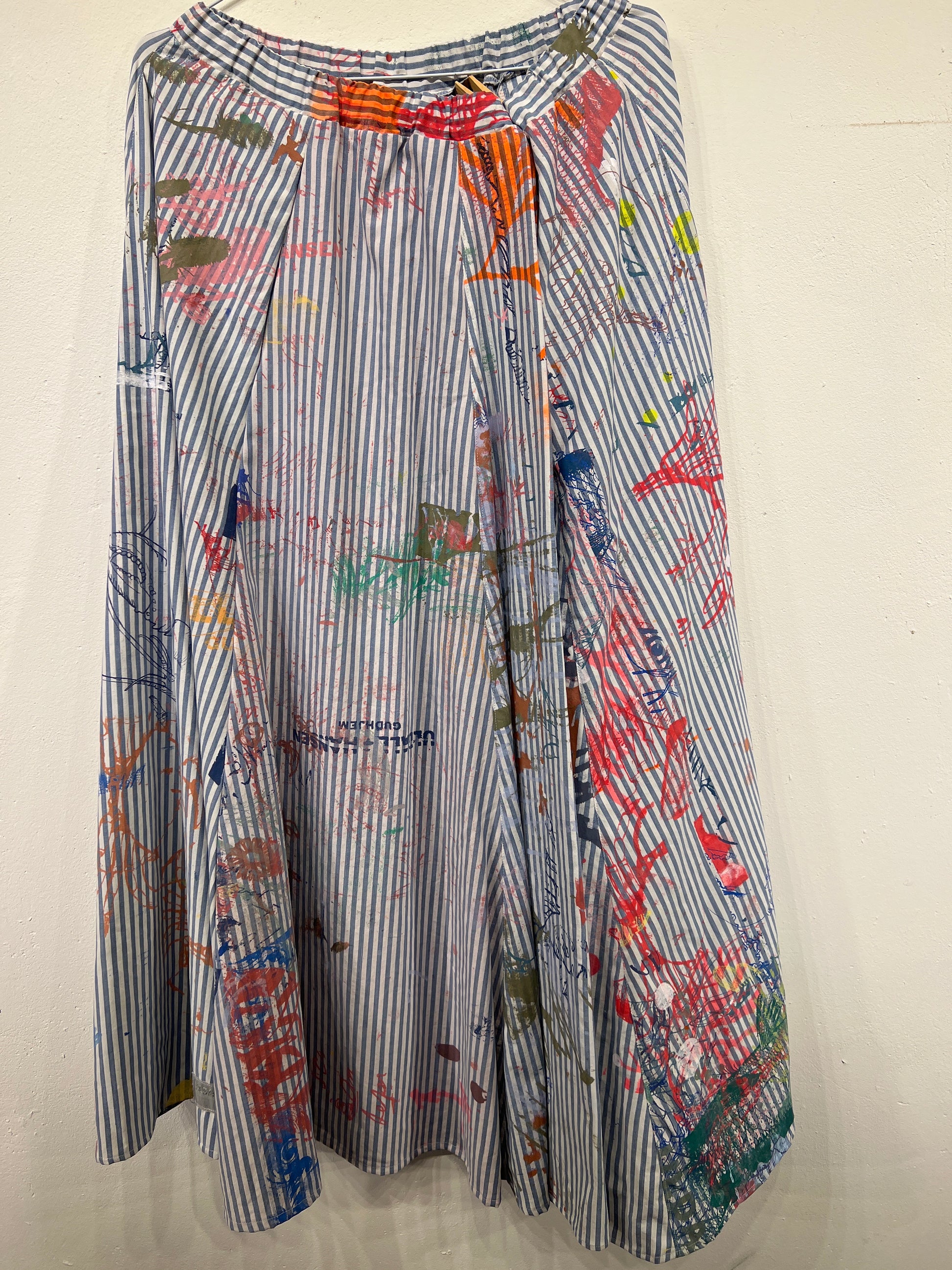 Skøn justerbar nederdel med lommer, ca længde 88 cm. Syet af upcyclede duge med unika håndtryk