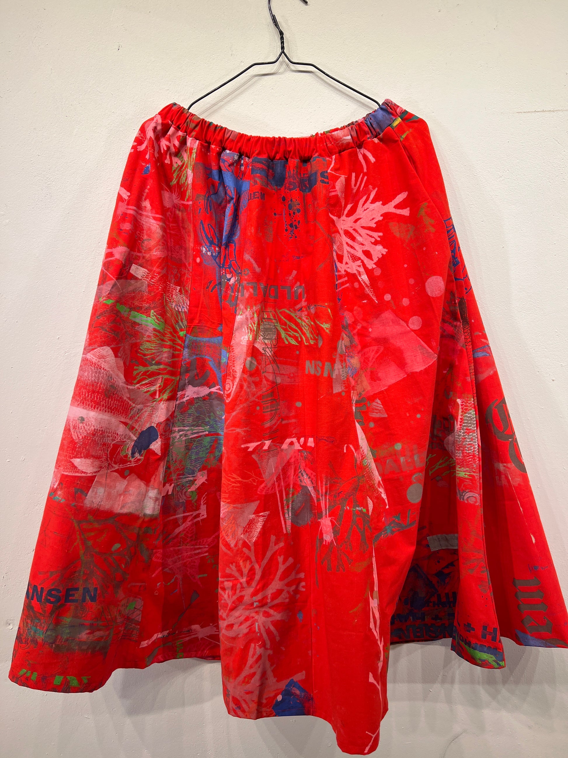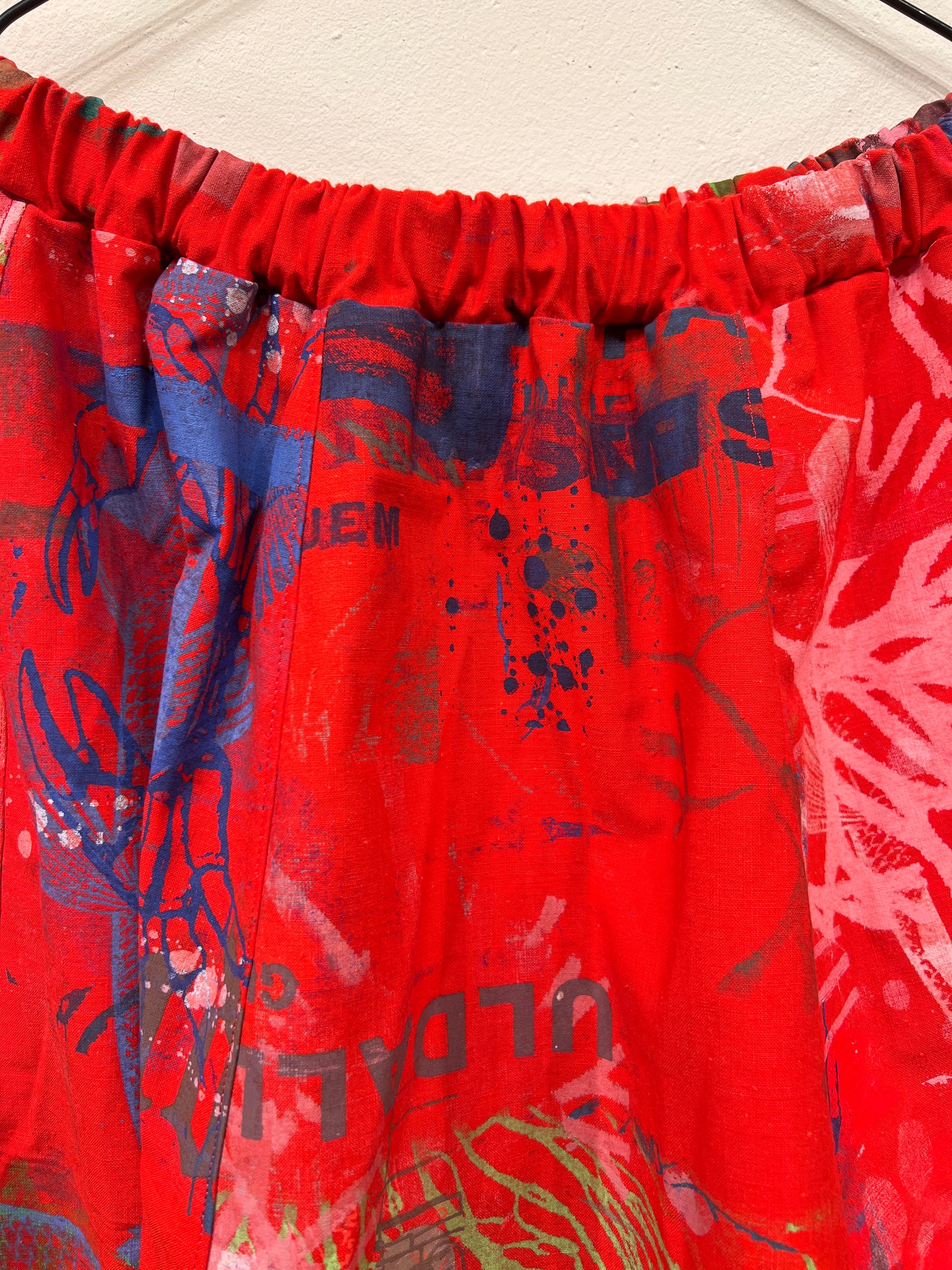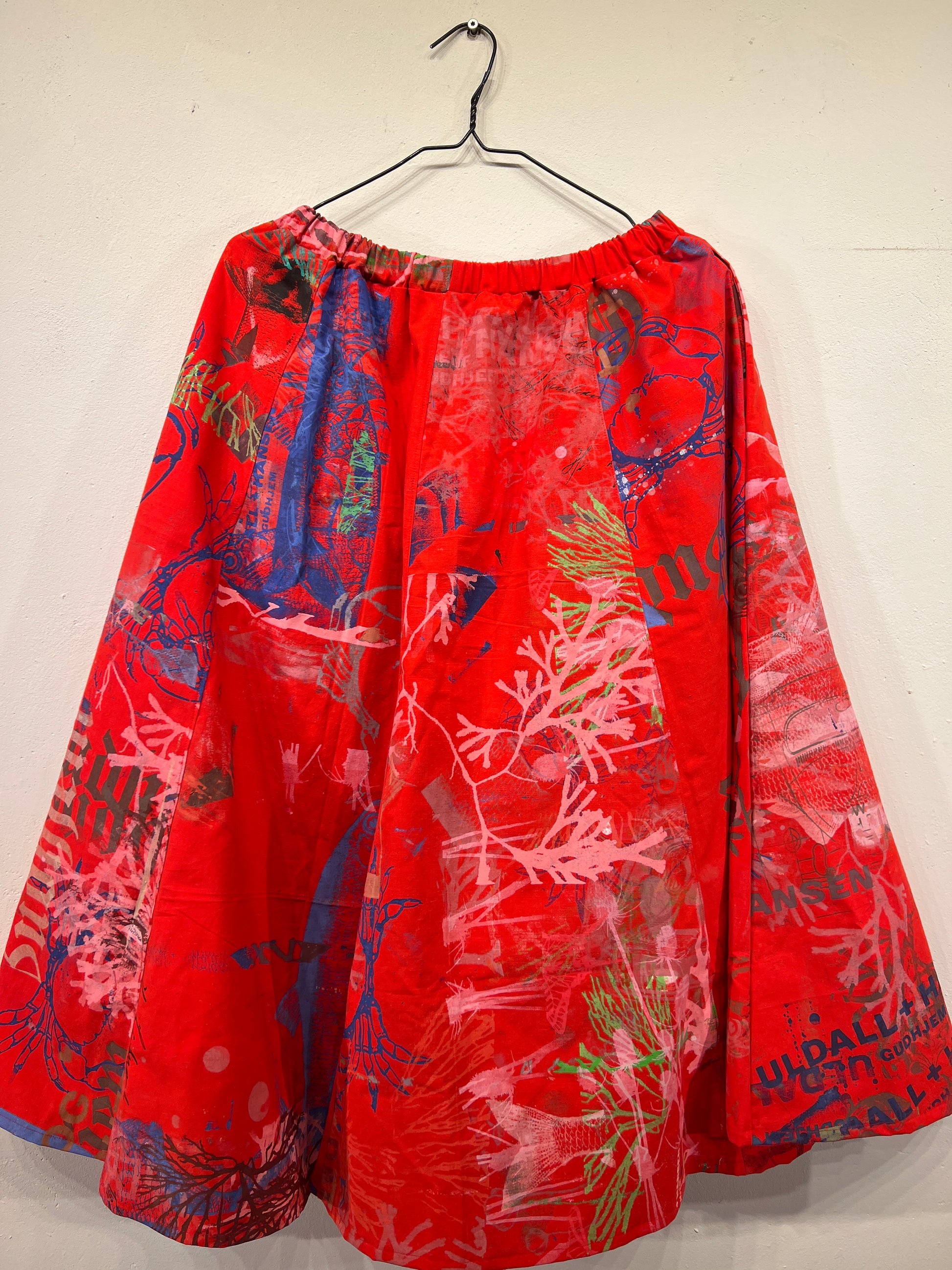 Skøn justerbar nederdel med lommer, ca længde 88 cm. Syet af upcyclede duge med unika håndtryk