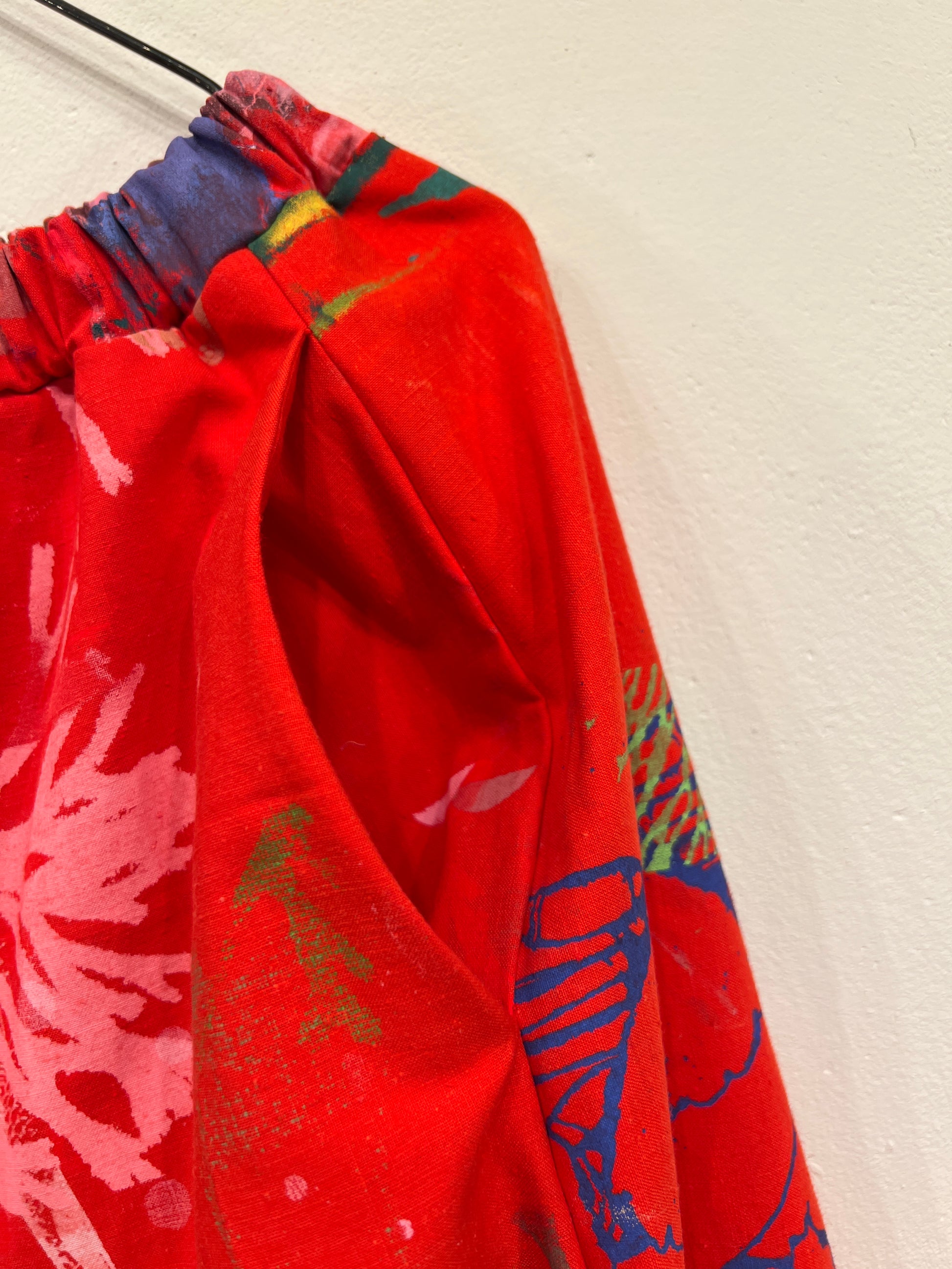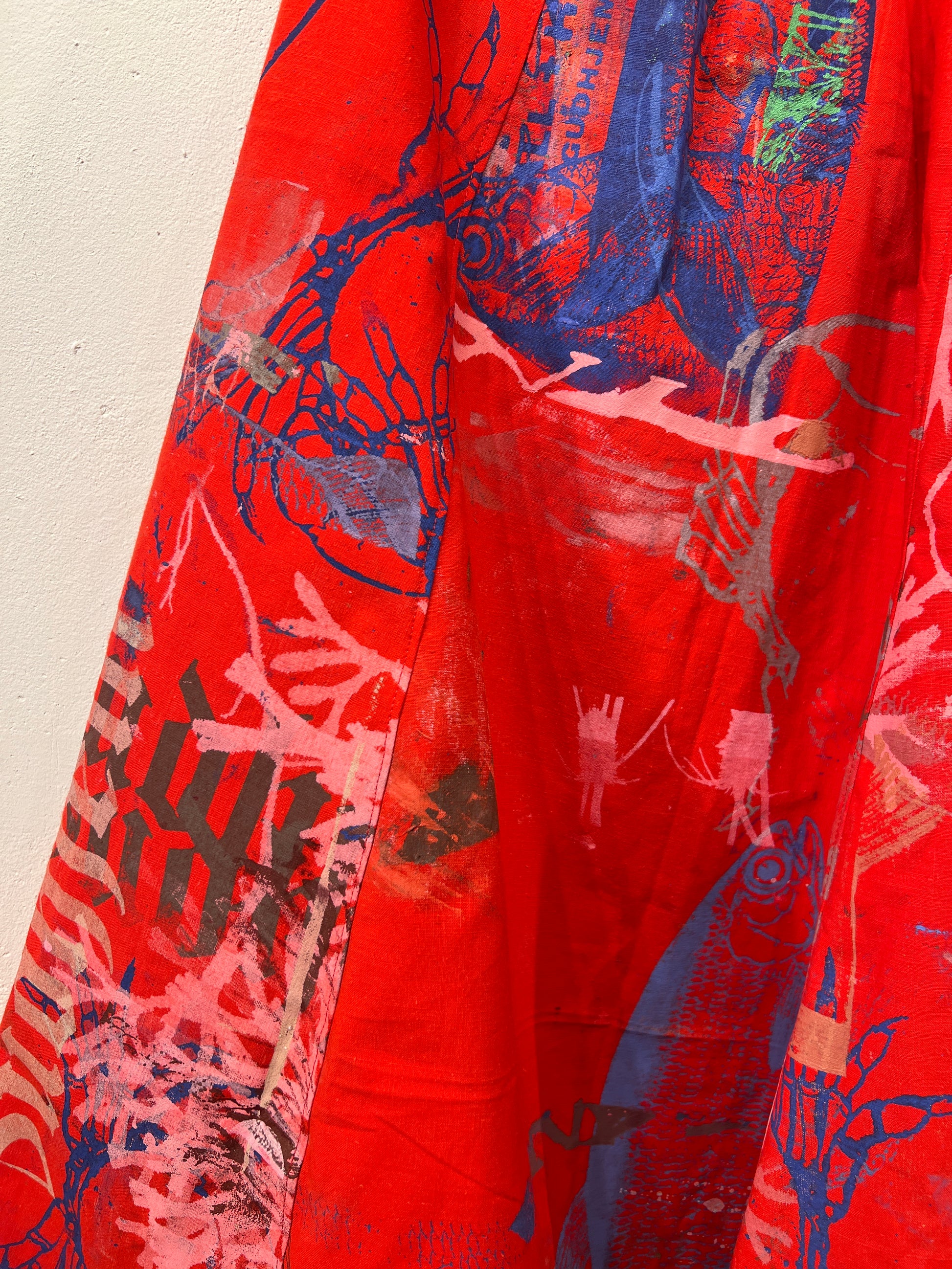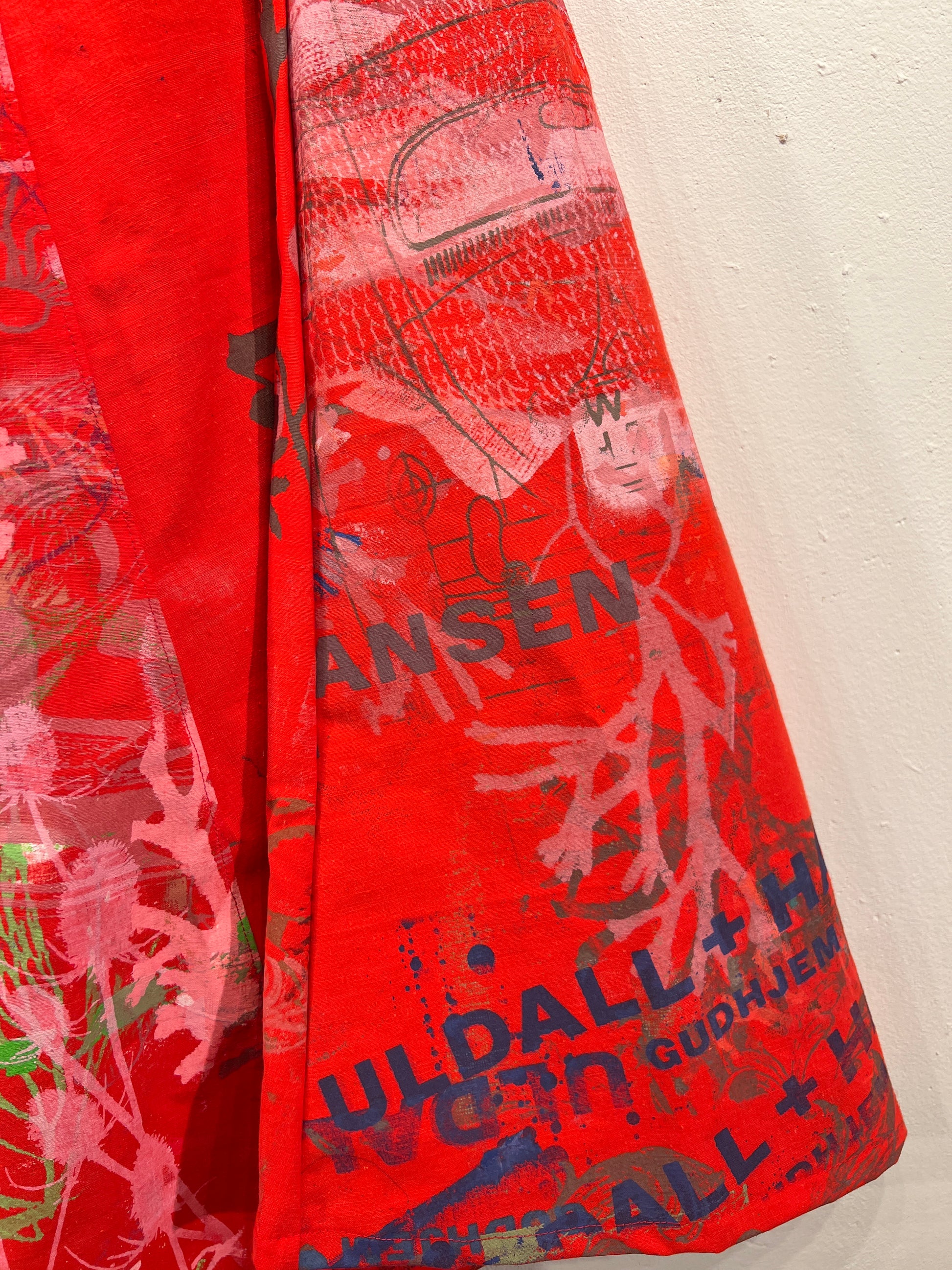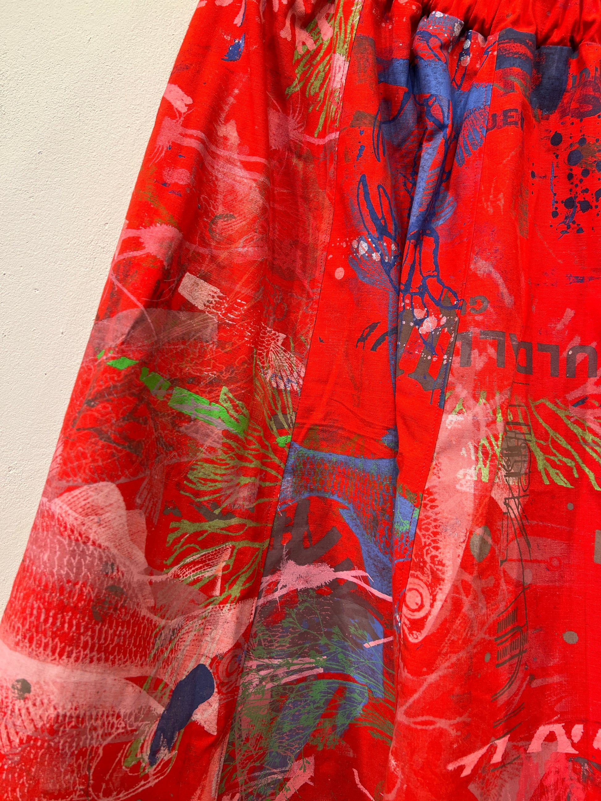 Skøn justerbar nederdel med lommer, ca længde 88 cm. Syet af upcyclede duge med unika håndtryk