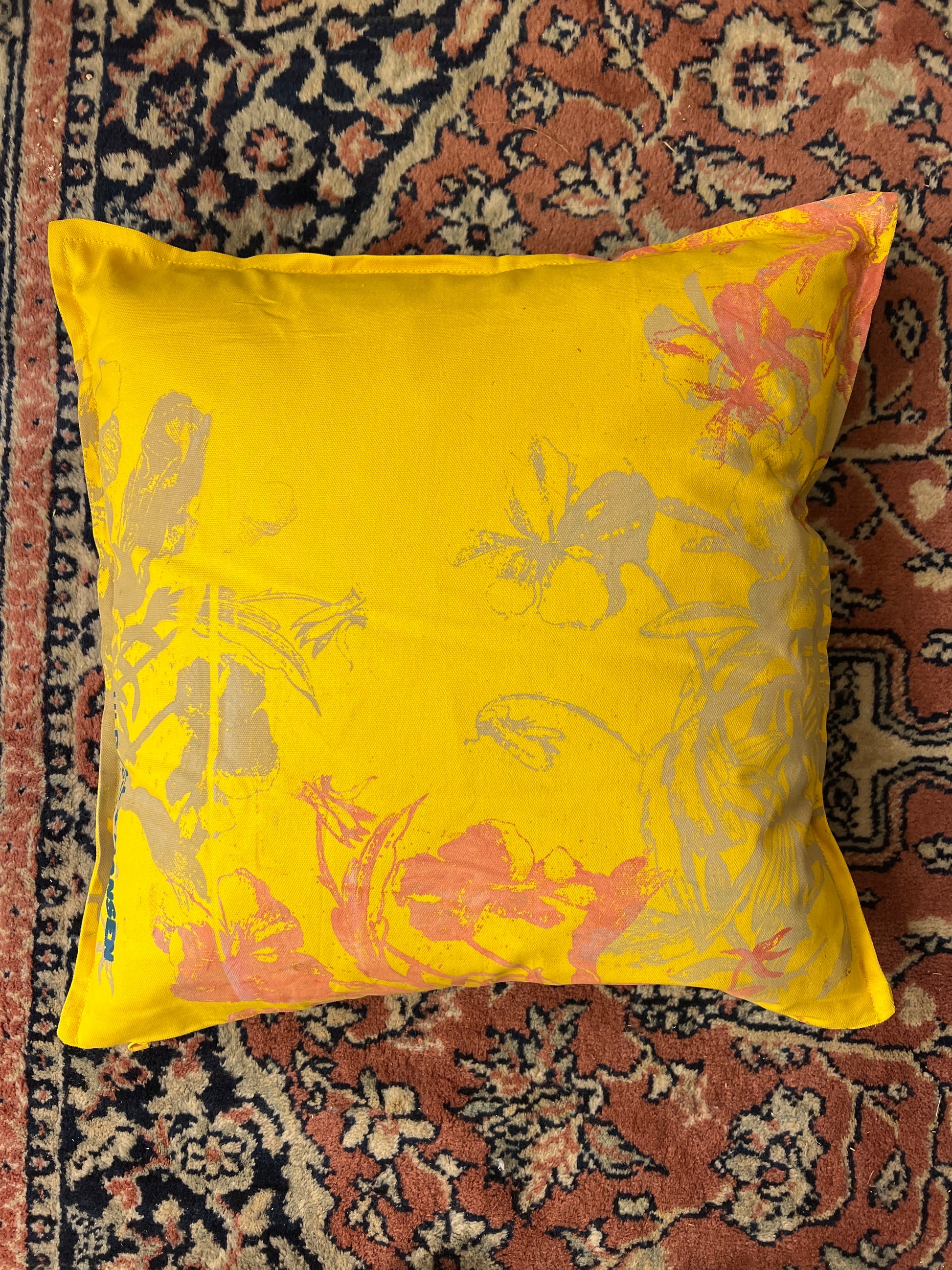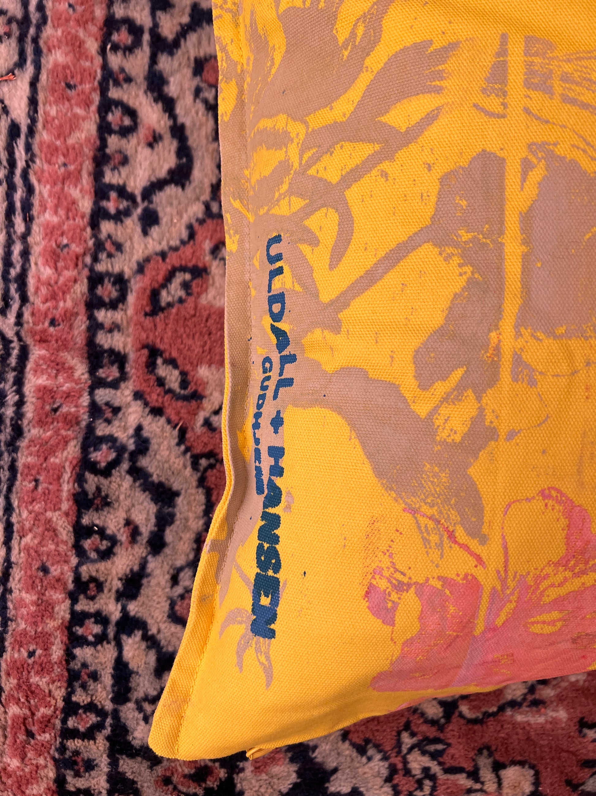 Håndtrykte pude på lækker bomuld. Har to forskellige sidder. Mål: 50x50 cm