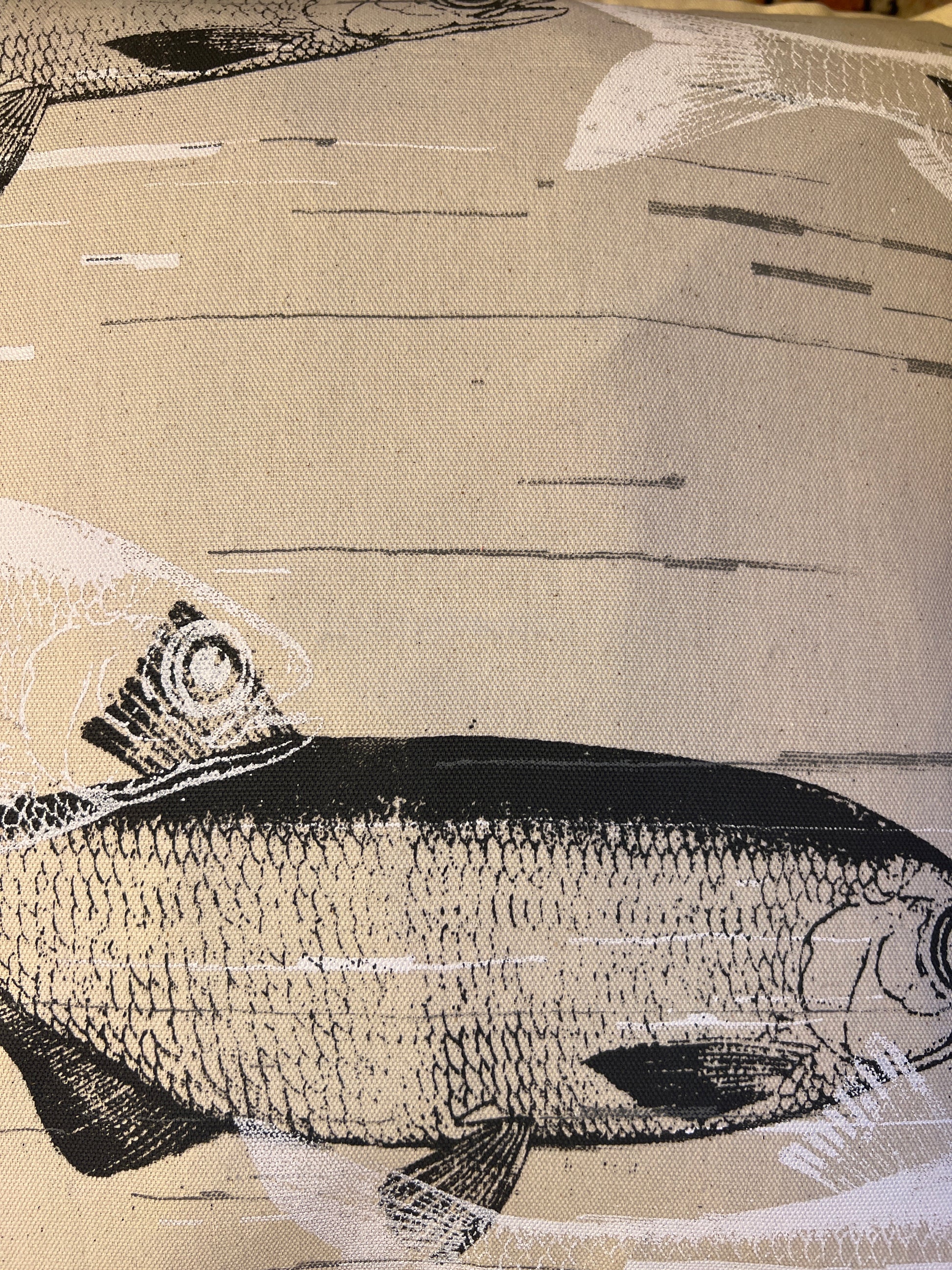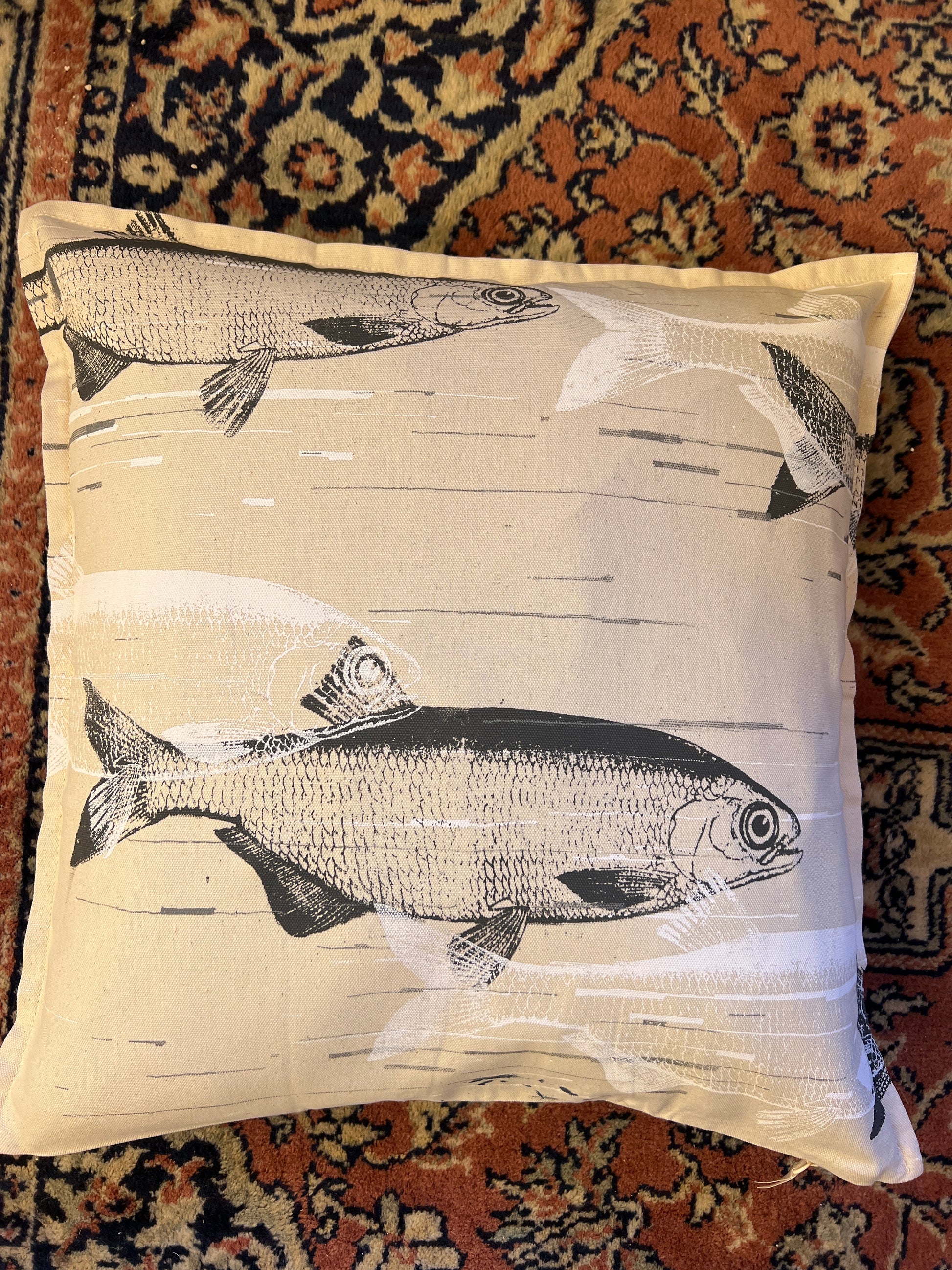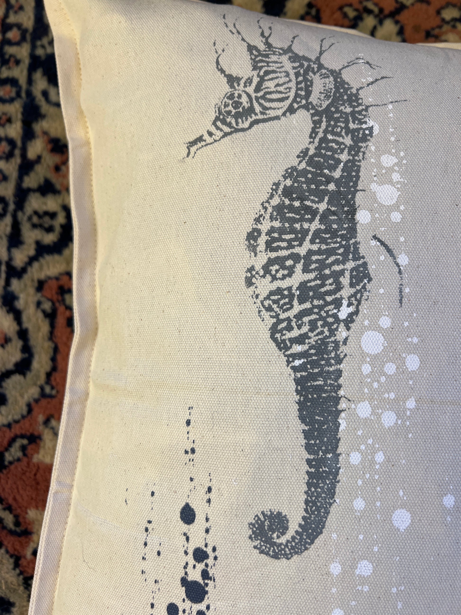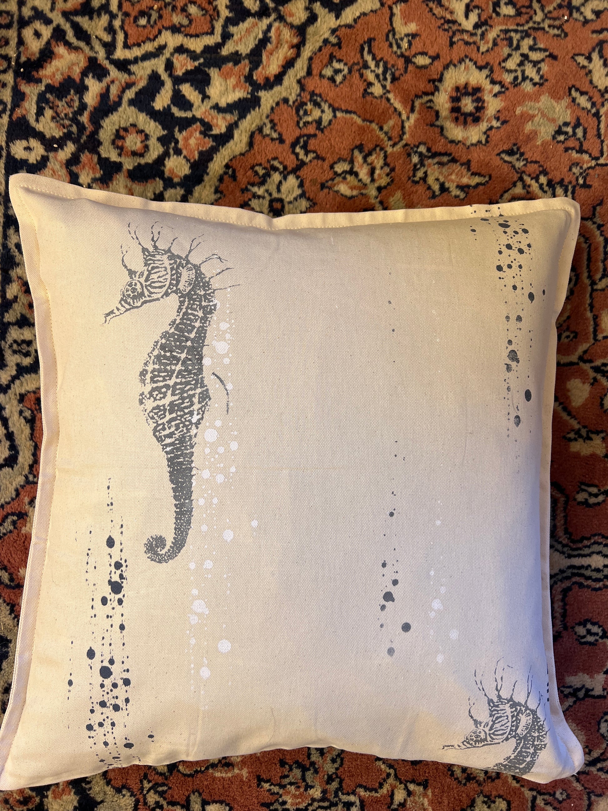 Håndtrykte pude på lækker bomuld. Har to forskellige sidder. Mål: 50x50 cm
